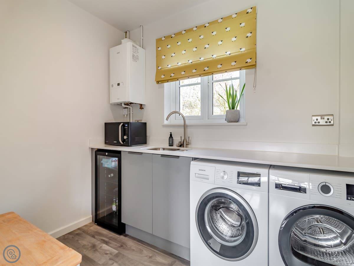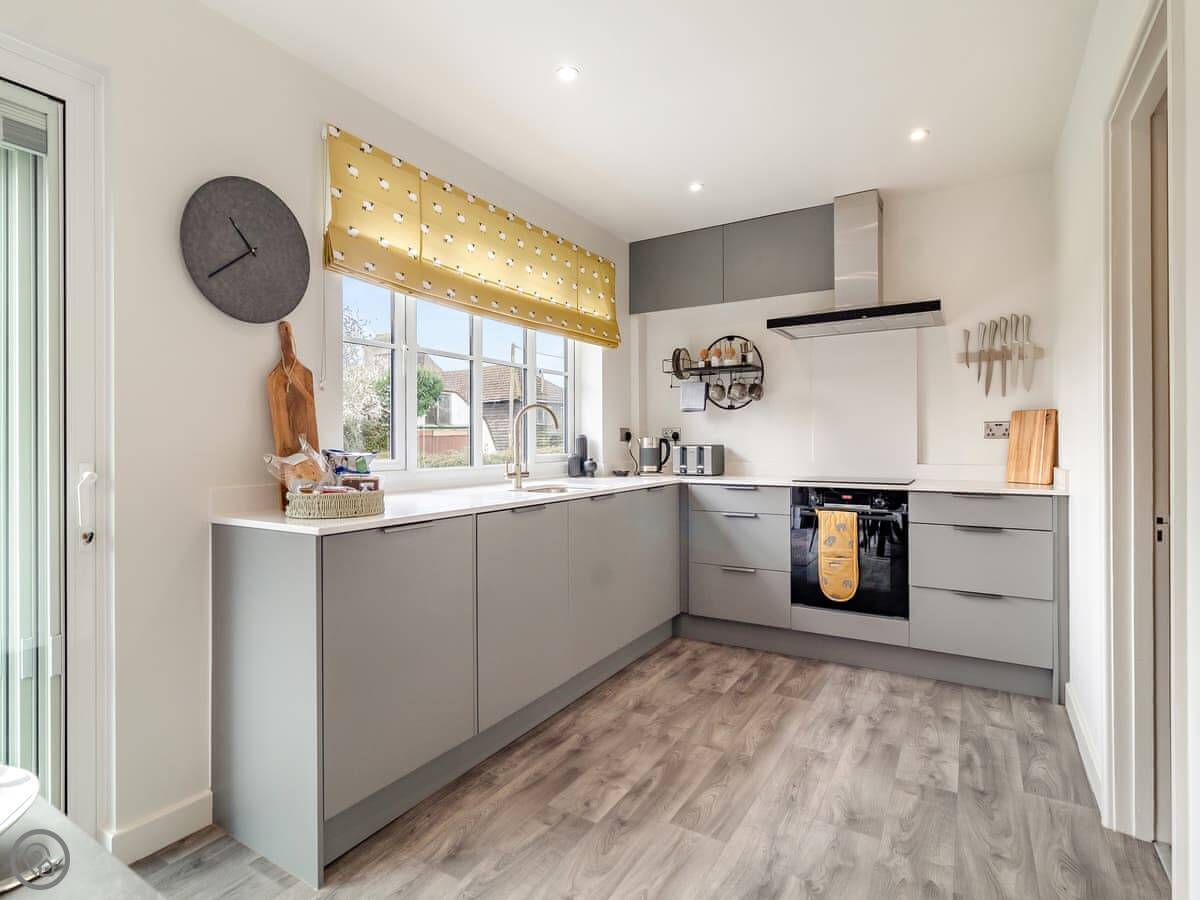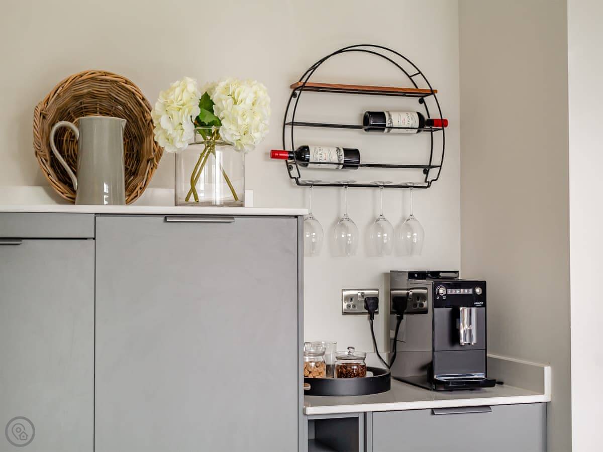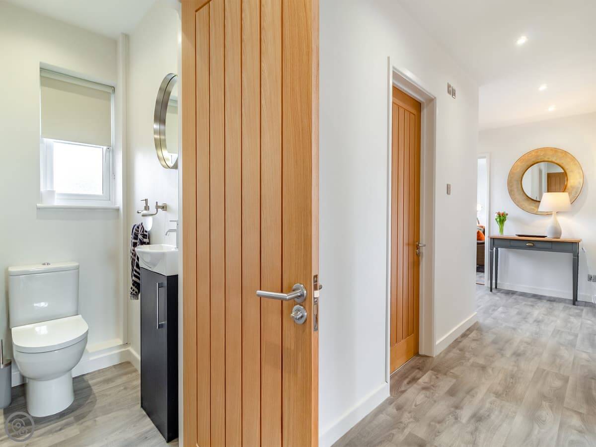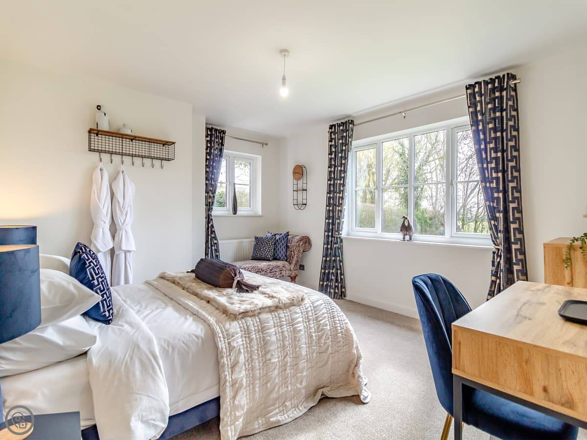 The garden is a good size, enclosed, with a patio and a lawn. There's a hot tub out there. The living room has doors that open onto it. You get a view over fields.