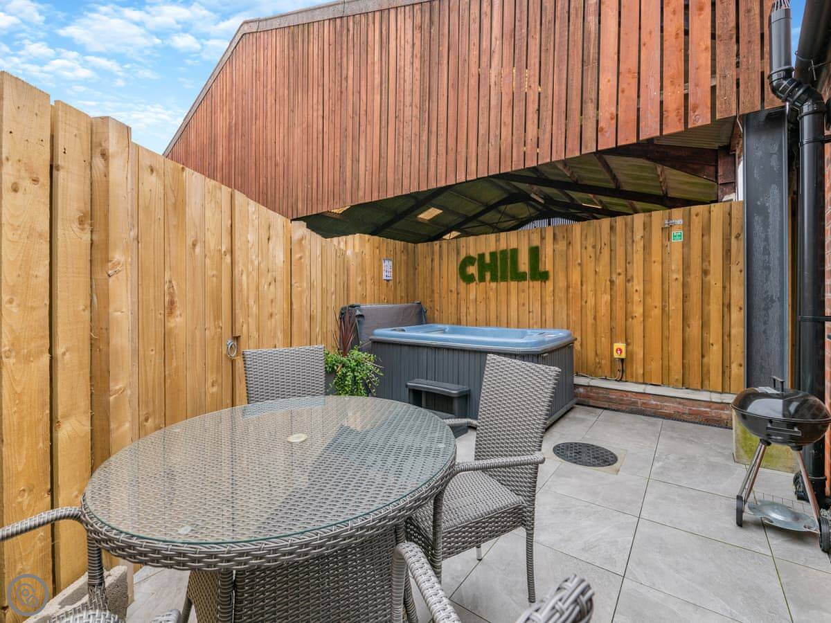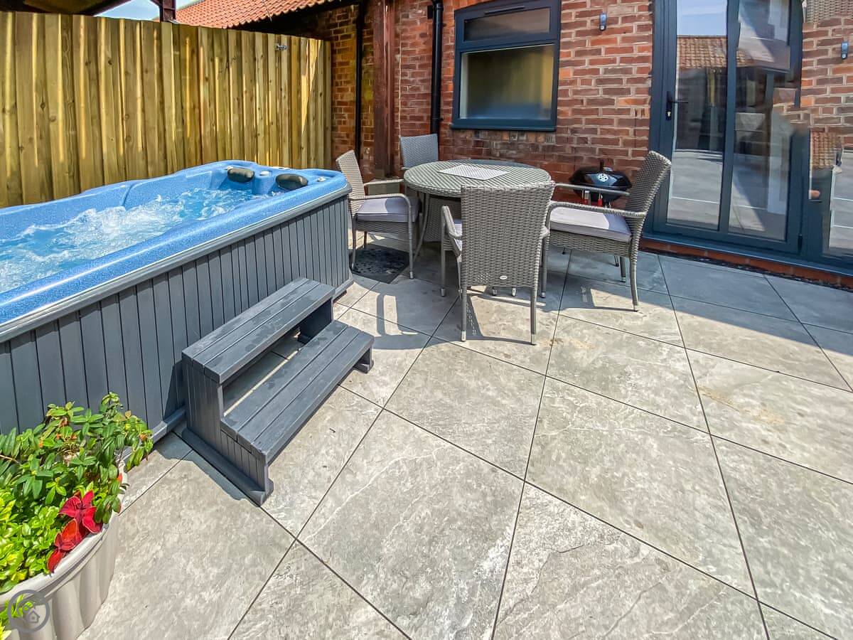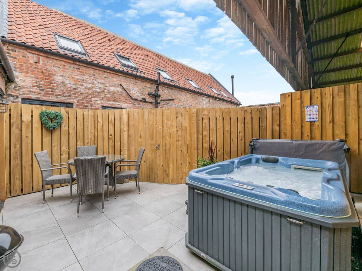 Outside, there's a private, enclosed courtyard with a table and chairs. It gets the morning sun. There's also a hot tub.