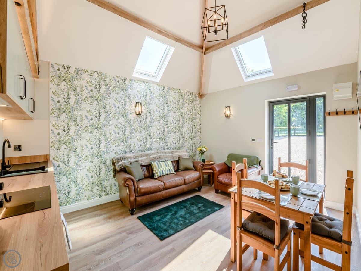 It sleeps four, in two bedrooms. One kingsize bed, two singles. Everything's on the ground floor. The main room is all open plan, with a kitchen, dining table, and sofa area. It's got high ceilings and beams. There's a smart TV. The bathroom has a walk-in shower.