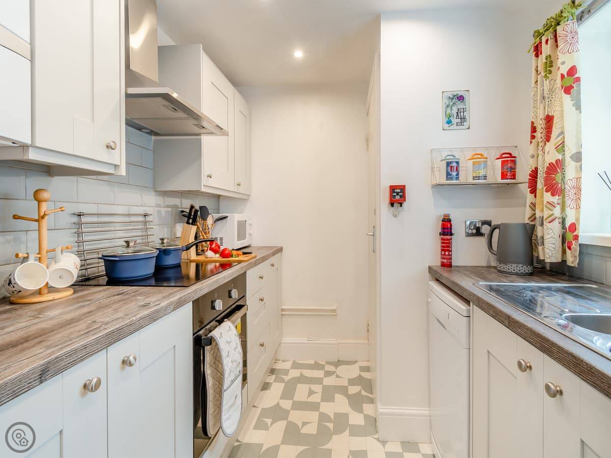 The galley kitchen's small but it has what you need, including a dishwasher. There's one en-suite shower off the bedroom, and a separate toilet. Bedding and towels are included. There's WiFi and parking.