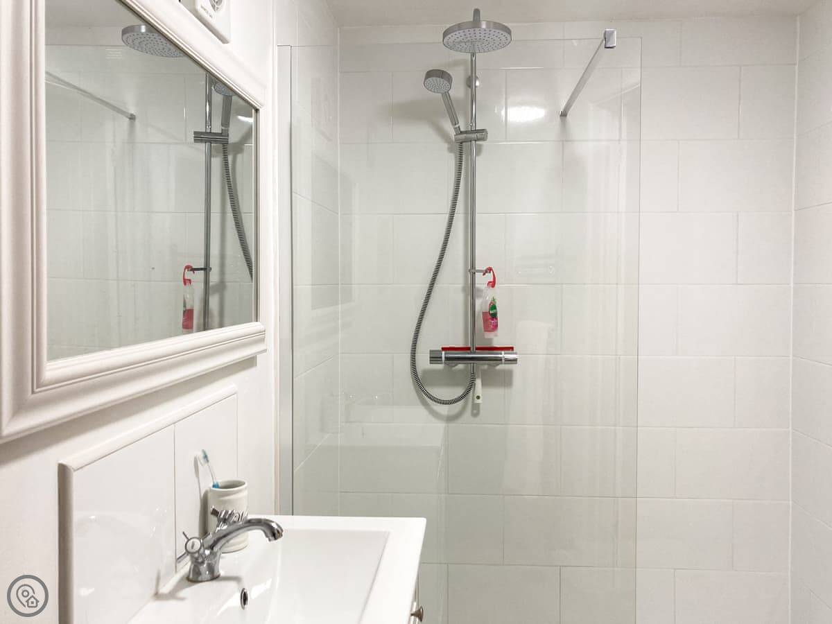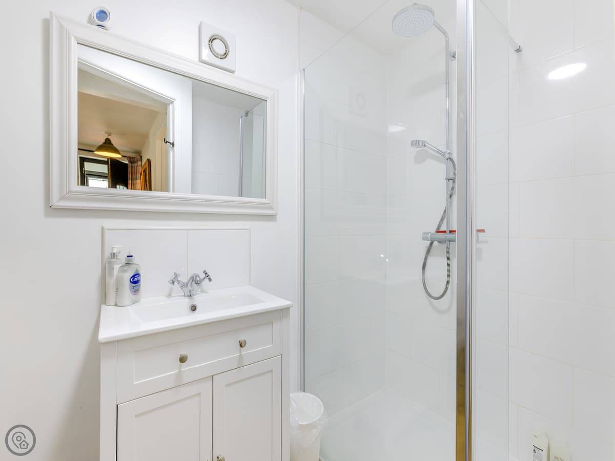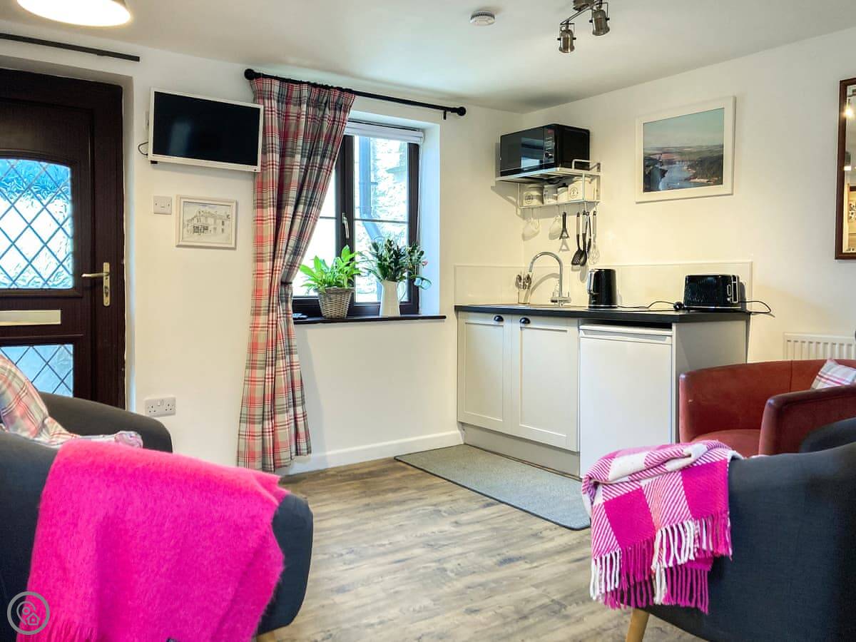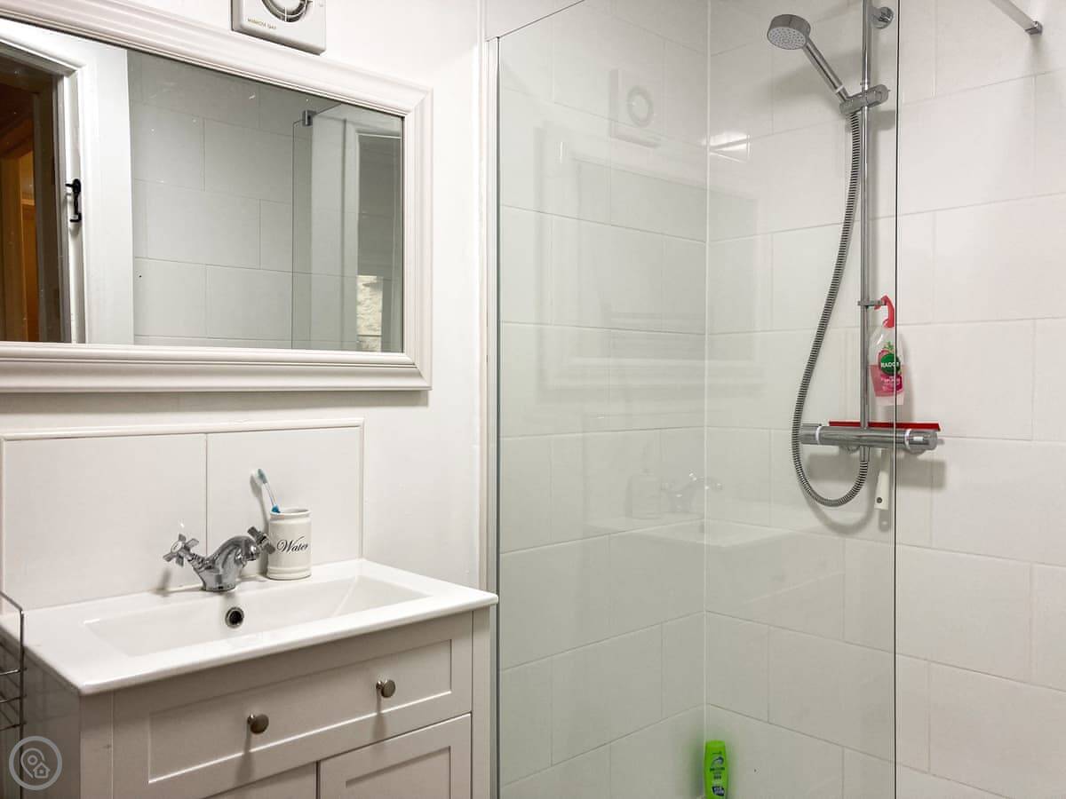 It's all on the ground floor. The living area is open plan with a kitchenette. You get a fridge, microwave, and a two-plate induction hob. There's a TV with a Firestick and a DVD player. The shower room is pretty good, with a big walk-in shower.