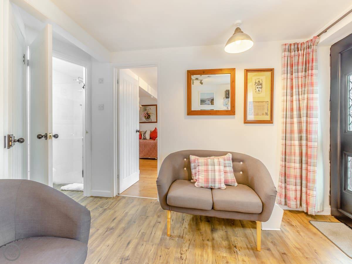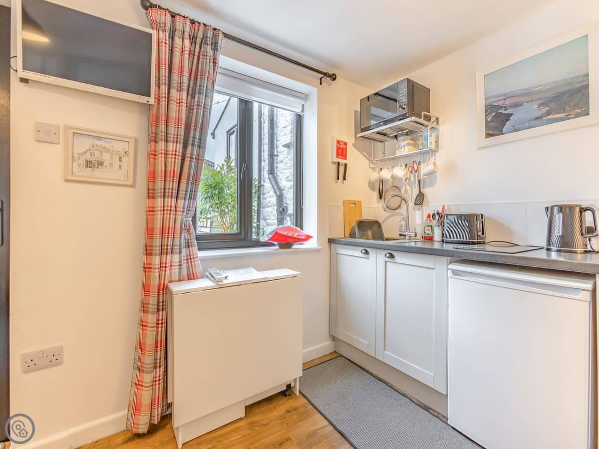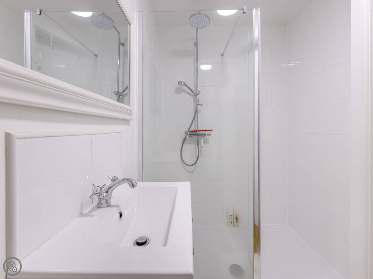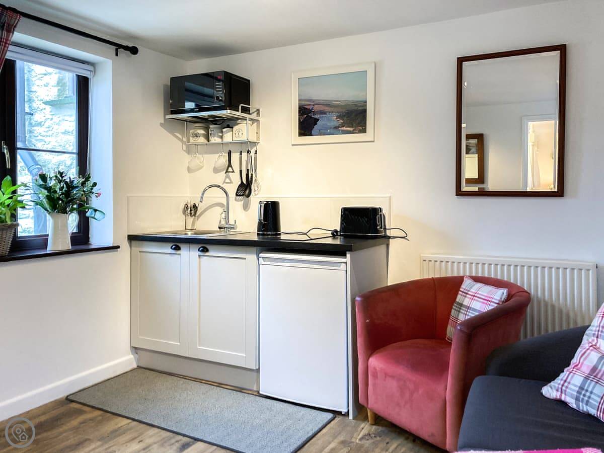 It's all on the ground floor. The living area is open plan with a kitchenette. You get a fridge, microwave, and a two-plate induction hob. There's a TV with a Firestick and a DVD player. The shower room is pretty good, with a big walk-in shower.