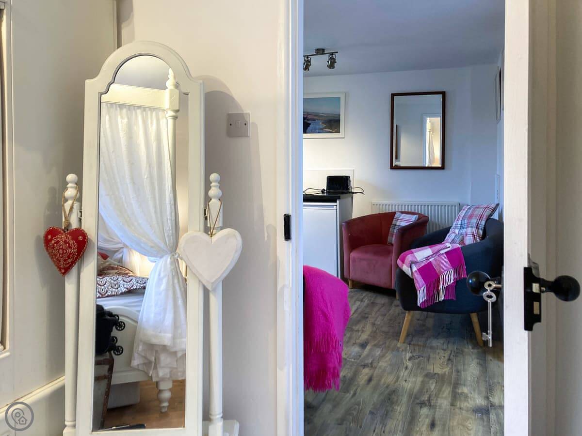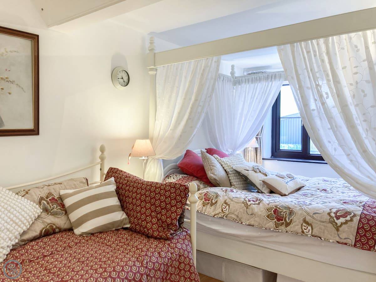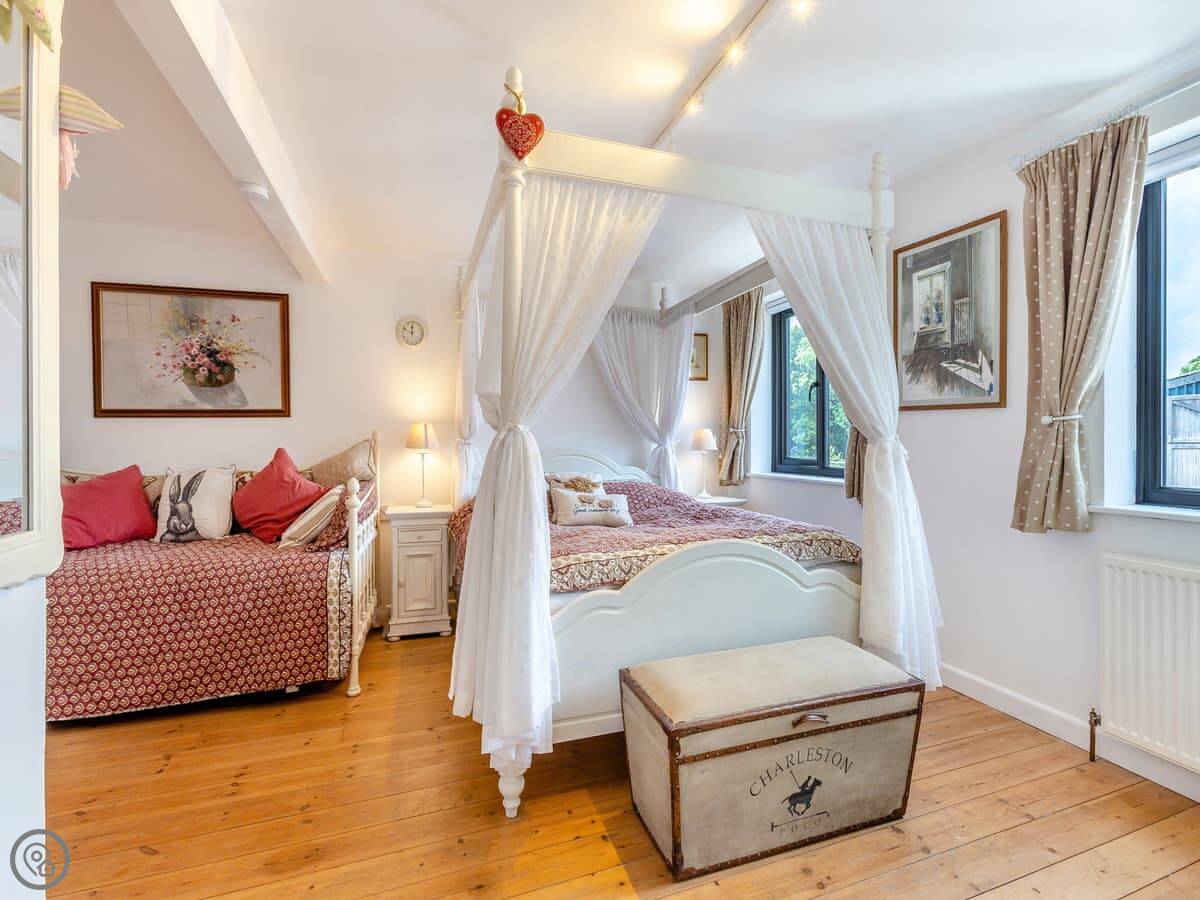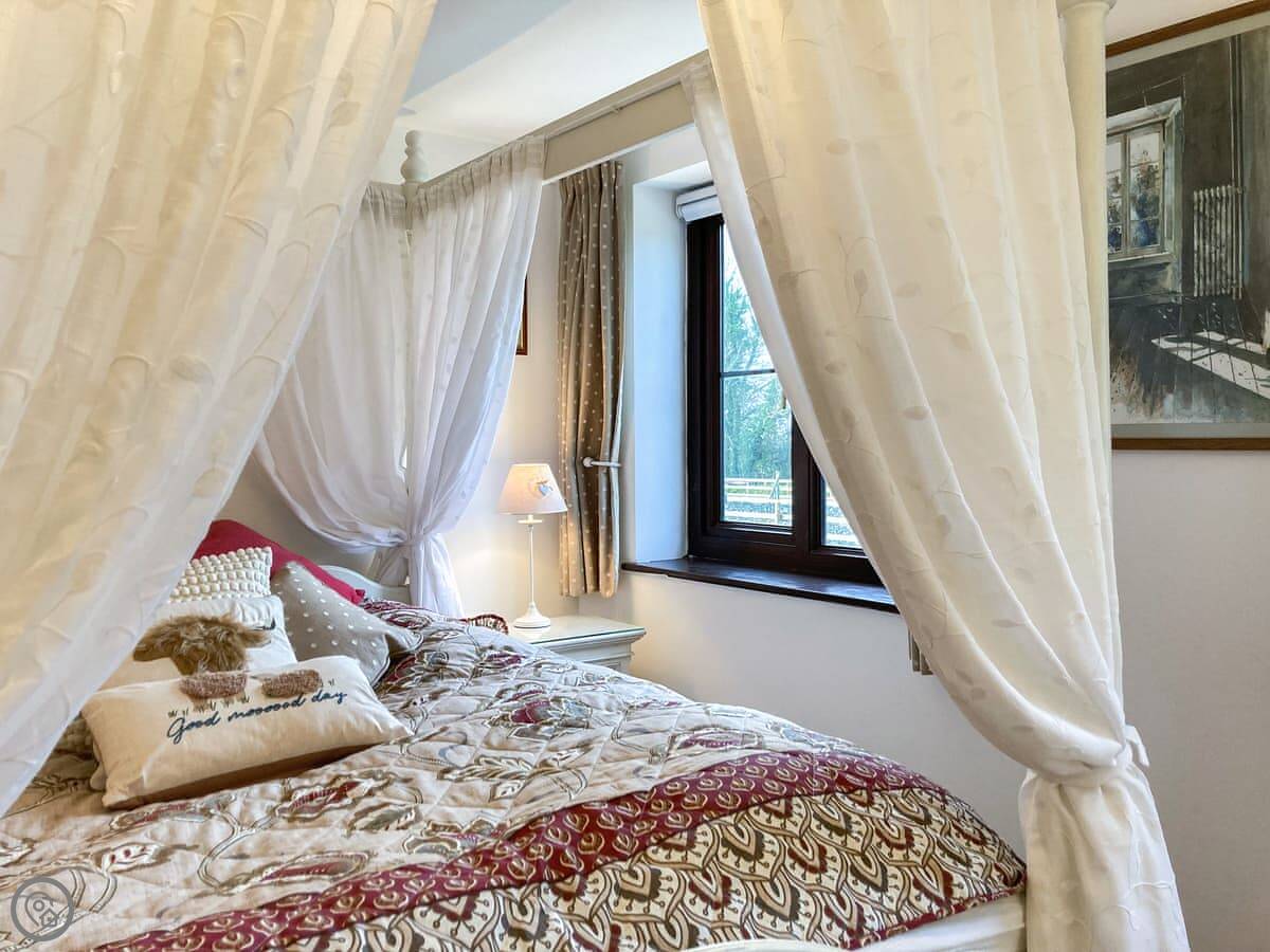The Farmers Den is an annexe next to my farmhouse just outside Lydford. It sleeps up to three people. There's a king-sized four-poster bed and a single day bed in the one bedroom.