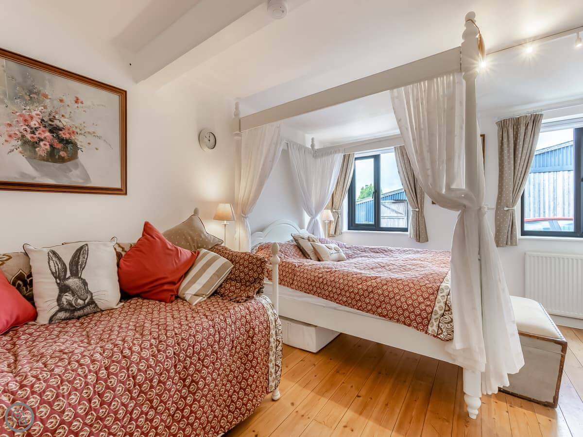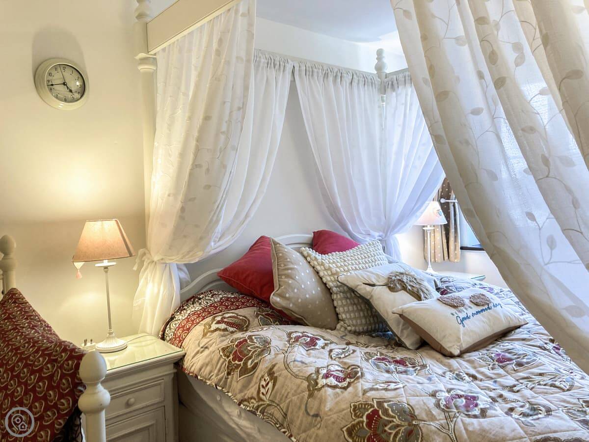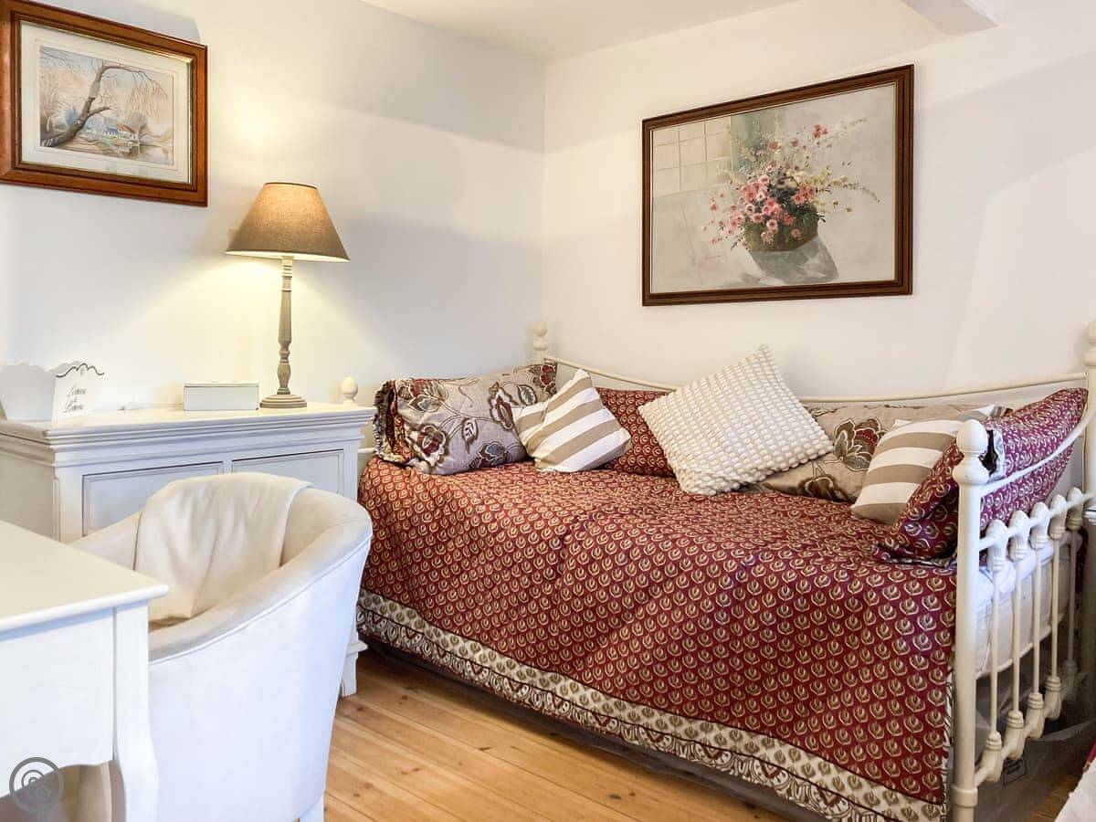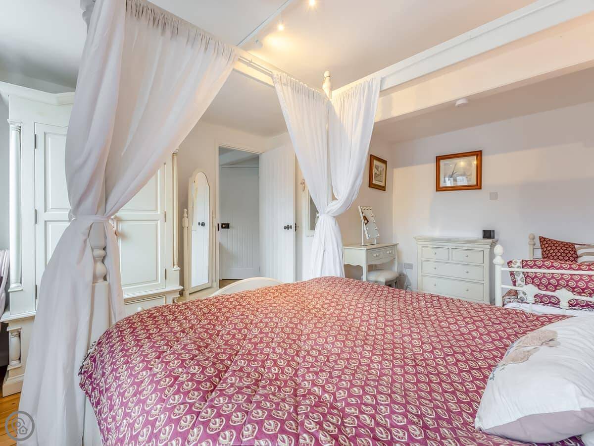 The Farmers Den is an annexe next to my farmhouse just outside Lydford. It sleeps up to three people. There's a king-sized four-poster bed and a single day bed in the one bedroom.