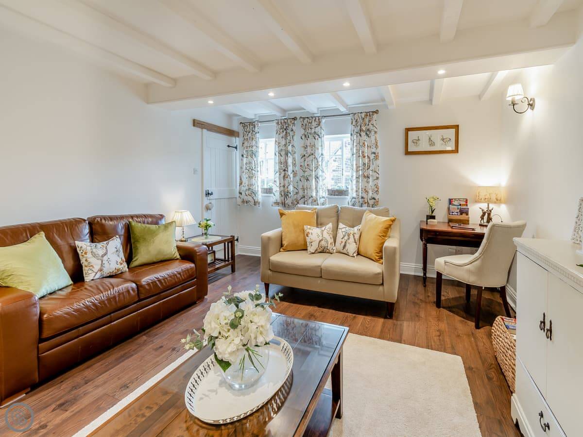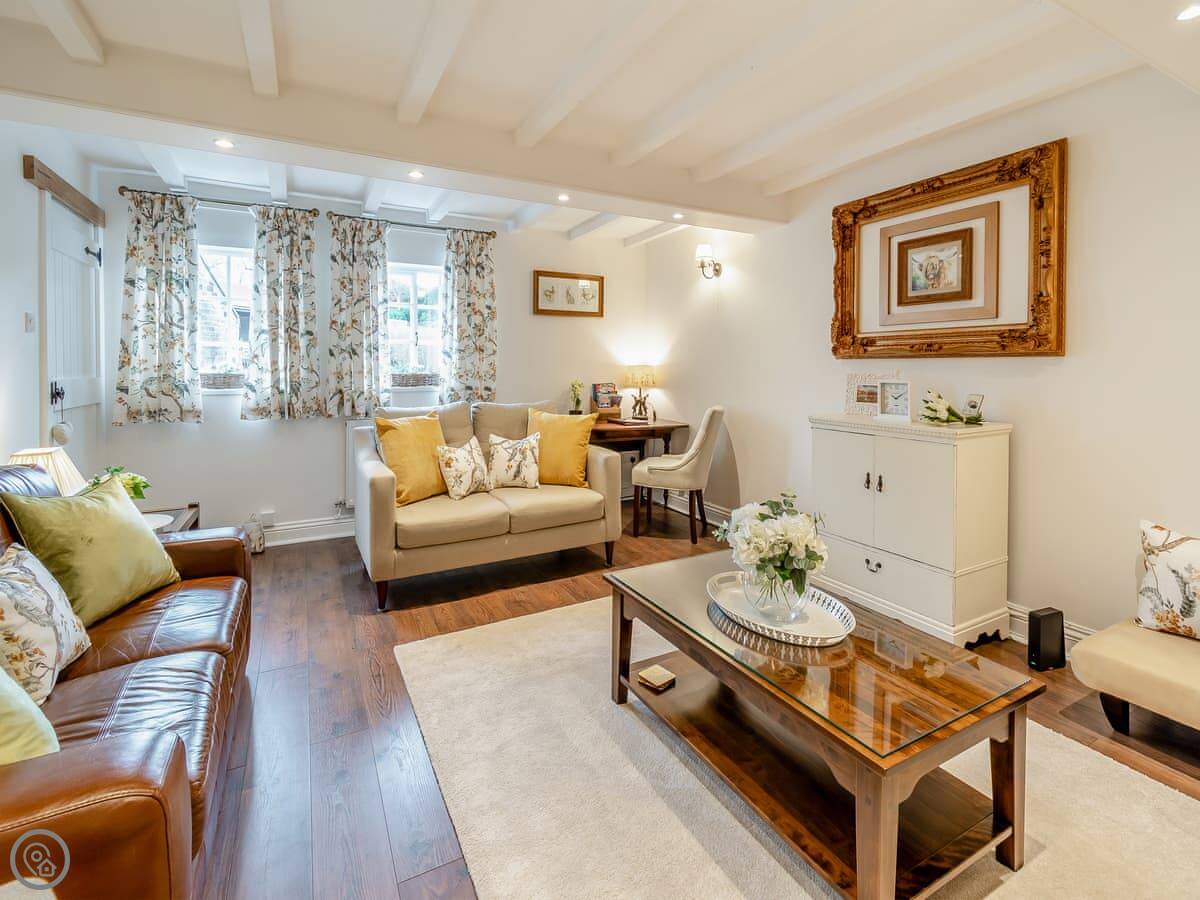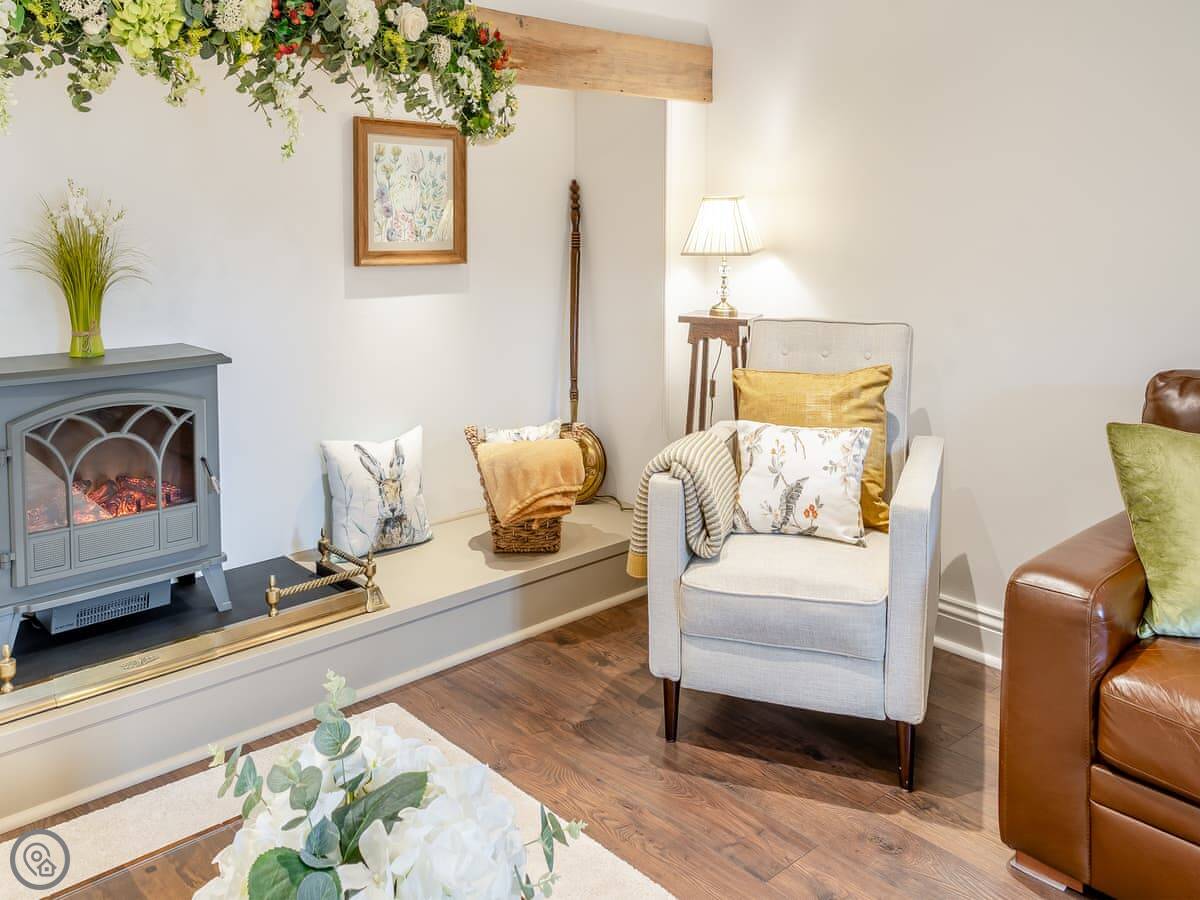 The cottage used to be the village lemonade factory back in the 1800s. It's built from the local golden sandstone. Inside, it's spacious. The living room has a high electric wood burner and a big beam over the fireplace. The TV is in a wooden cabinet you open up. The kitchen has a table with a bench and an island.