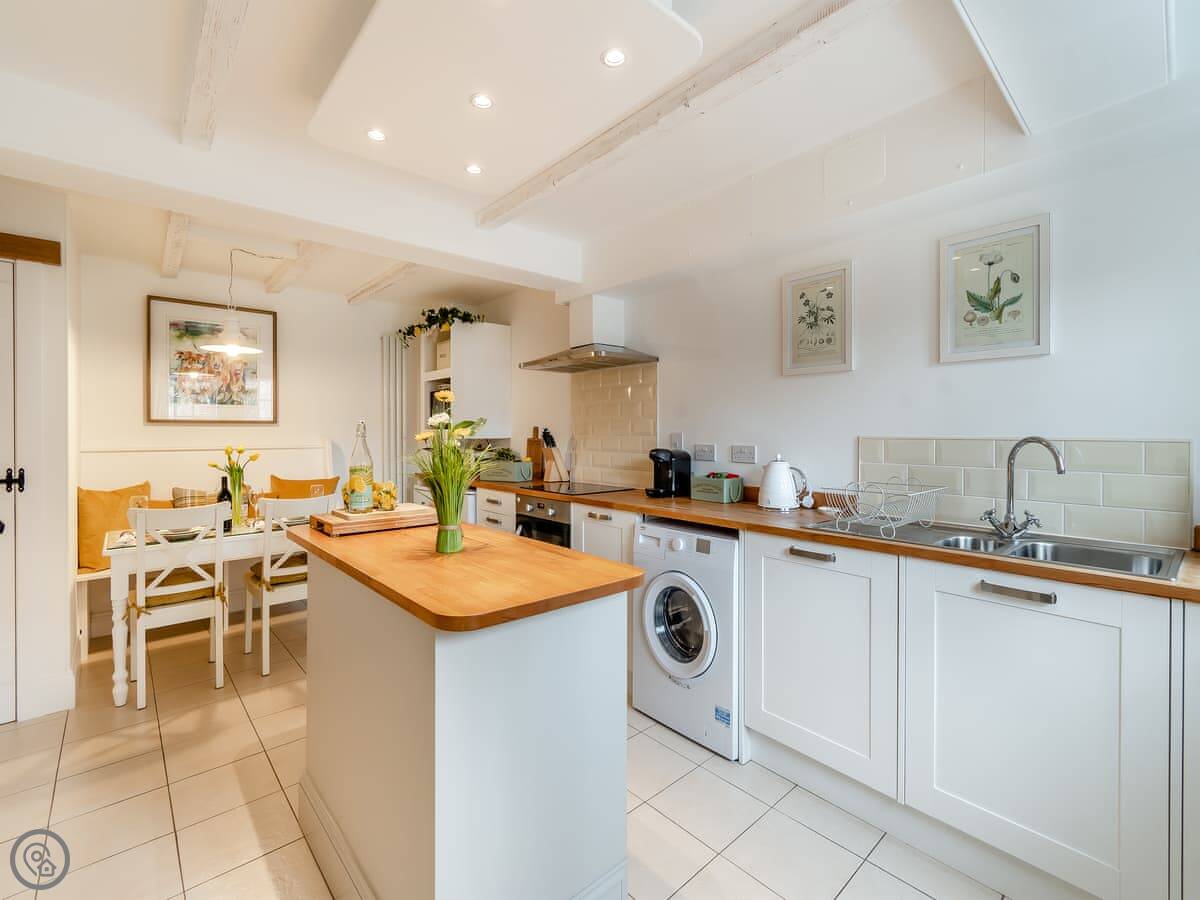 For facilities, it has a washing machine, dishwasher, WiFi, and TV. Bedding and towels are included. There are two parking spaces, but they're just over the road on the other side of the stream. It's less than a minute's walk to get to them. No pets.