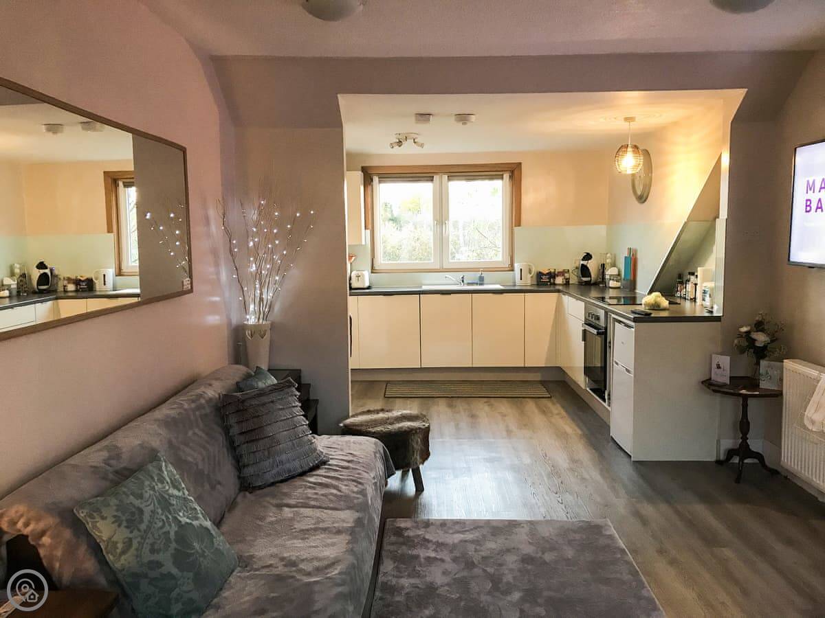 It's for four people, but that's with the sofa bed in the living room made up. There's one proper bedroom with a double bed. One bathroom. It's clean and modern, rated 4 Star. The living area is open plan with the kitchen.