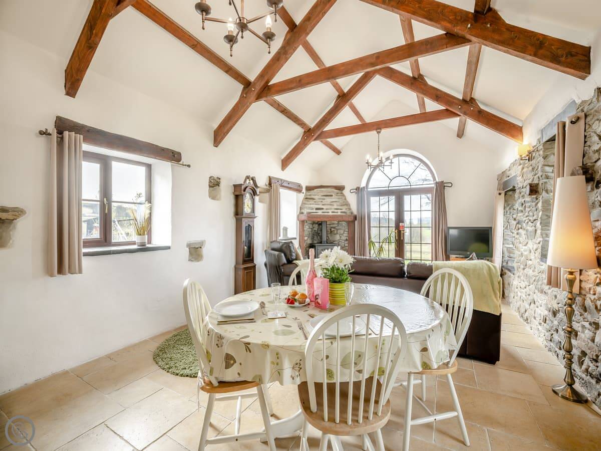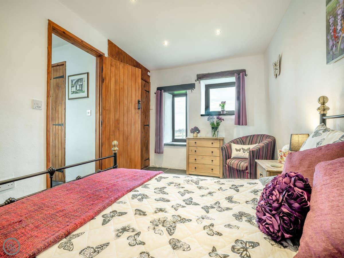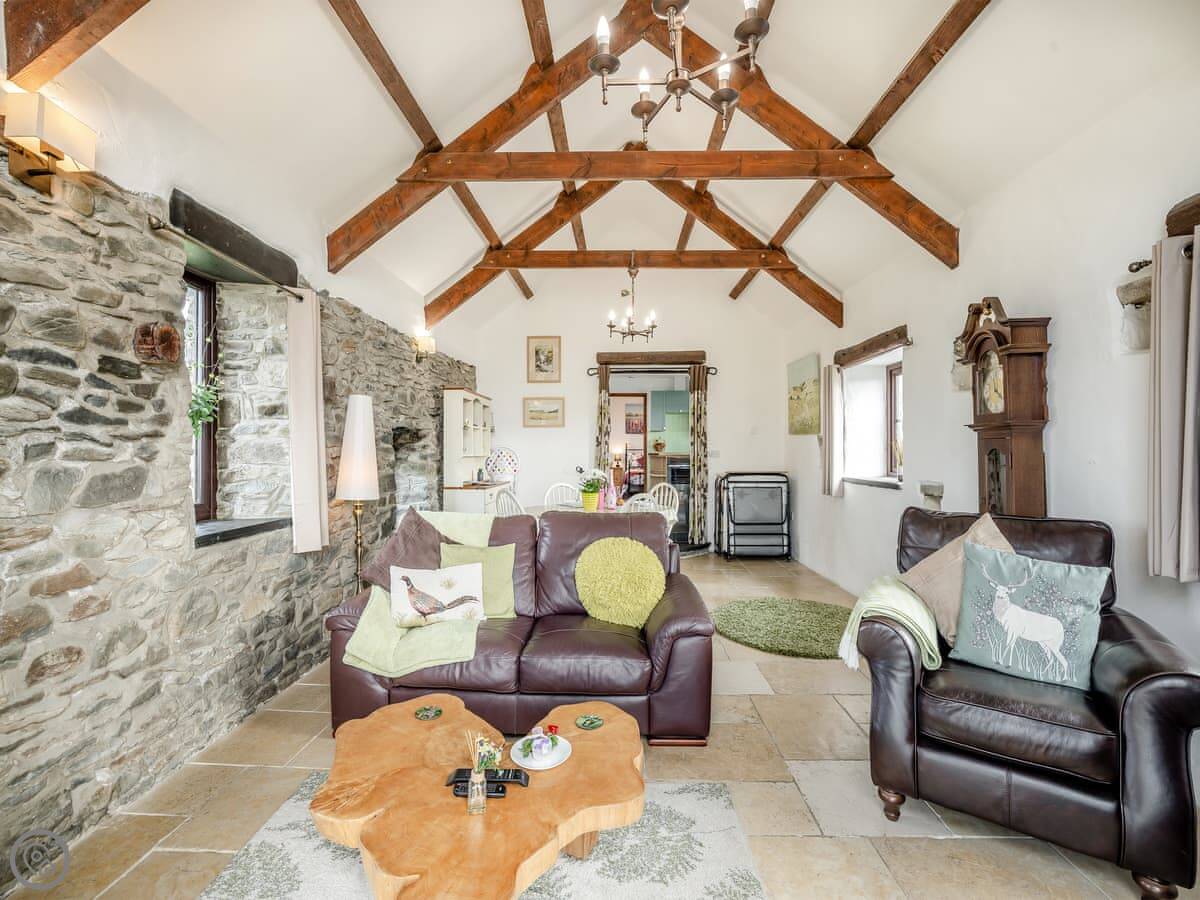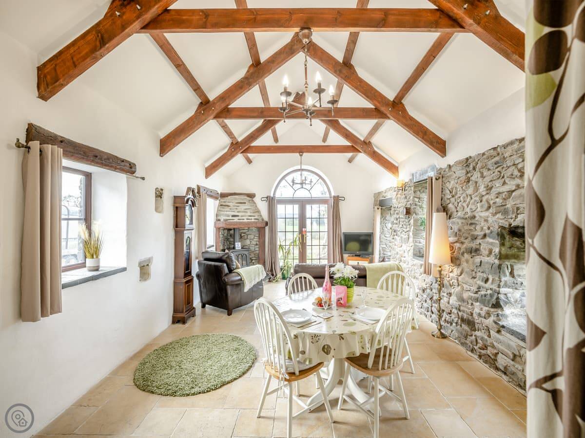 It's got one bedroom and one bathroom, both on the ground floor. The rating is 4 Star. It's comfortable and well looked after. The walls are thick stone and there are plenty of old beams, which means some of the doorways are low. You'll need to mind your head.