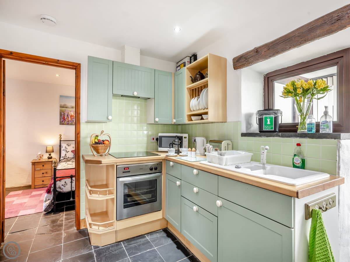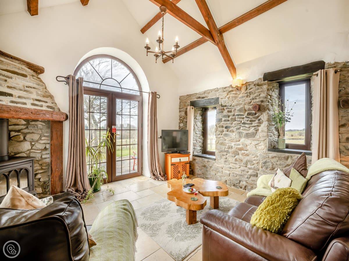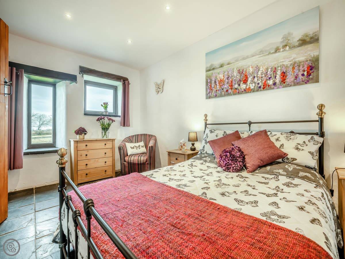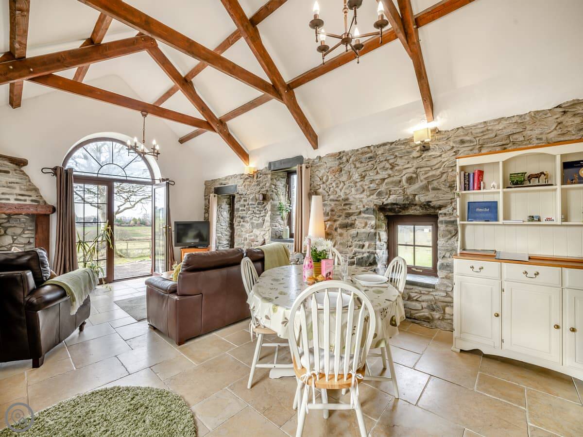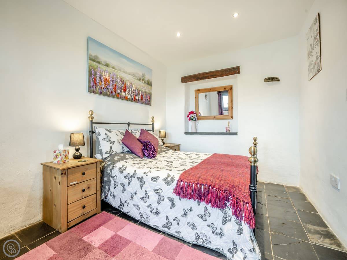 It's got one bedroom and one bathroom, both on the ground floor. The rating is 4 Star. It's comfortable and well looked after. The walls are thick stone and there are plenty of old beams, which means some of the doorways are low. You'll need to mind your head.
