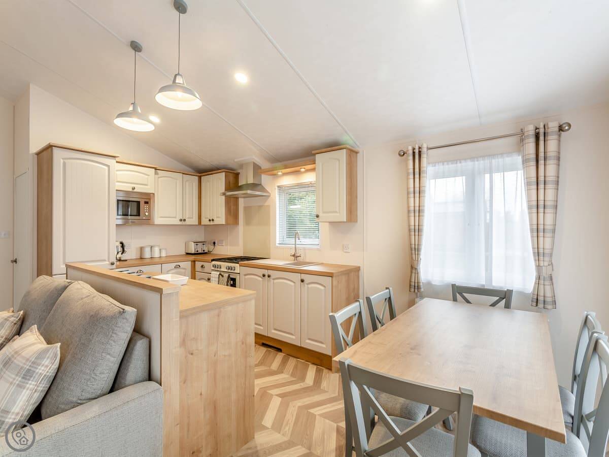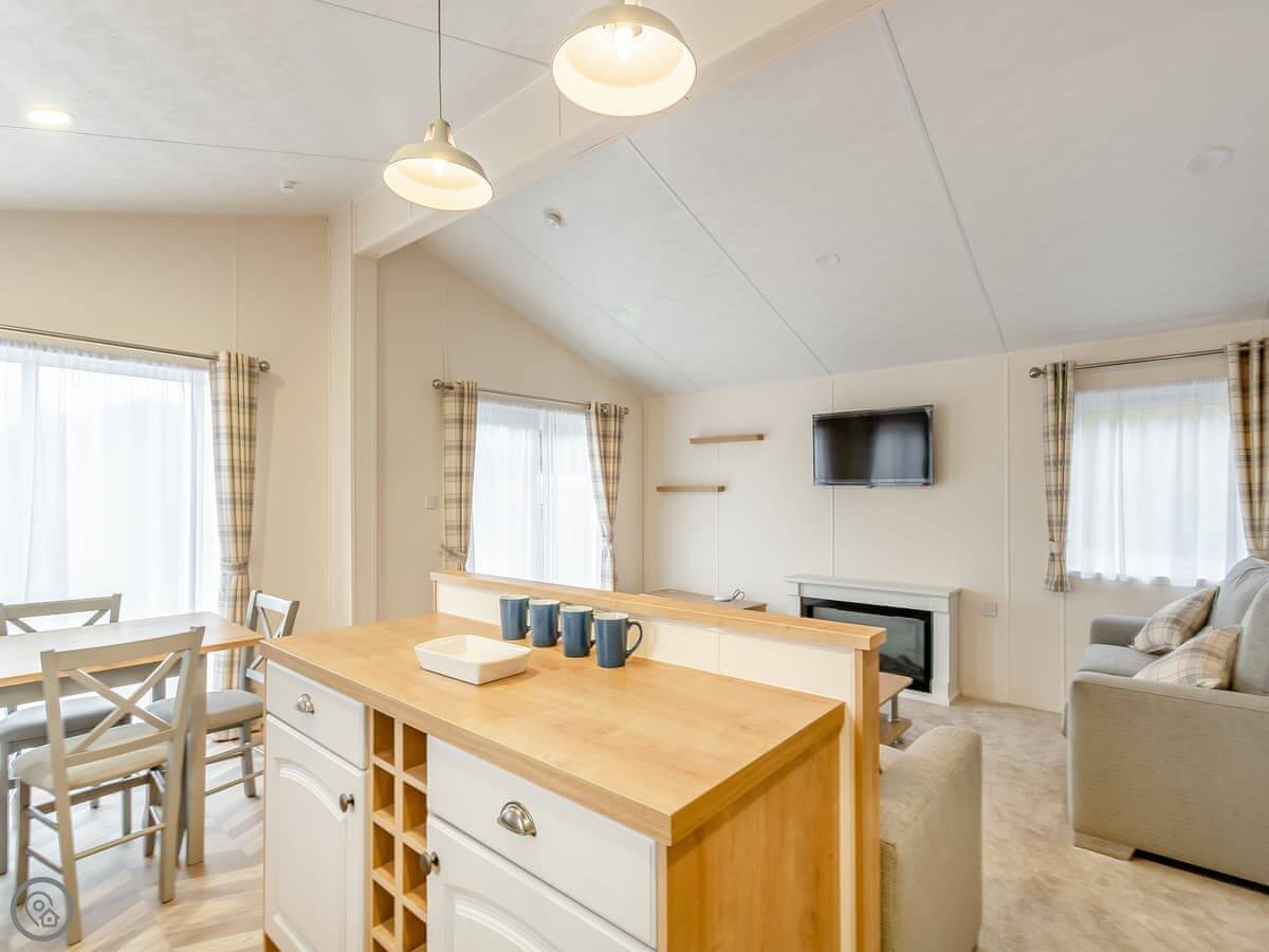 The living area is open plan with the kitchen. There's a dining table, a TV, and sliding doors to the patio. It's all clean and works fine. There's a utility cupboard with a washing machine, and a boot cupboard by the front door.