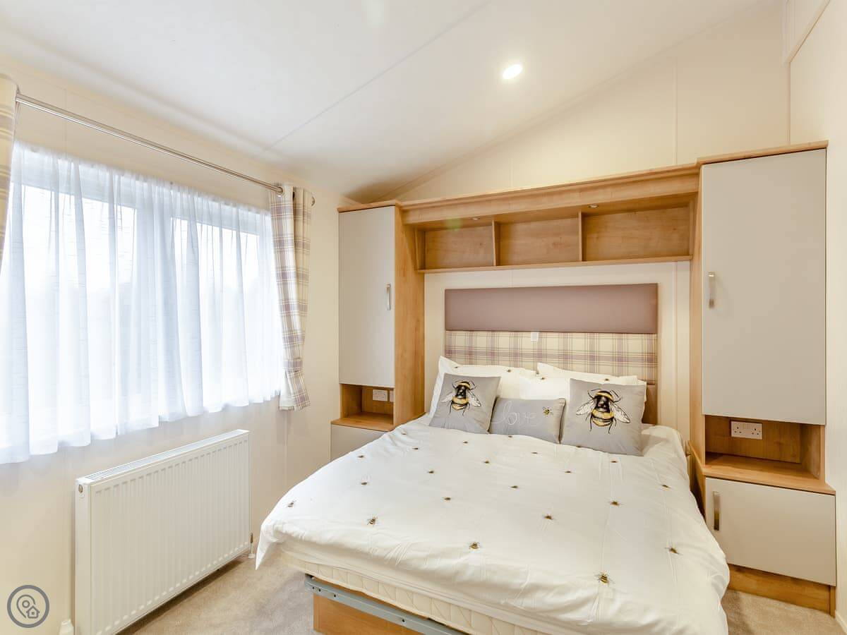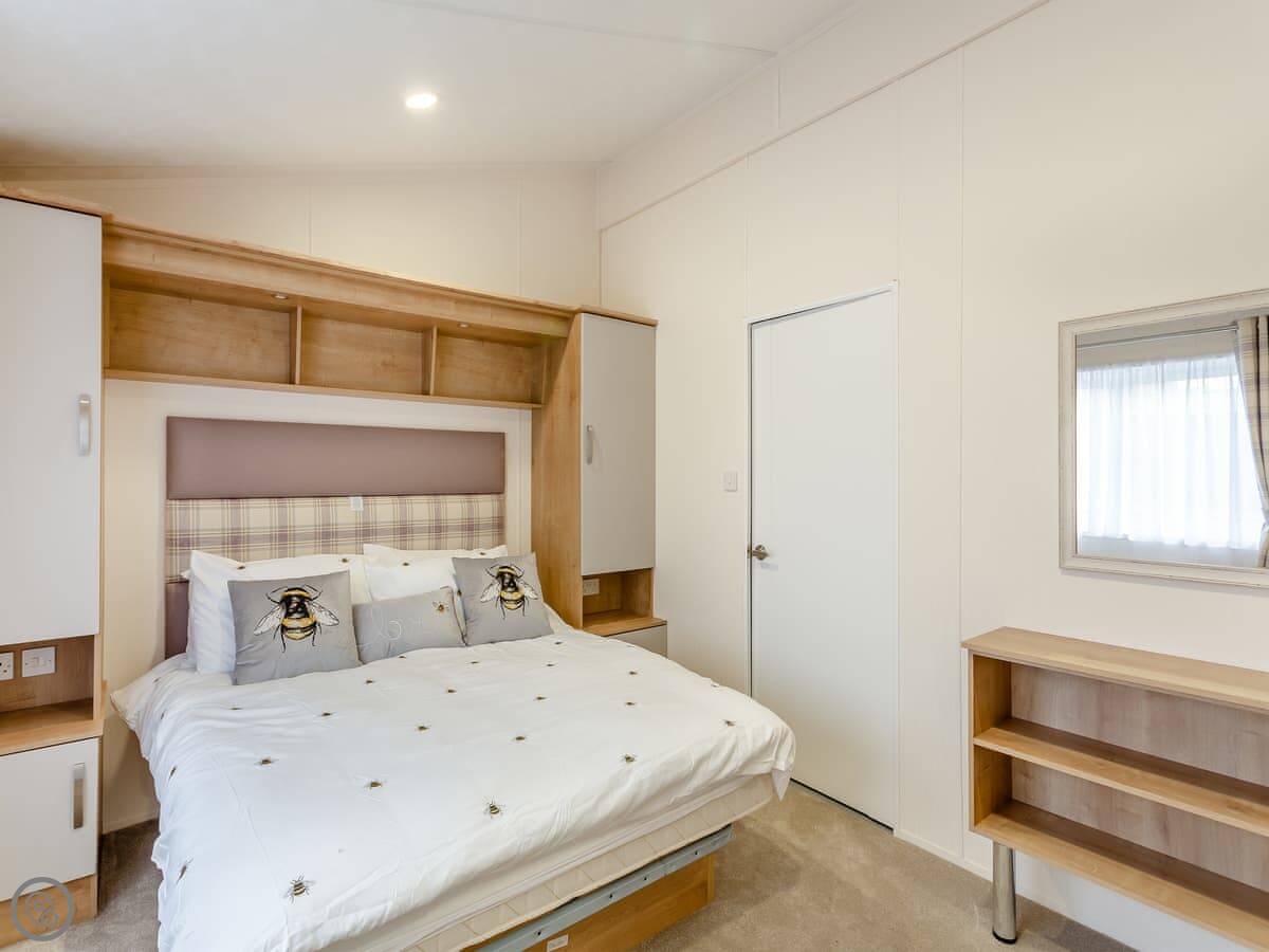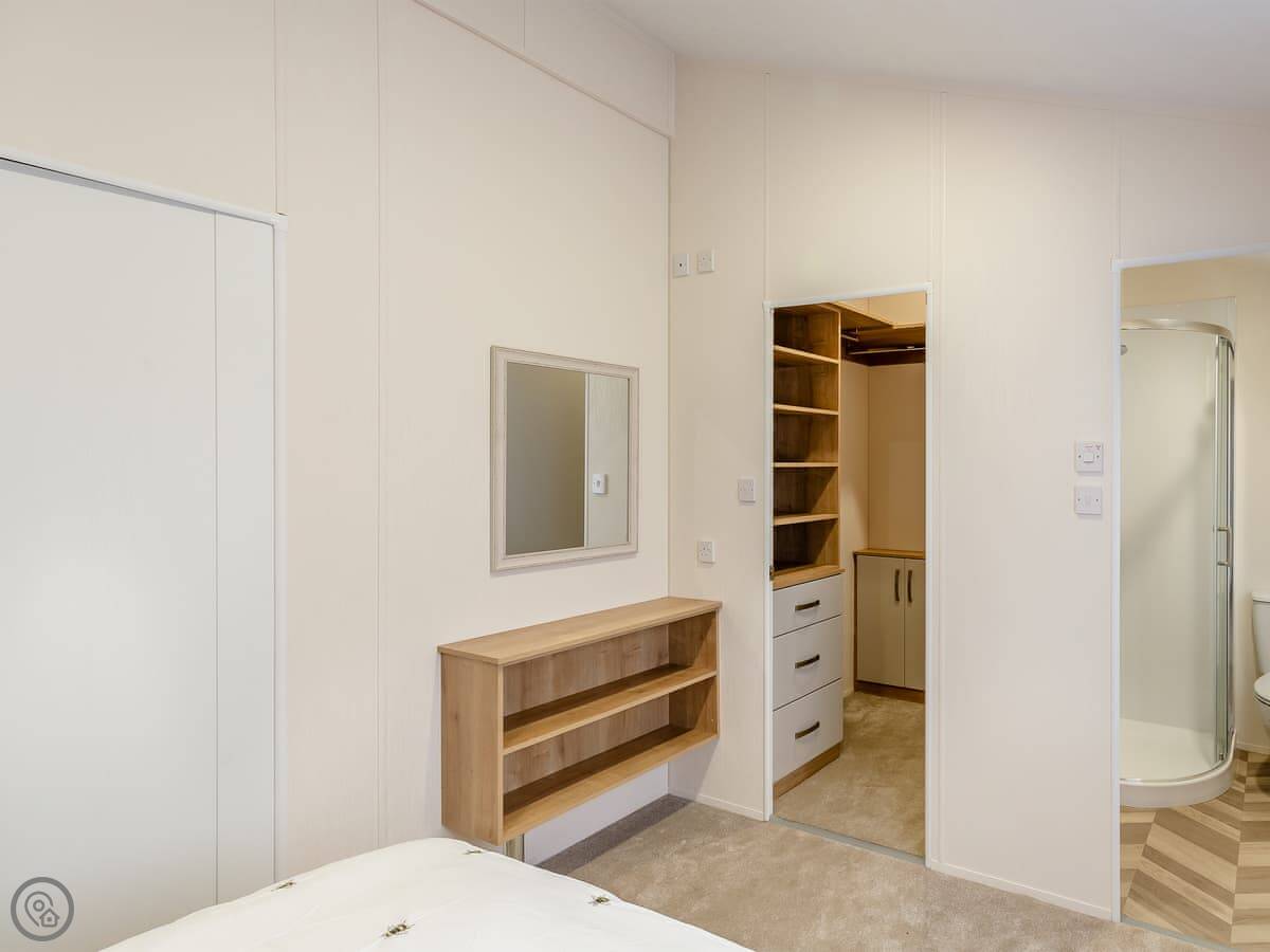 It sleeps four people. Two bedrooms, two bathrooms, which is handy. The main bedroom has its own shower. It's got a four star rating. The space is generous, with big wardrobes.