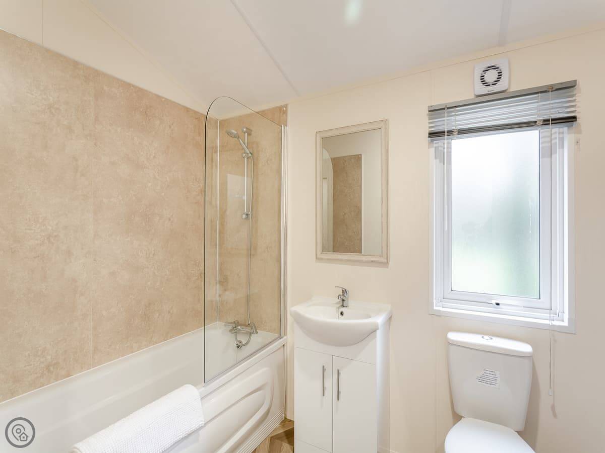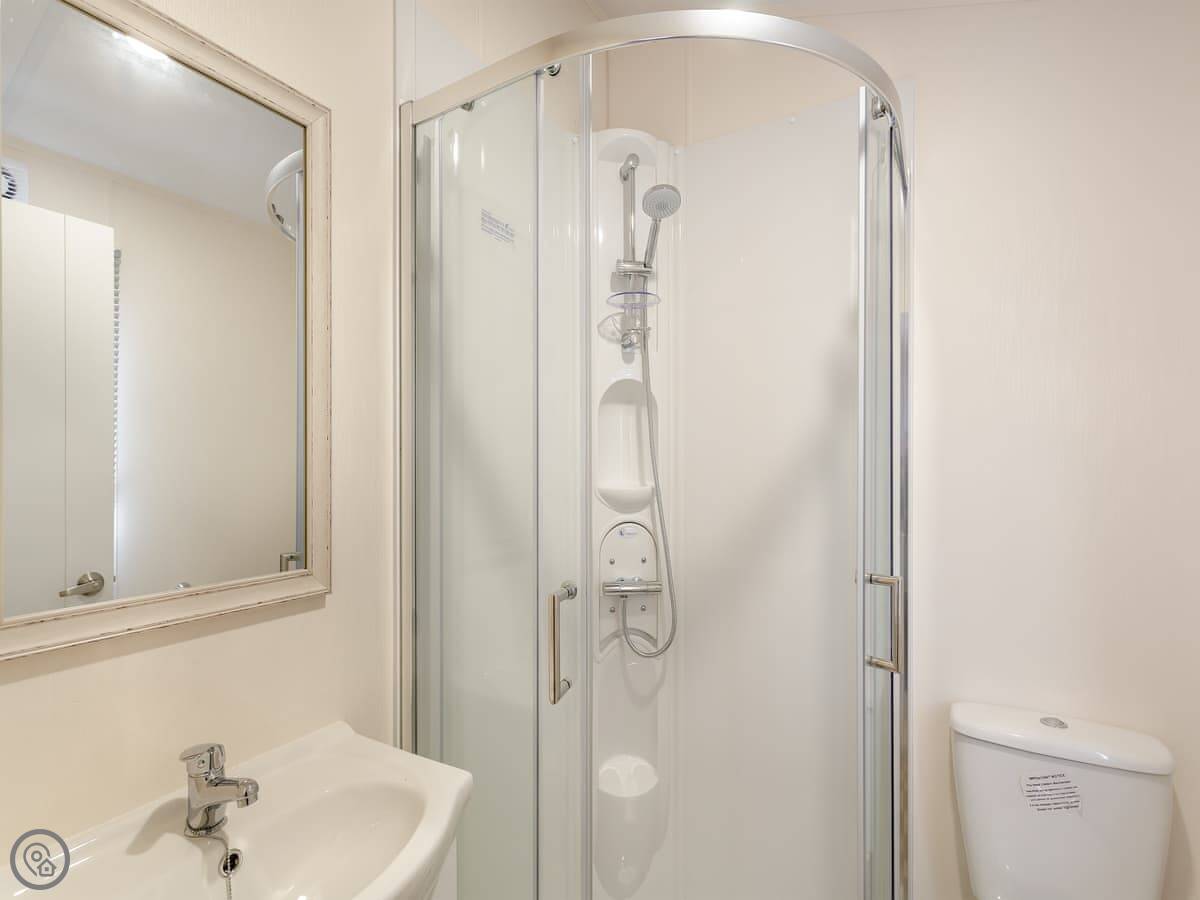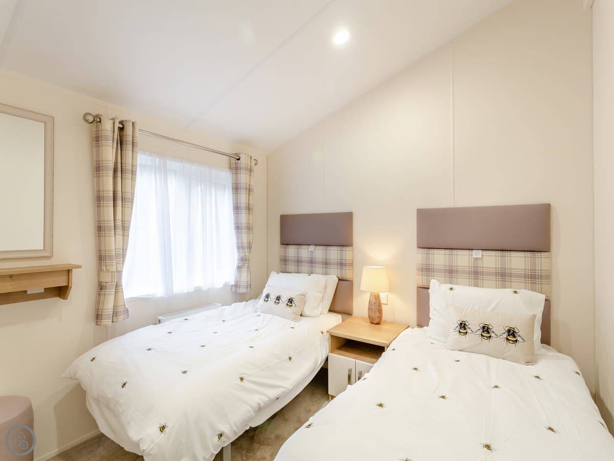 It sleeps four people. Two bedrooms, two bathrooms, which is handy. The main bedroom has its own shower. It's got a four star rating. The space is generous, with big wardrobes.