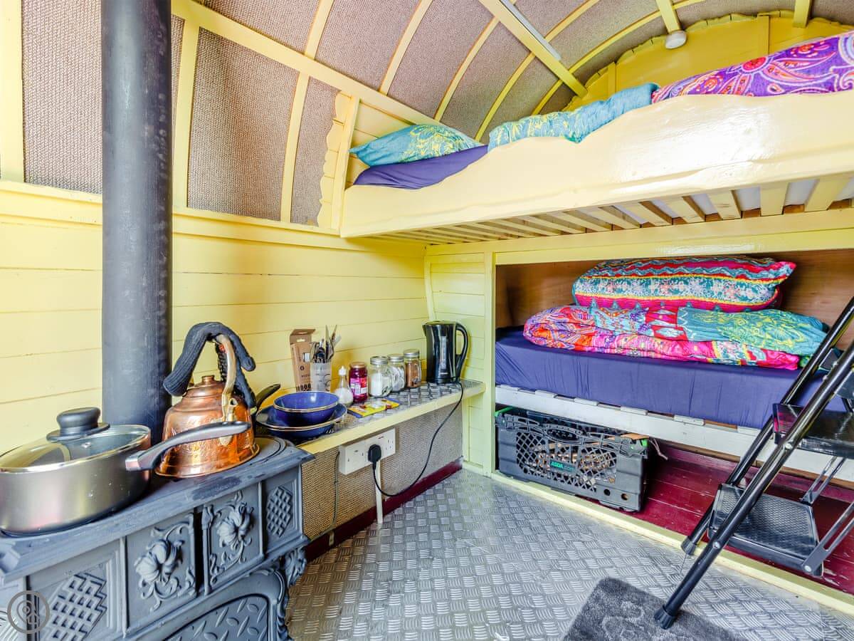 The Vardo provides a comfortable double bed and one single bed, please note there is limited head room for this bed. Further boasting a beautiful wood burner, complete with kettle to boil the ever important cup of tea! There is a small side kitchenette, with enough room to prepare soup and a roll, or perhaps sandwiches. Or, you may prefer cooking on the stonebaked pizza oven located outside in your own patio area. You also have access to your own ’hut’ where you can shower using the gas heated unit, and there is also a compost toilet. This is an ideal choice for couples and friends to enjoy local attractions and walks right on your doorstep.