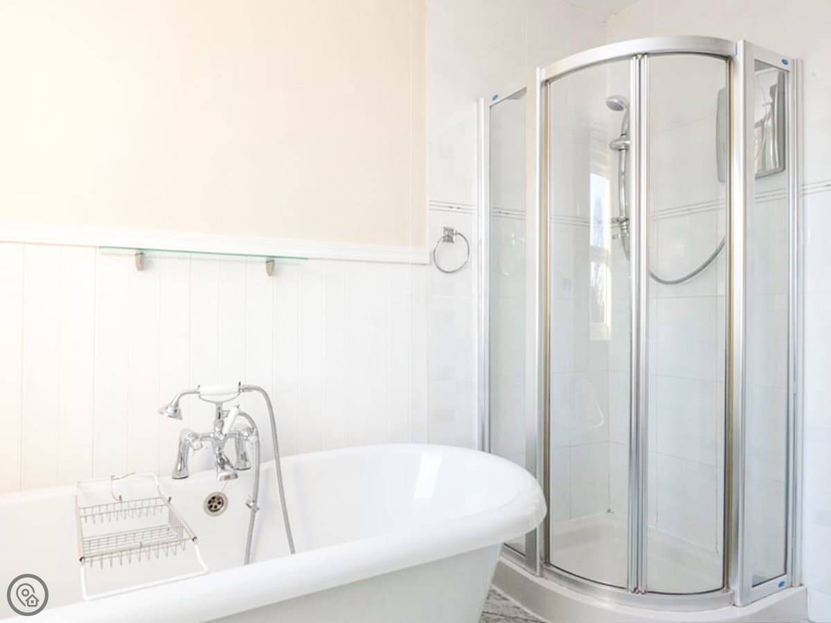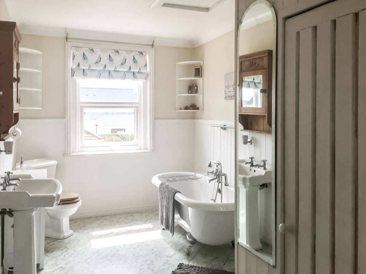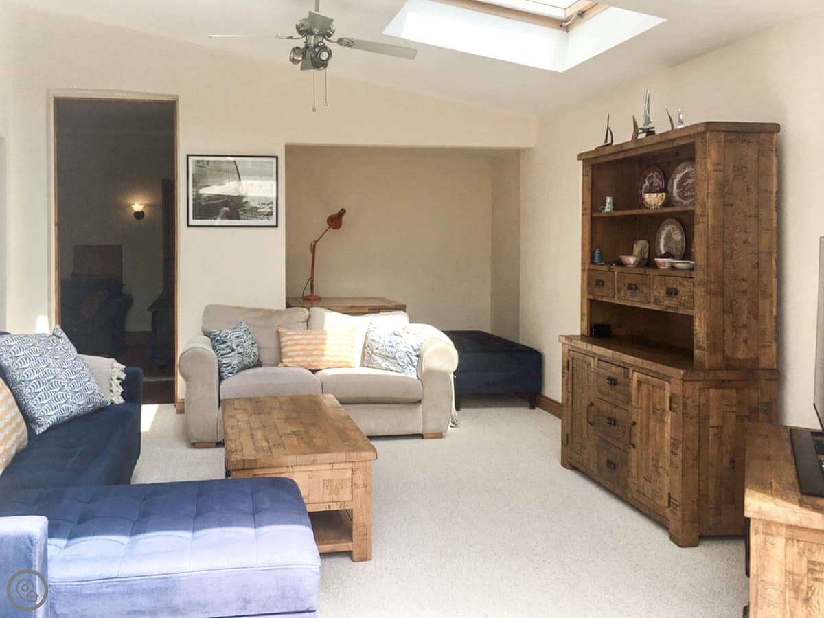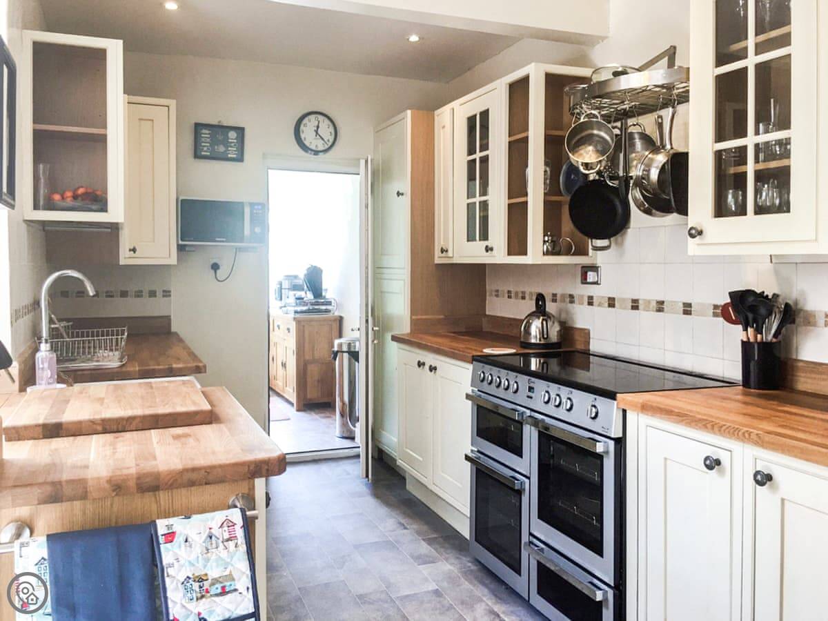 The kitchen has a big range cooker and there's a separate utility room with a washer and dryer. The living room gets the sun in the afternoon. The bathroom upstairs has a bath and a separate shower, but you have to go through the bunk bedroom to get to the shower. That's just the layout.