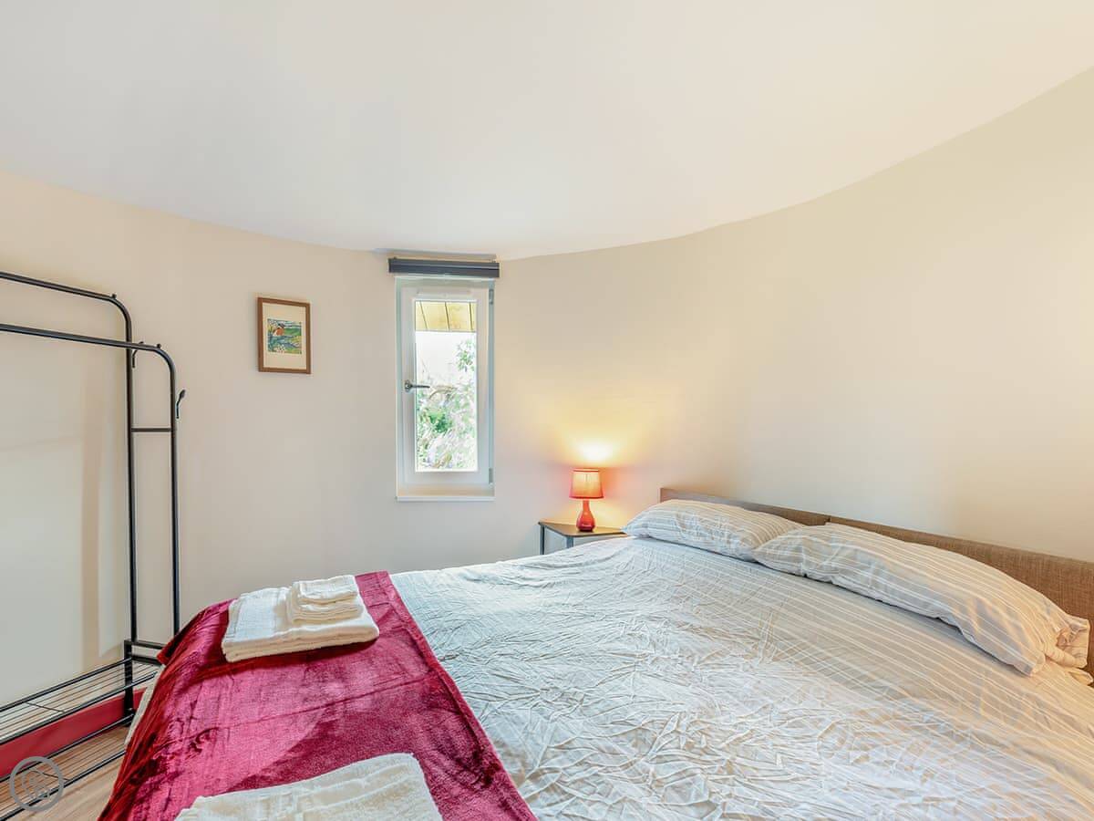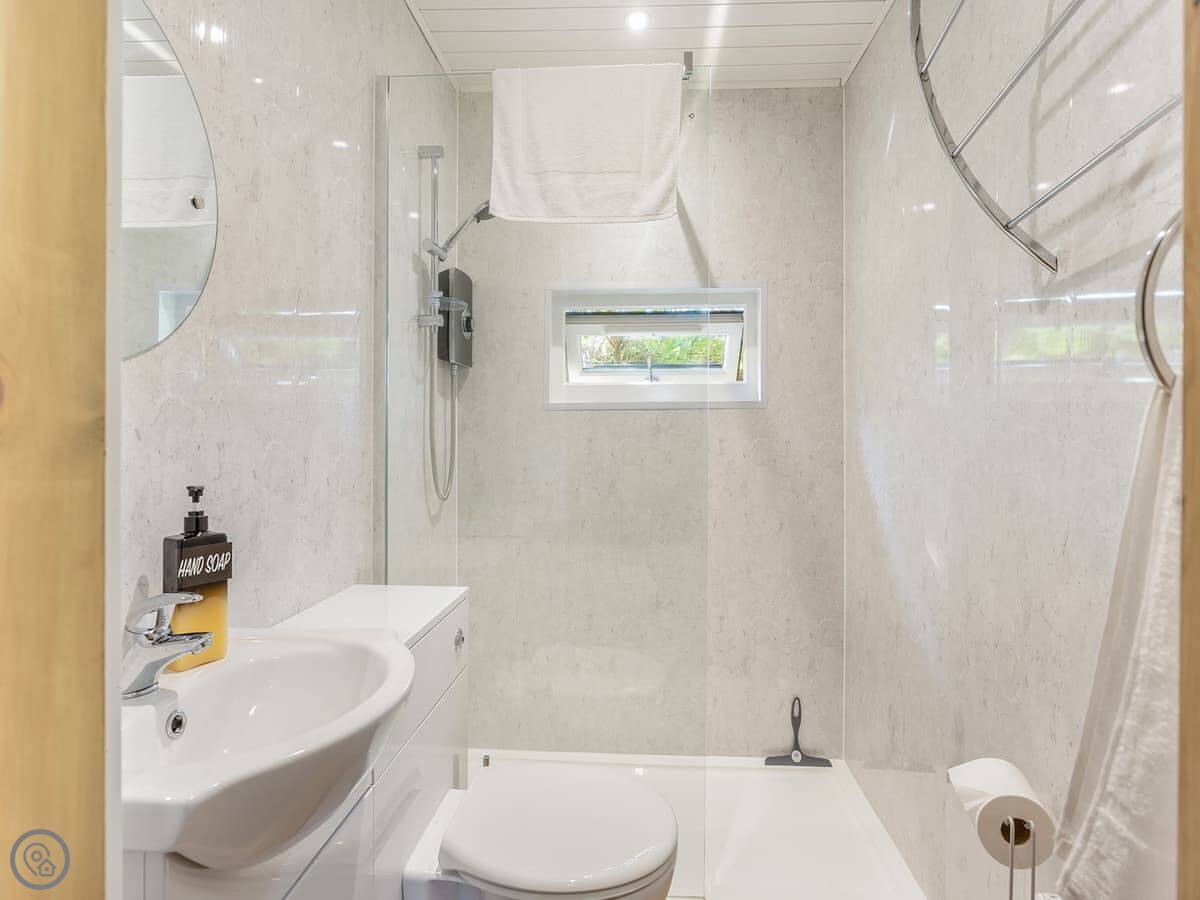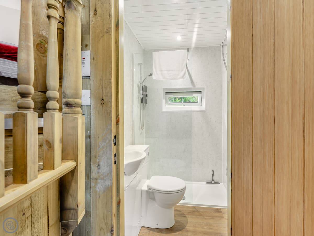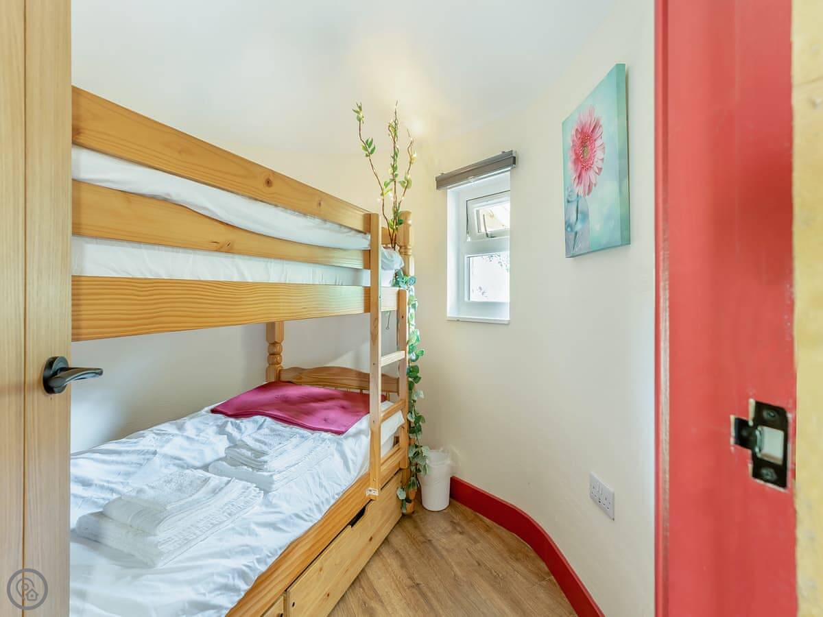 It sleeps four in two rooms. The top room has a super king bed that can be split into twins. The middle room has fixed bunk beds. There's one bathroom with a shower.