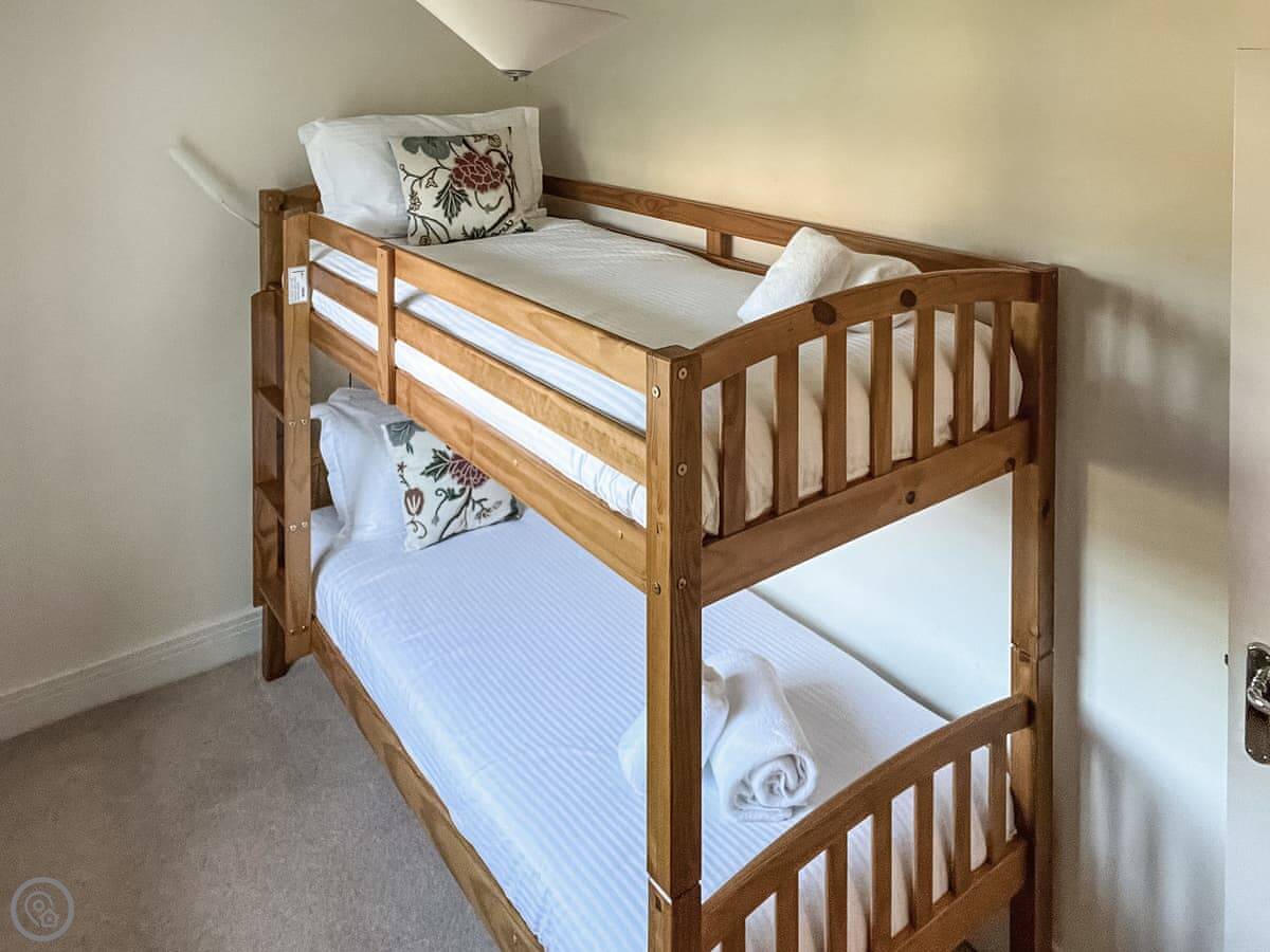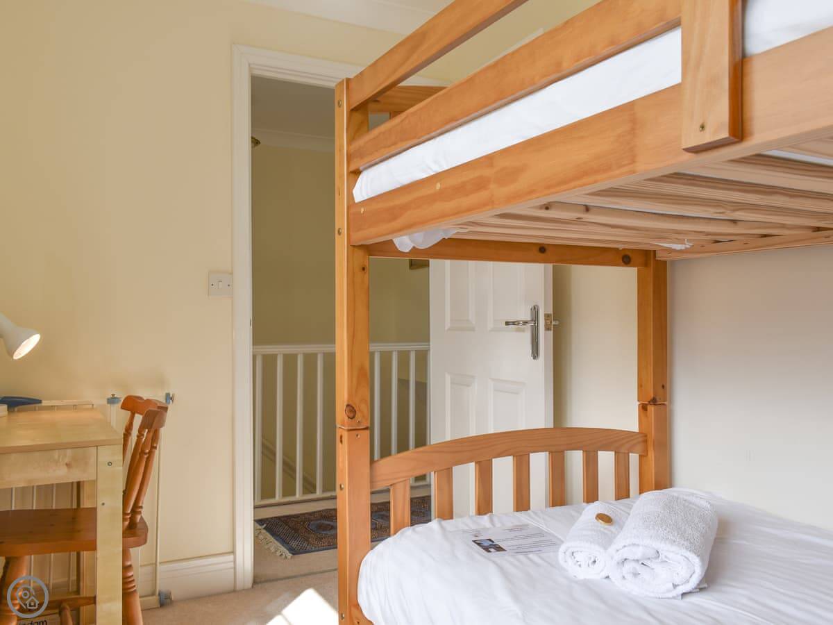 The layout is a bit upside down. You come in on the ground floor. That's where the main living room, kitchen, dining room and a small snug are. There's also a bunk room on this floor. The other three bedrooms are downstairs on the lower ground floor. They lead out to the garden. There are three bathrooms in total.