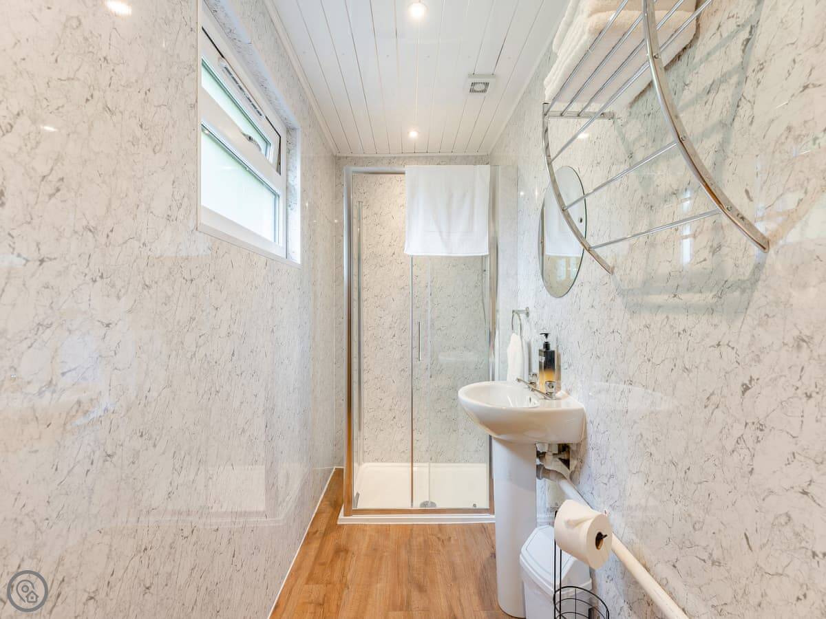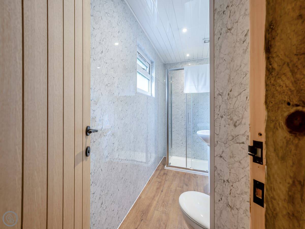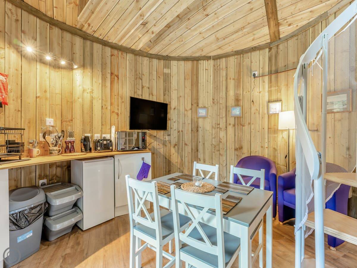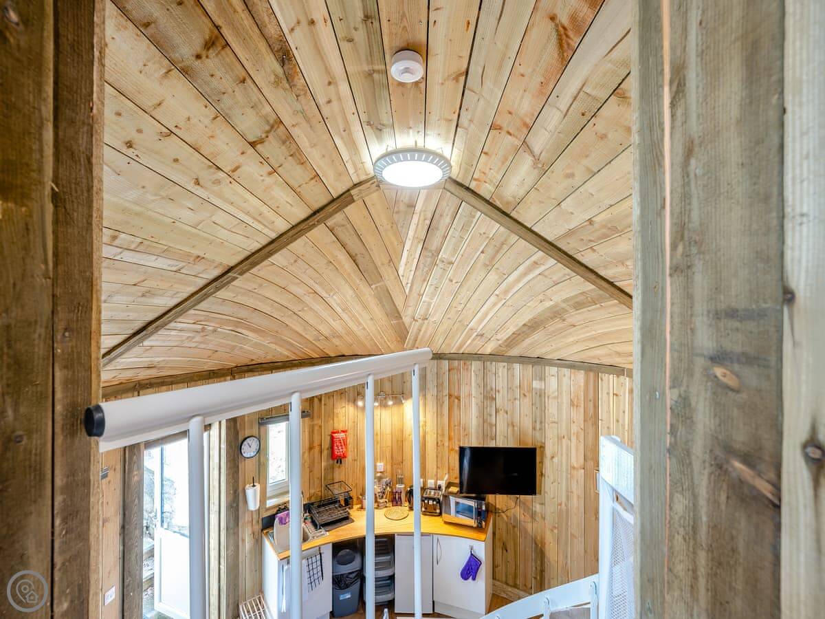 The main space is circular with a high ceiling. It's open plan, so the living area, kitchen, and the doors to the bedroom and shower room are all in that one round room. The shower room has a shower, no bath.