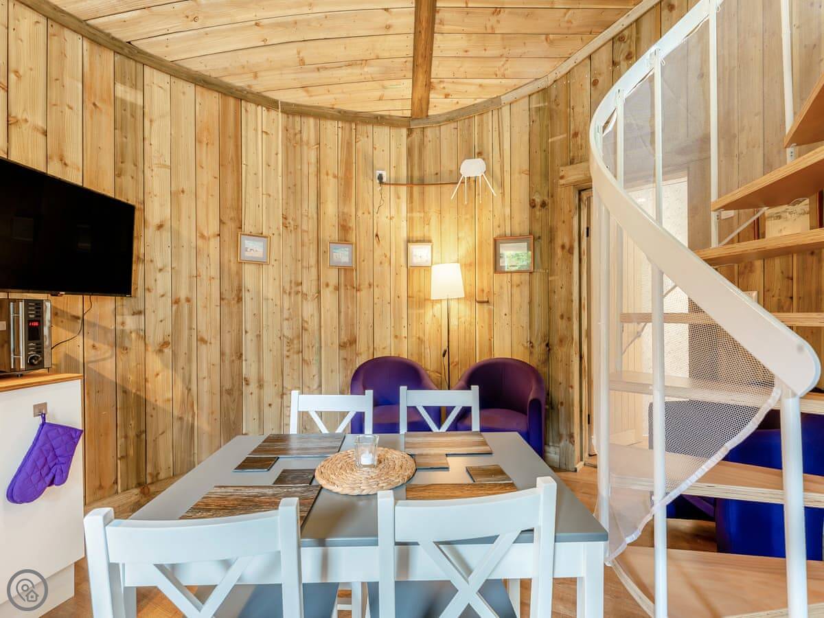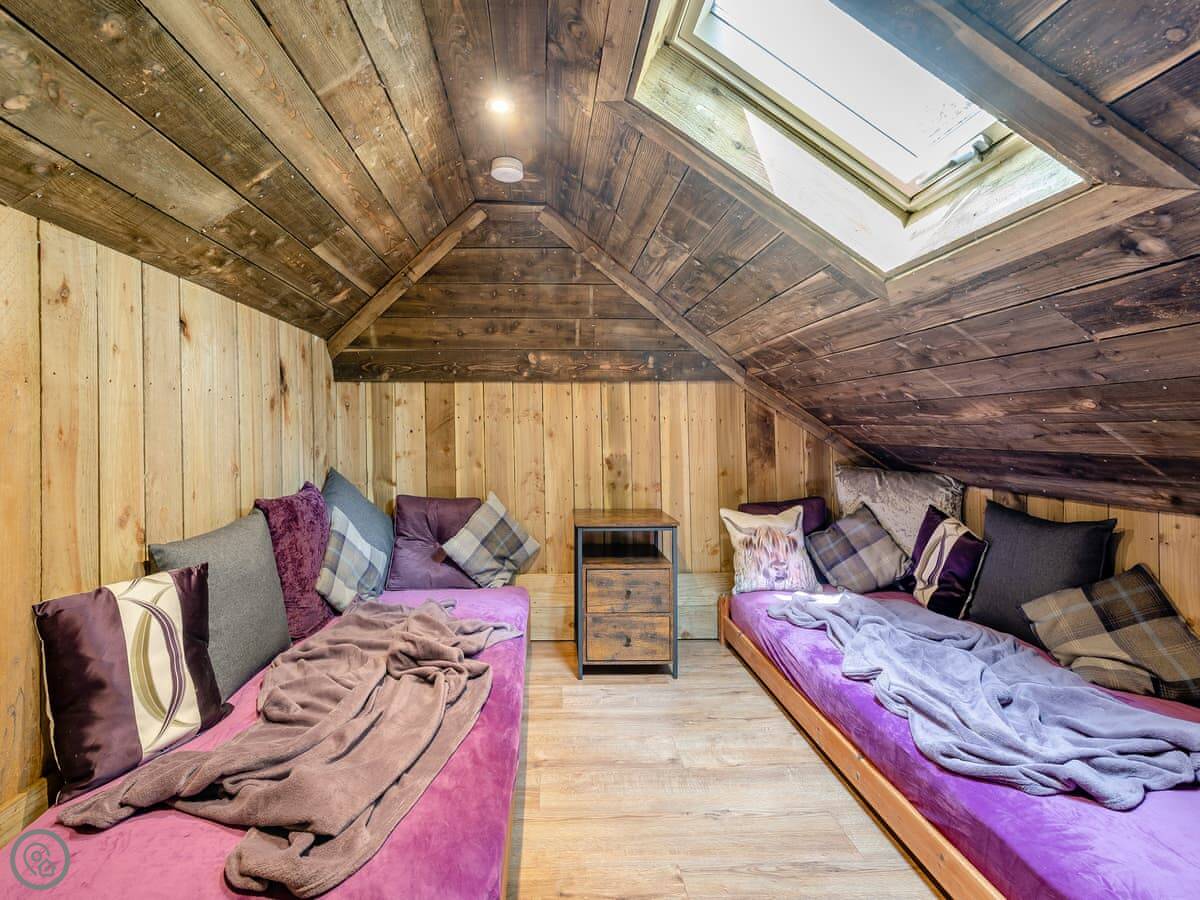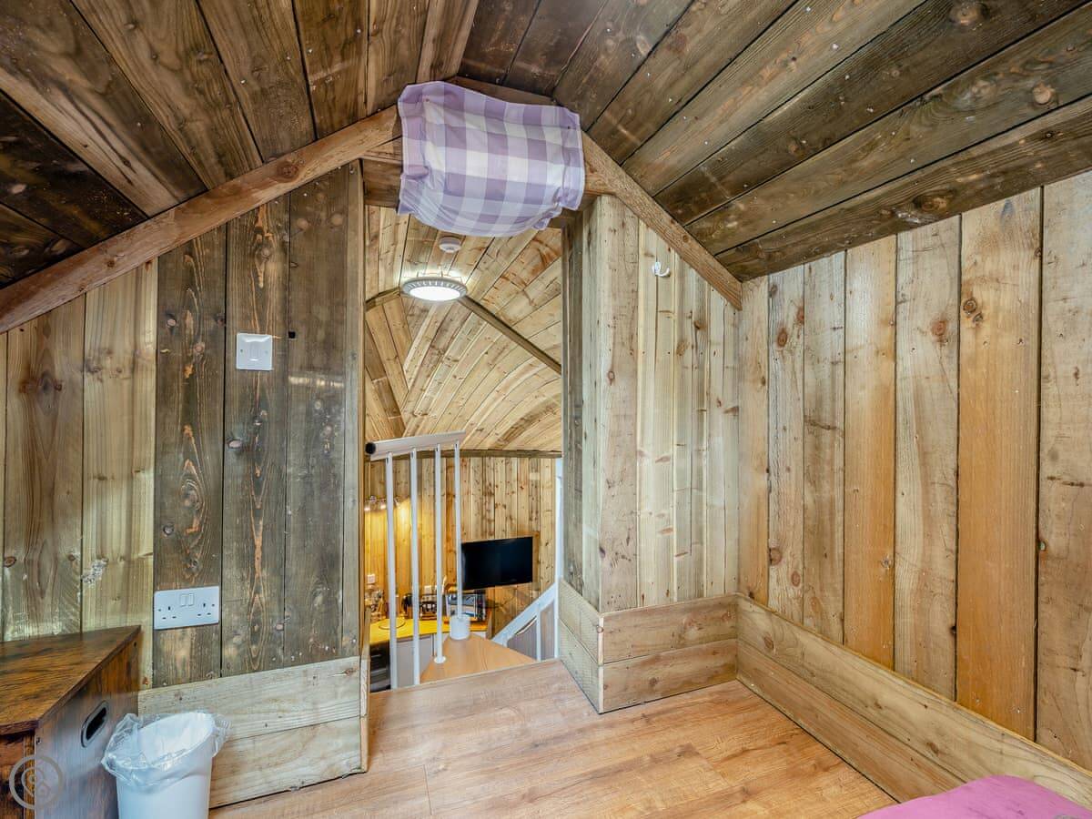 It's a 4 Star place, sleeps four. There are two bedrooms, but one's an attic den. You get a super king bed in the main room downstairs. Upstairs is a twin room, but you reach it by a fixed ladder. Because of that ladder, it's not suitable for children under 8.