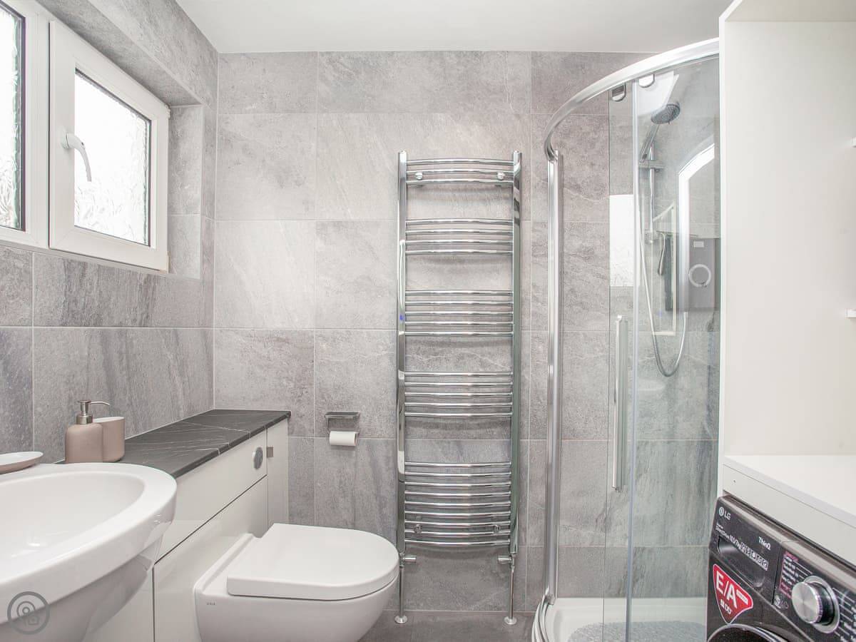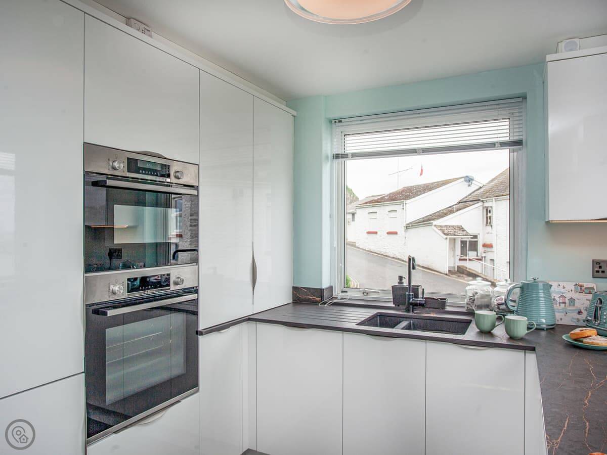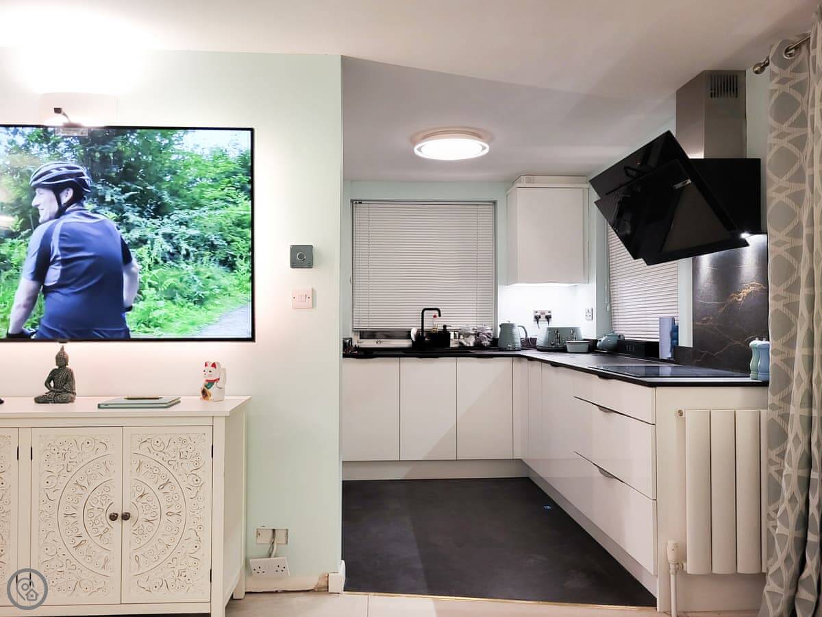 Inside, it’s open plan. Kitchen, living, dining all in one room. The kitchen has a dishwasher and a washing machine. It’s got everything you’d need to cook. The living space has a TV and seating.