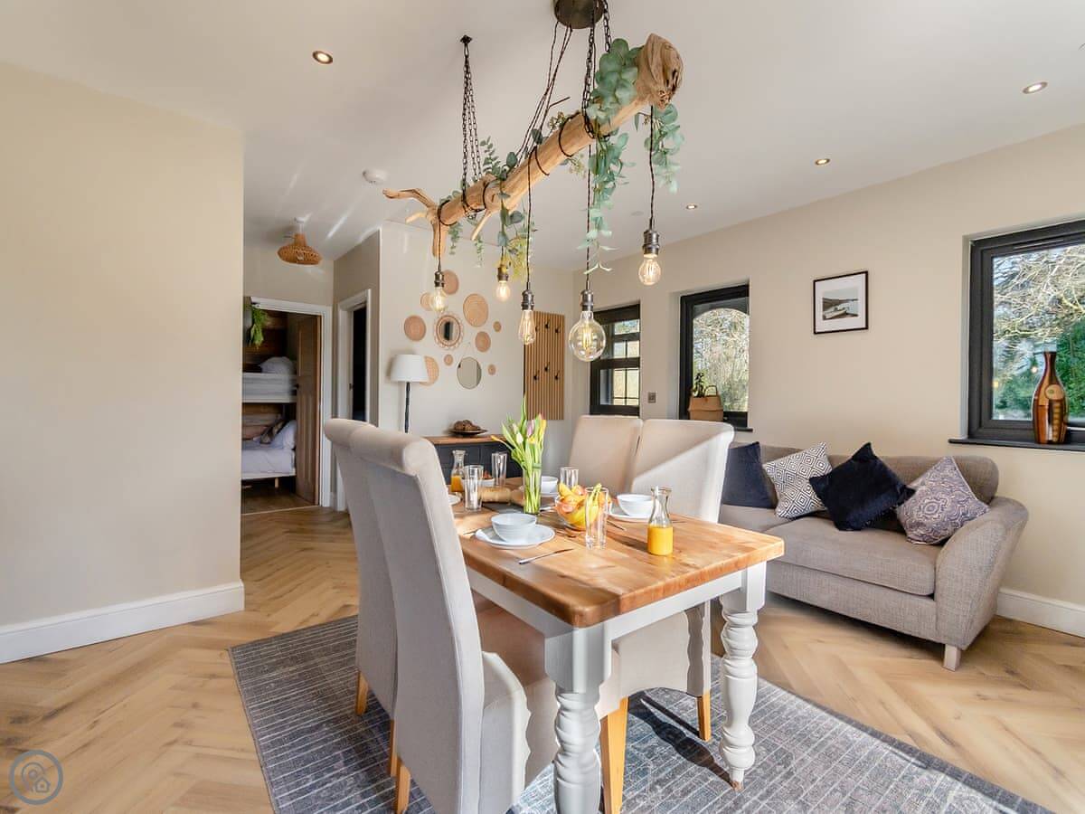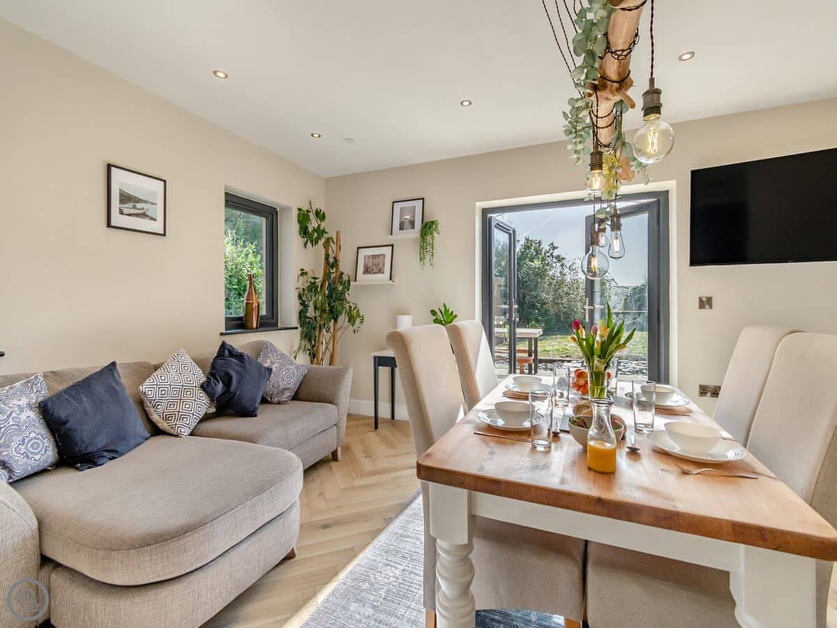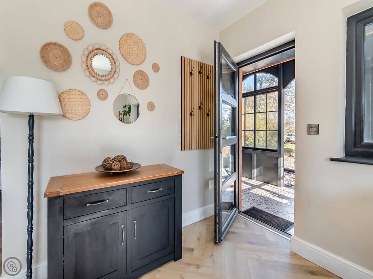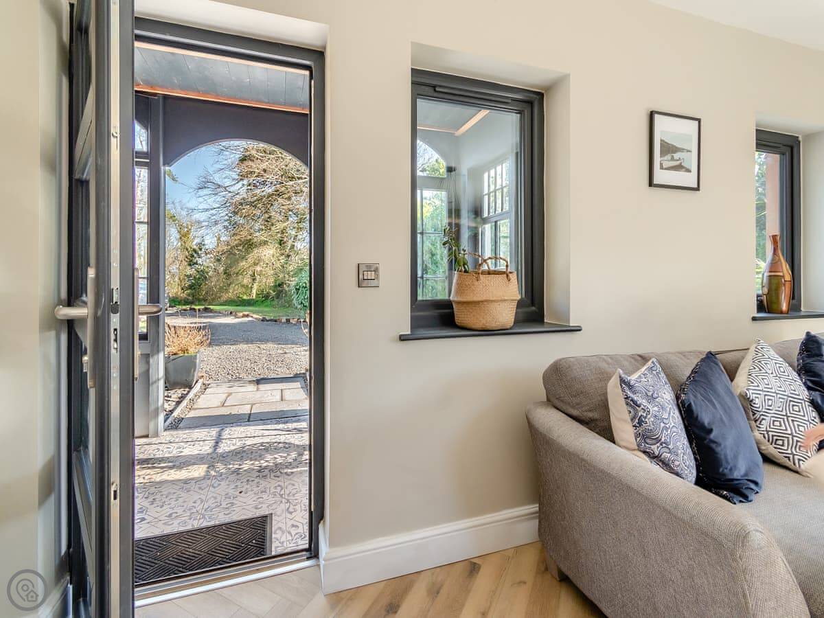You walk into a big open plan room with the kitchen, dining area, and sitting room. The doors go out to a south-facing garden. It's enclosed and mostly lawn.