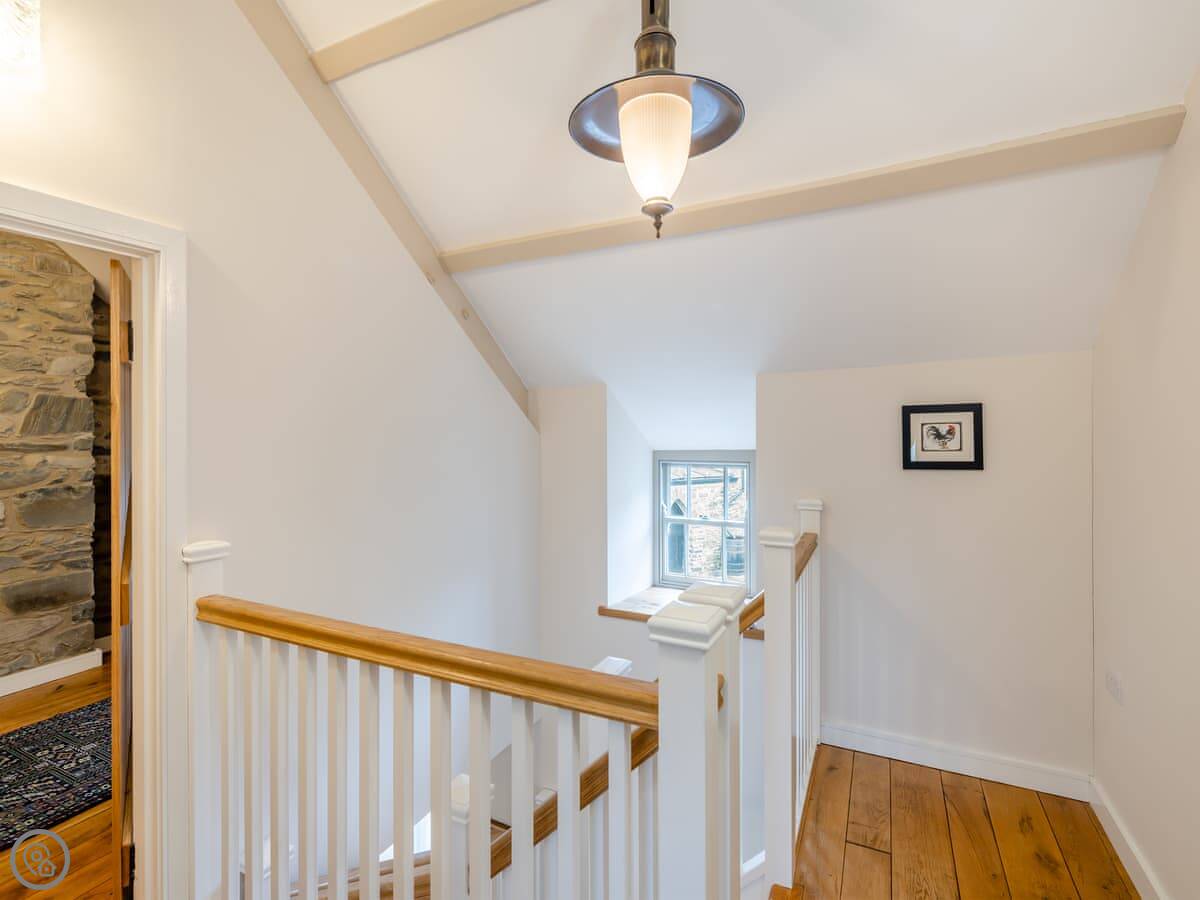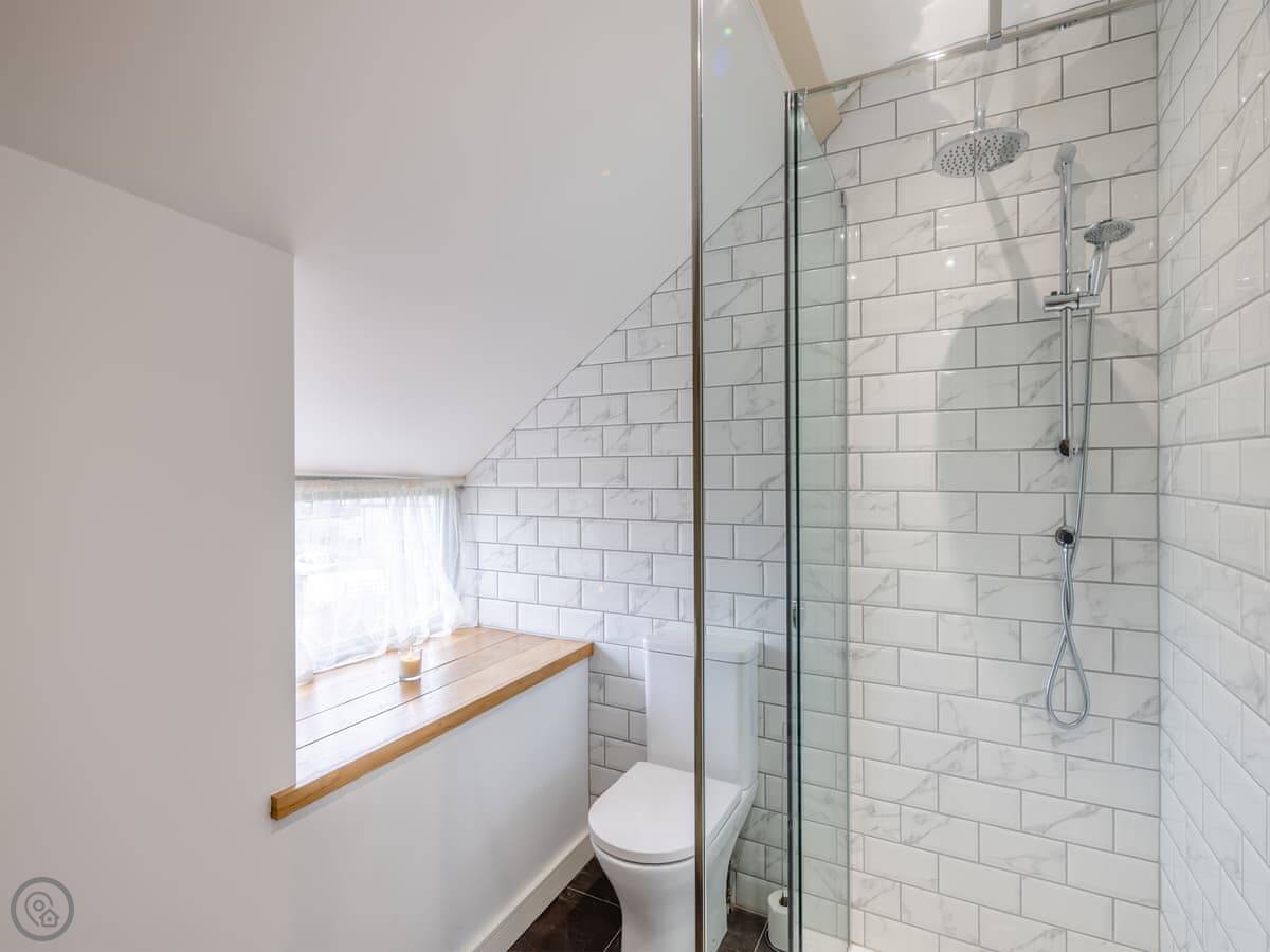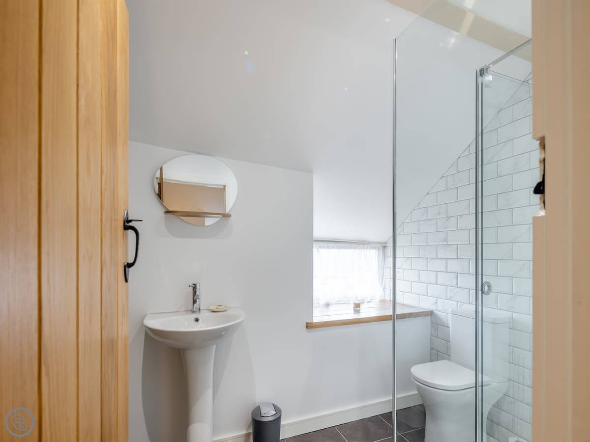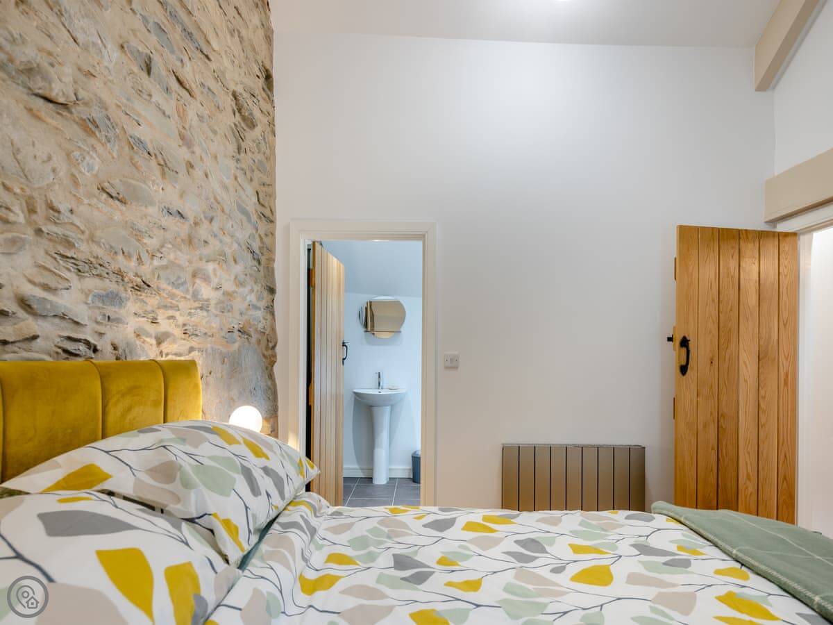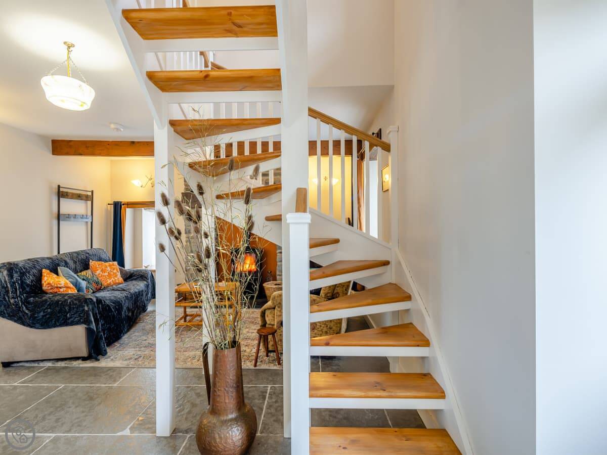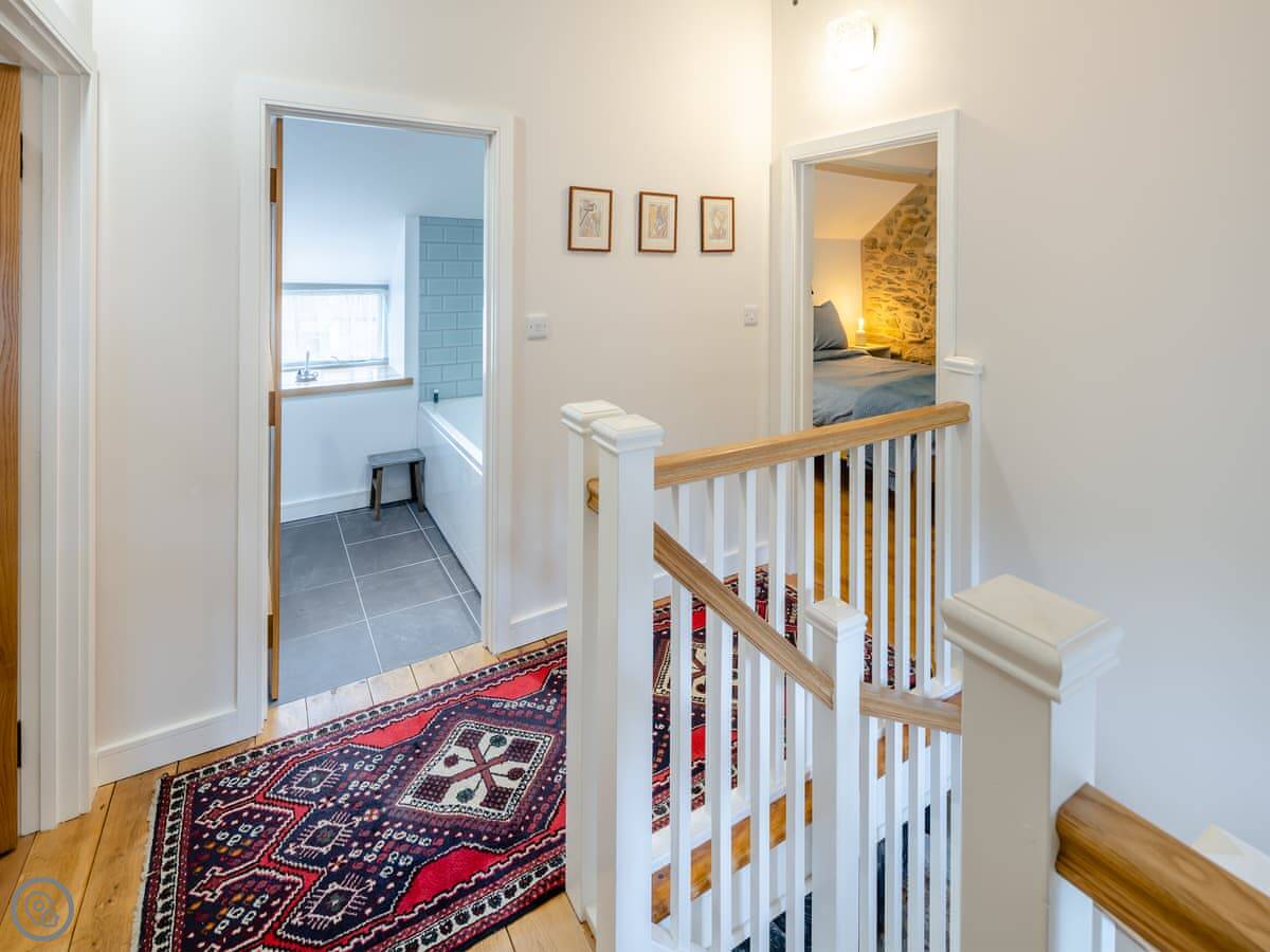 It sleeps four. Two double bedrooms, both ensuite. The main one has a shower room, and there’s a family bathroom with a bath and shower over it. It’s got a 5 Star rating. The stairs are cottage stairs, so they turn a corner and are a bit steep.