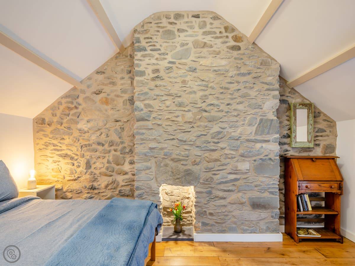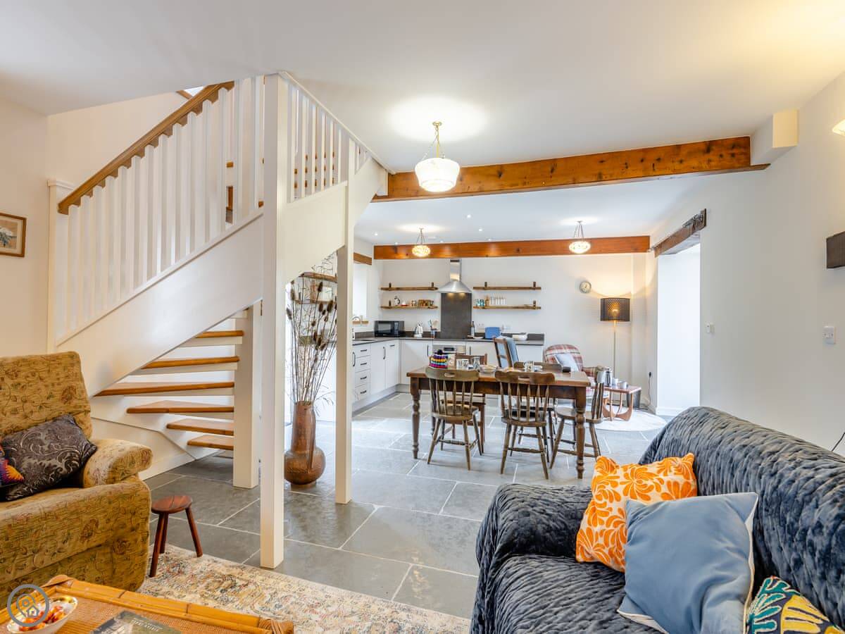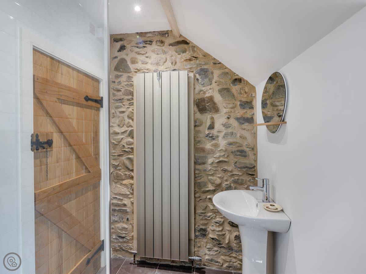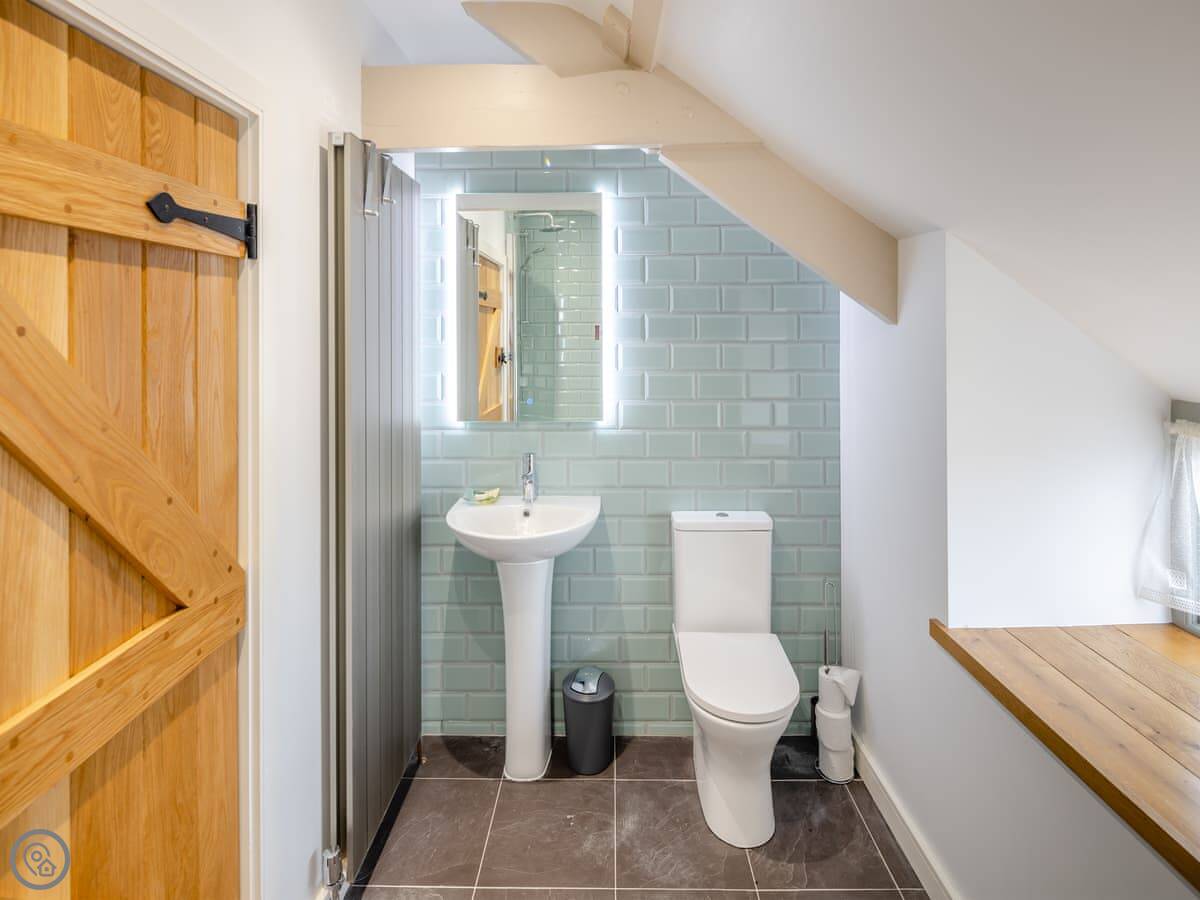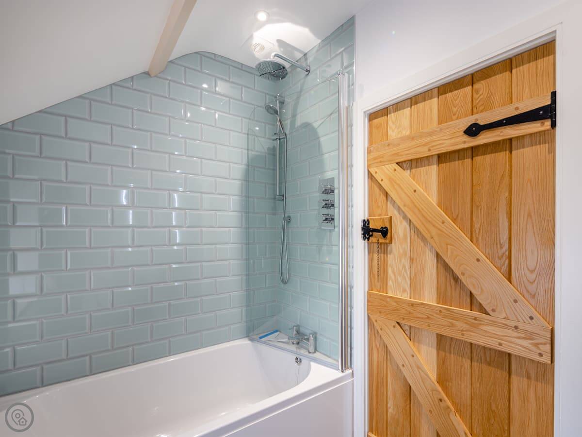 It sleeps four. Two double bedrooms, both ensuite. The main one has a shower room, and there’s a family bathroom with a bath and shower over it. It’s got a 5 Star rating. The stairs are cottage stairs, so they turn a corner and are a bit steep.