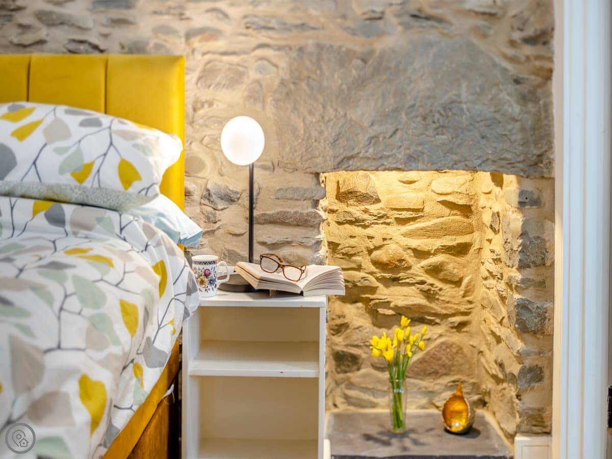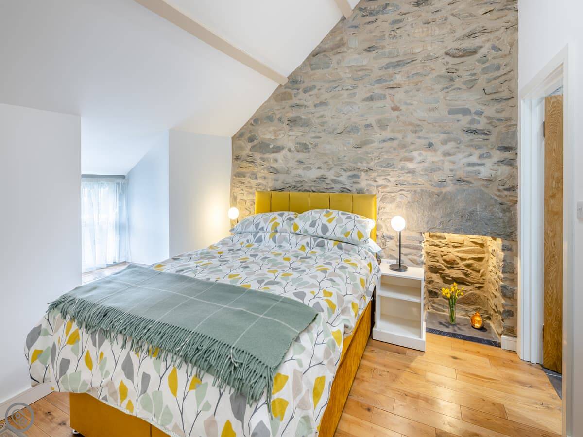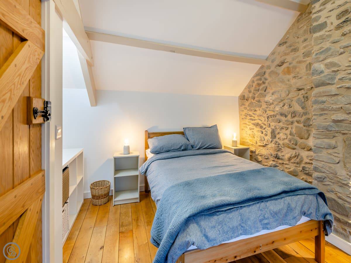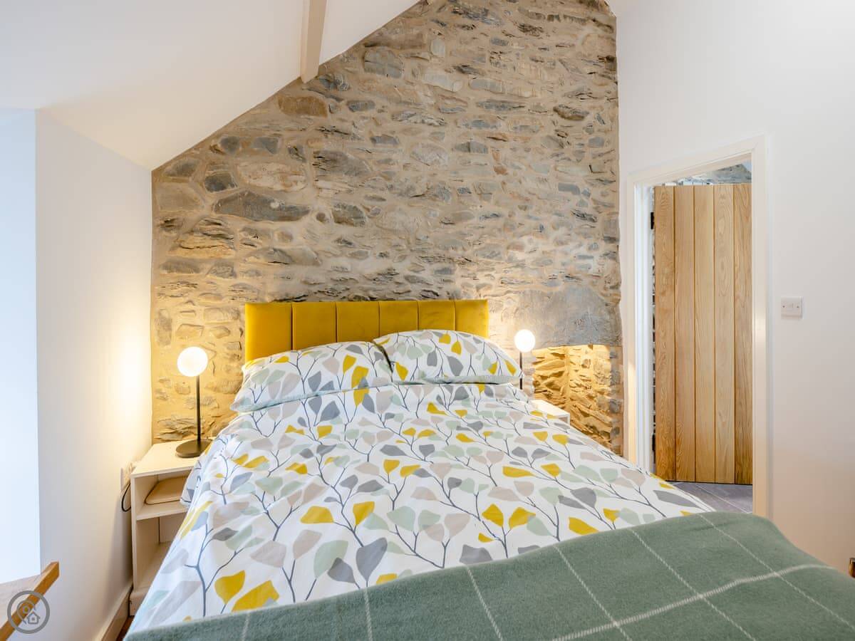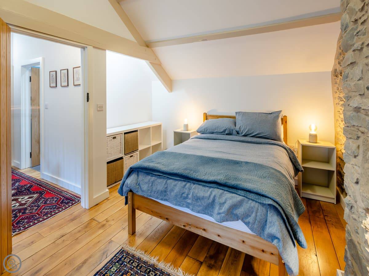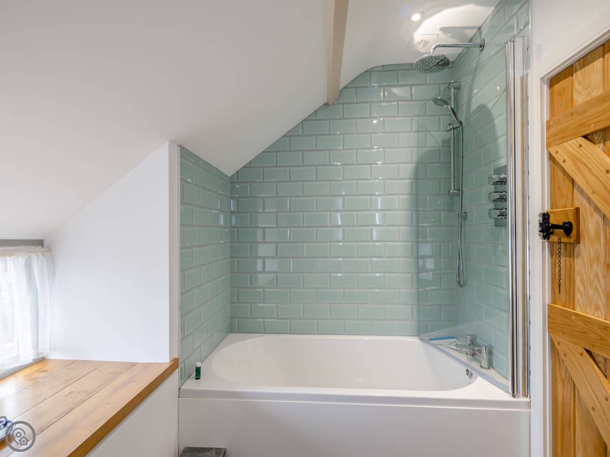 It sleeps four. Two double bedrooms, both ensuite. The main one has a shower room, and there’s a family bathroom with a bath and shower over it. It’s got a 5 Star rating. The stairs are cottage stairs, so they turn a corner and are a bit steep.