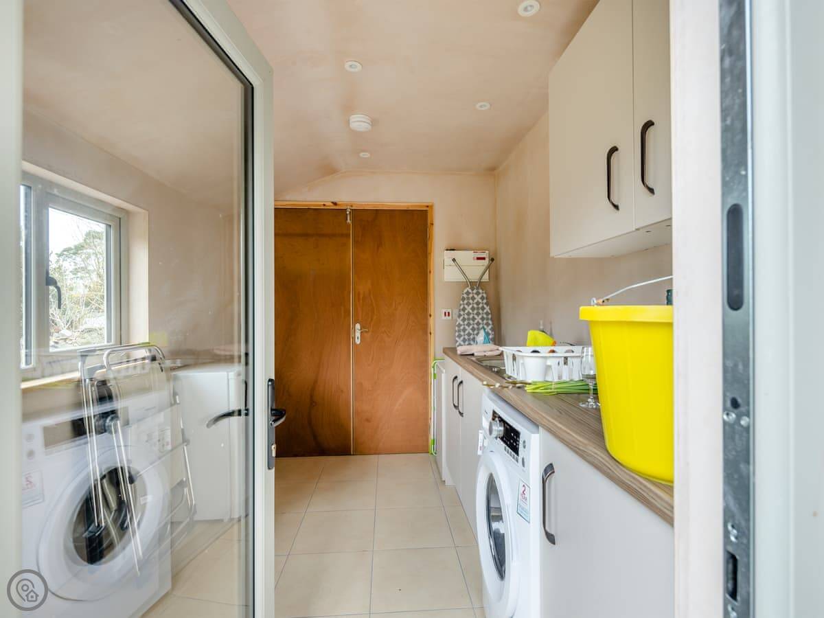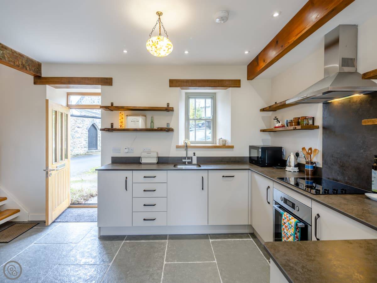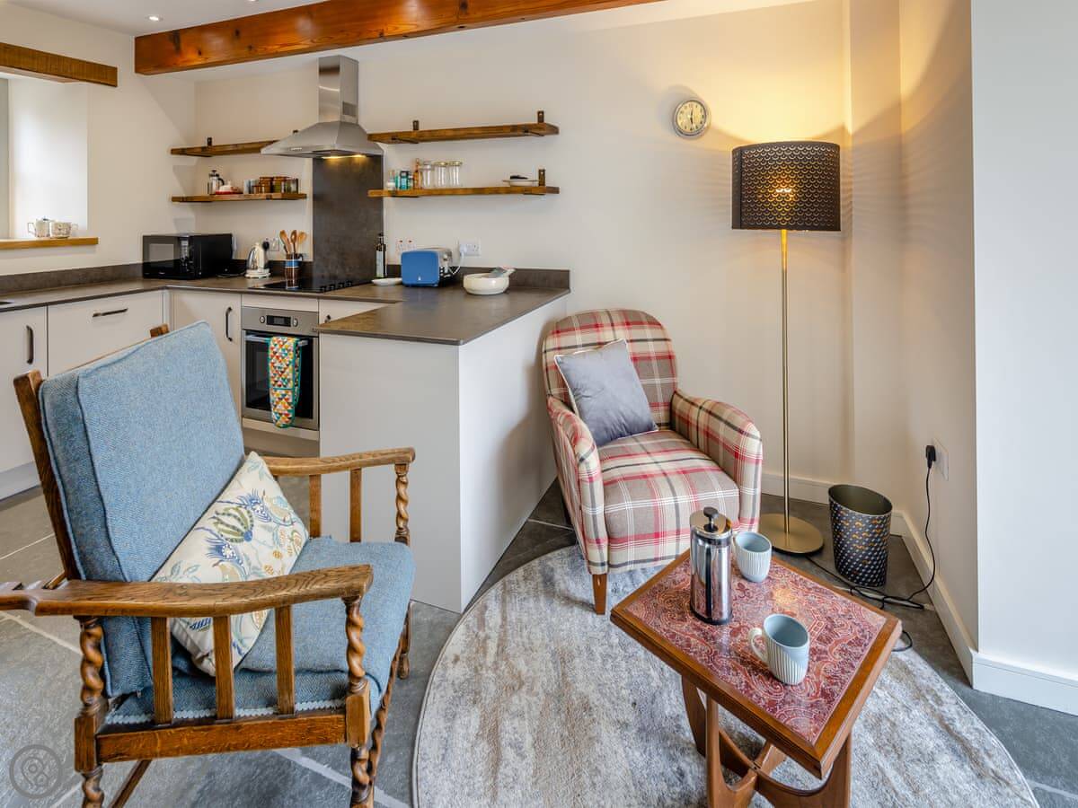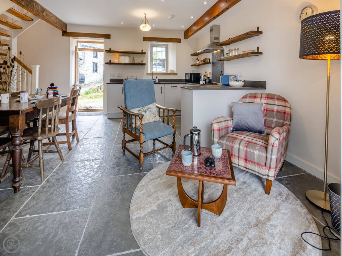 Inside, it’s one open plan room downstairs. Kitchen, dining table, and a sitting area with two sofas. There’s a wood burner. The kitchen has a dishwasher and washing machine. There’s a desk if you need to work. Upstairs, the bedrooms are under the eaves with exposed beams.