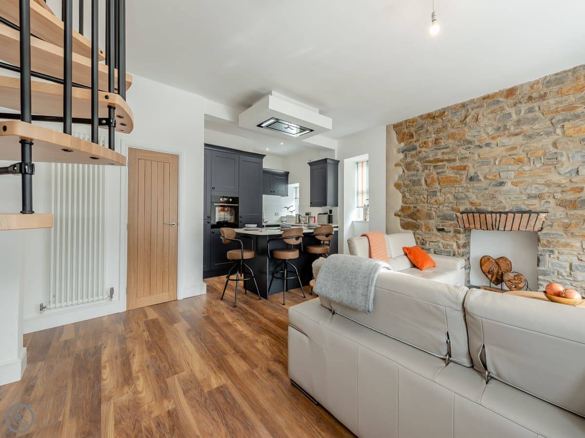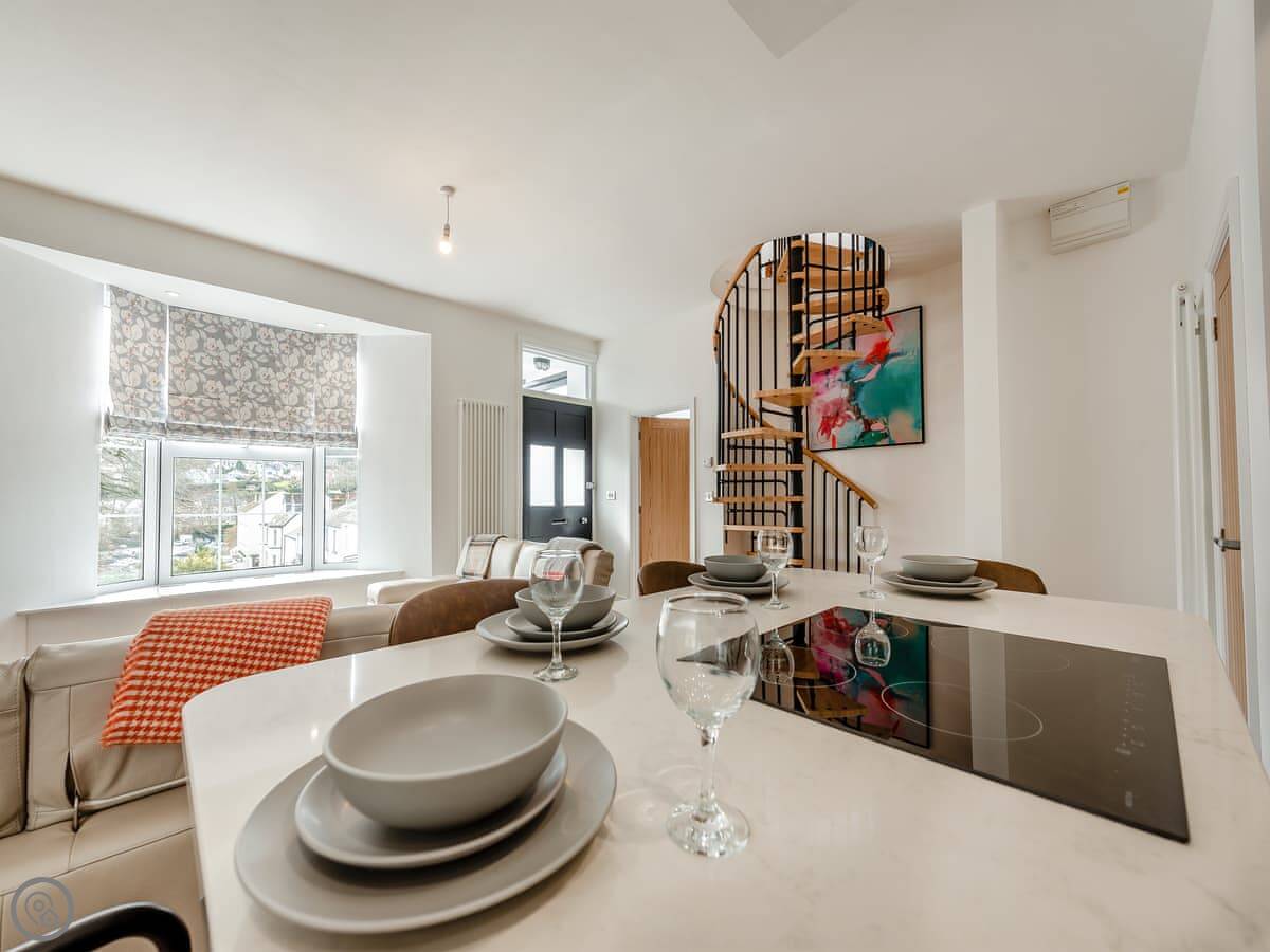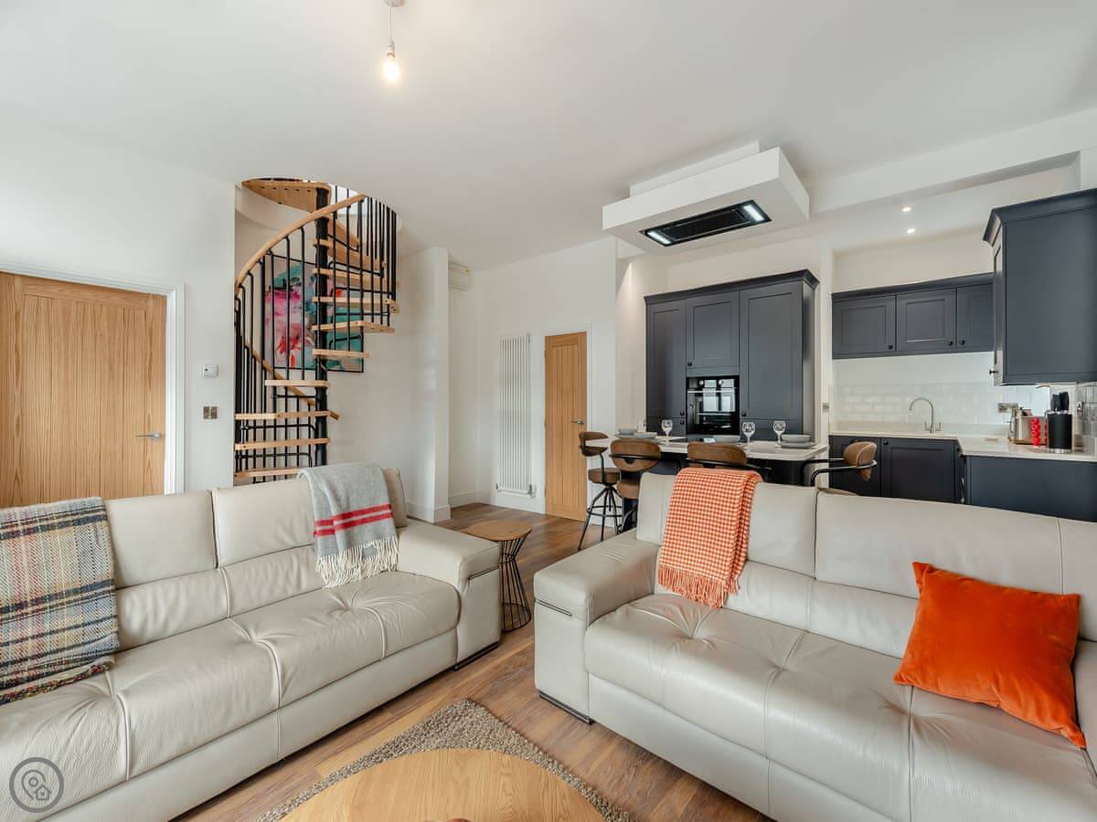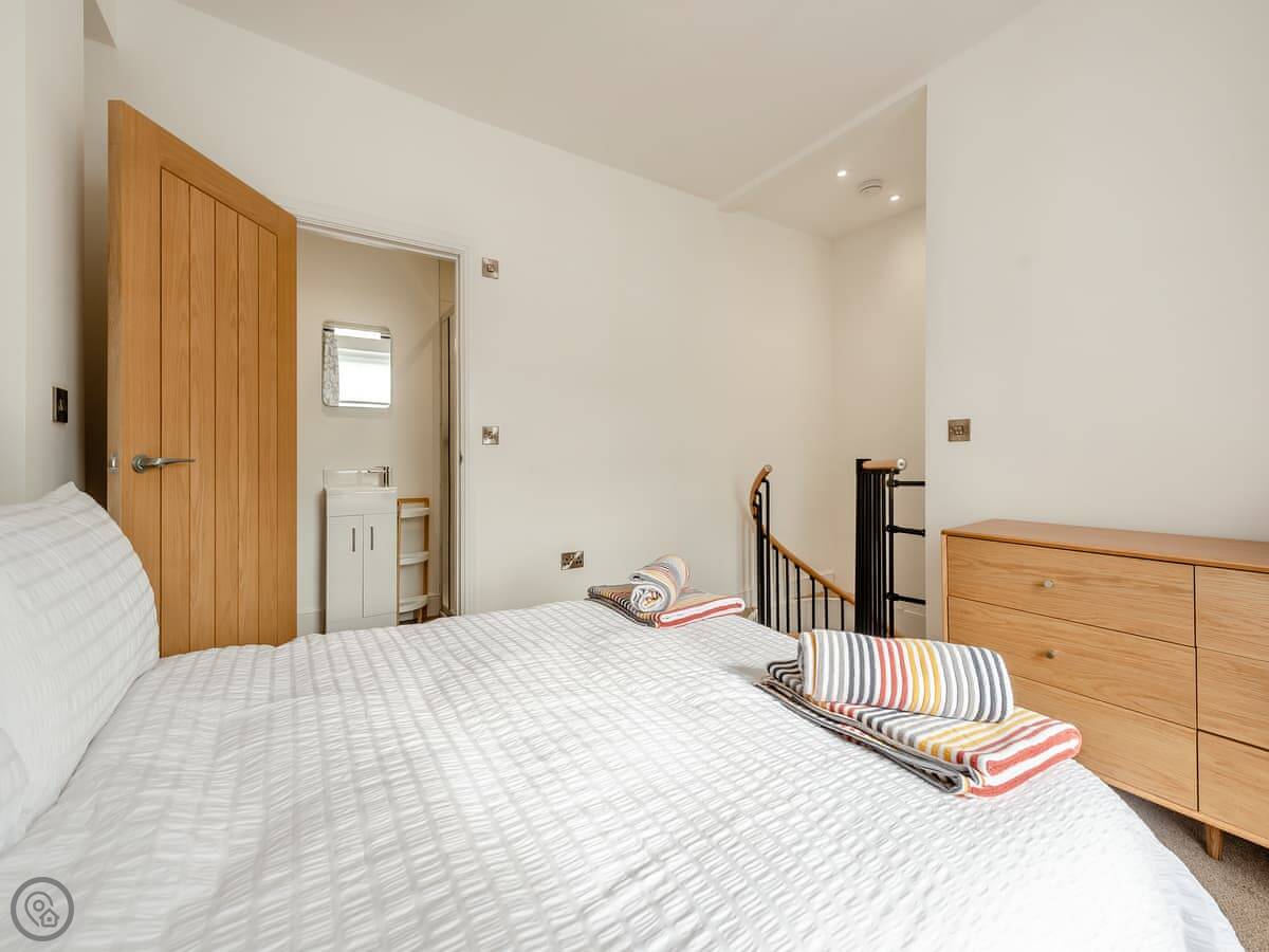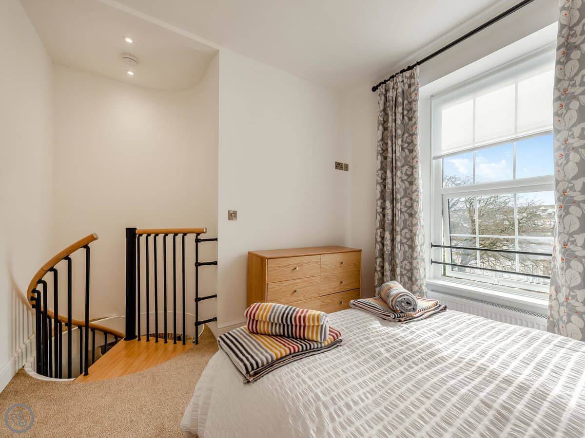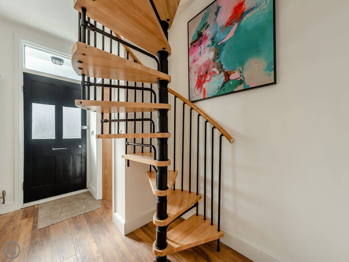 It sleeps four. Two bedrooms, each with its own bathroom. It's got a 5 Star rating. That means it's properly finished with good fittings. The stairs are a spiral staircase. They're steep.