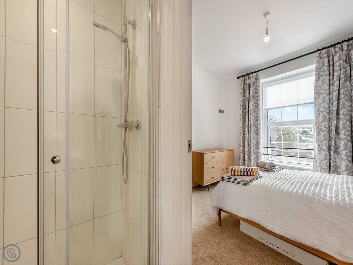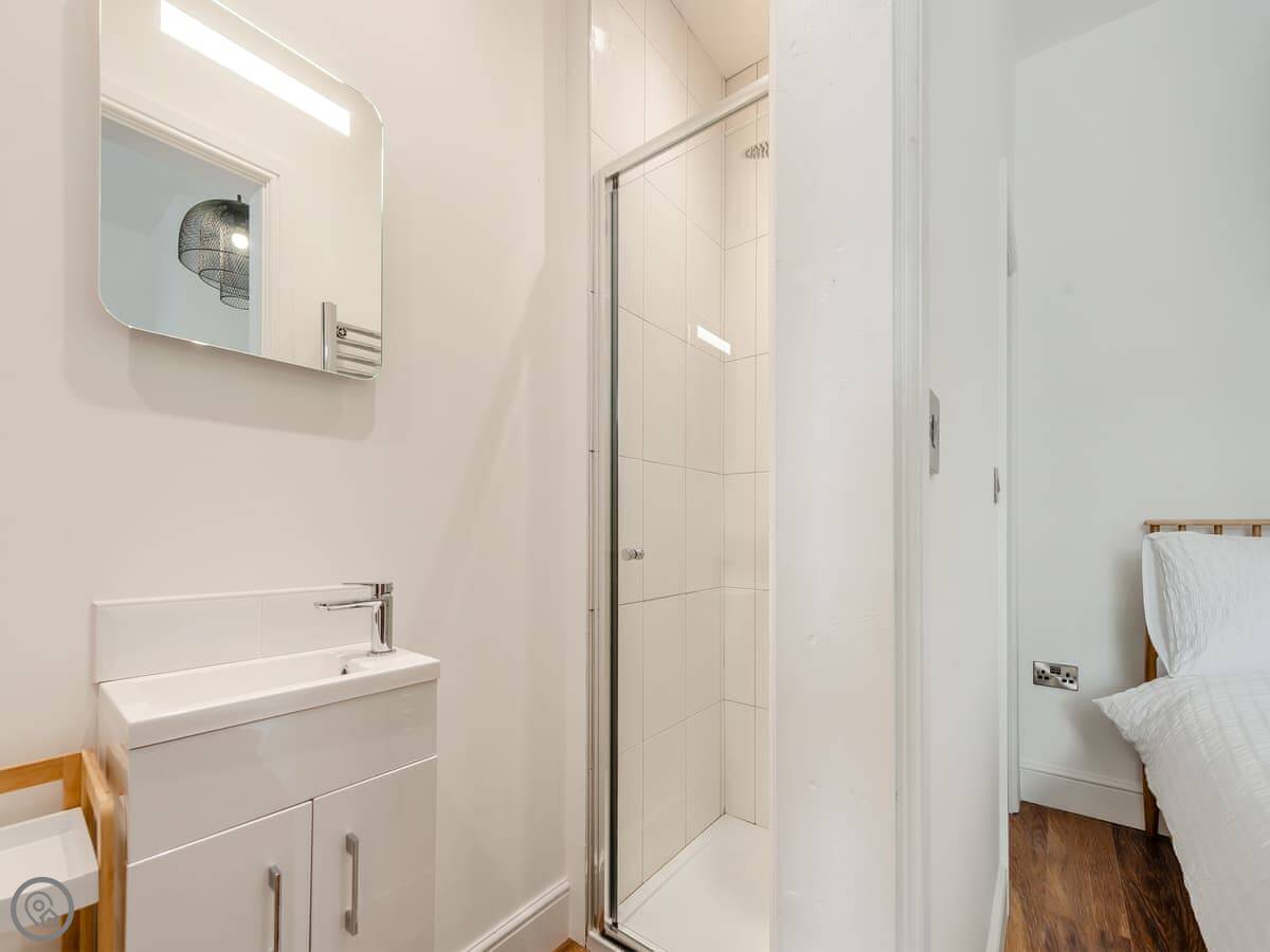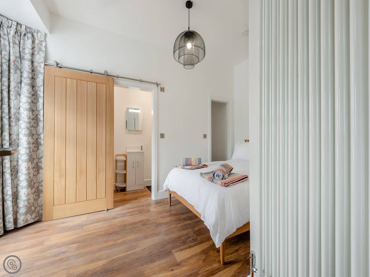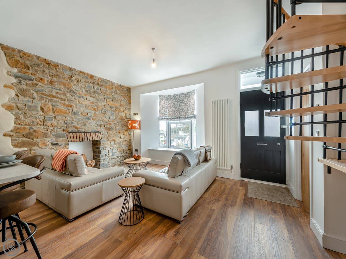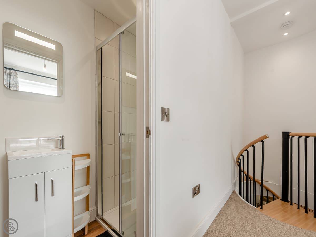 It sleeps four. Two bedrooms, each with its own bathroom. It's got a 5 Star rating. That means it's properly finished with good fittings. The stairs are a spiral staircase. They're steep.