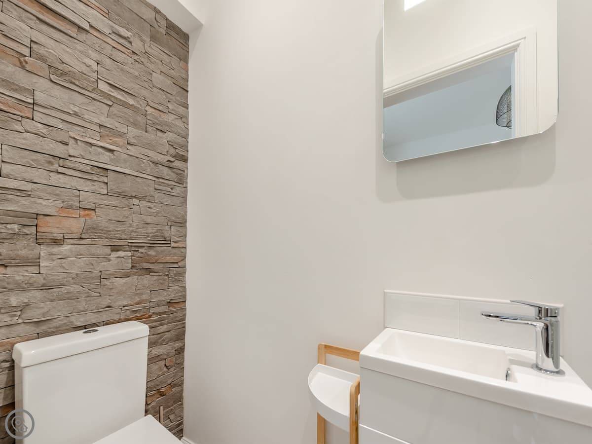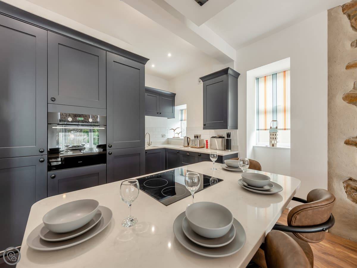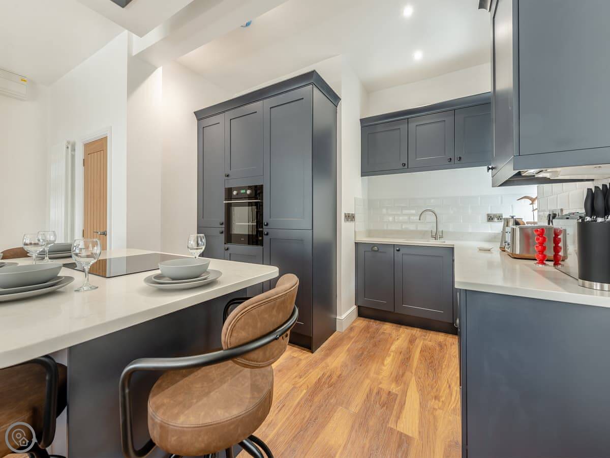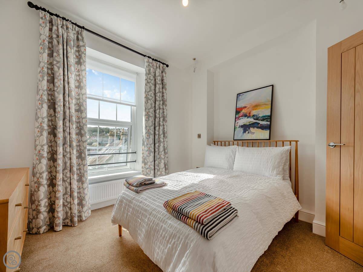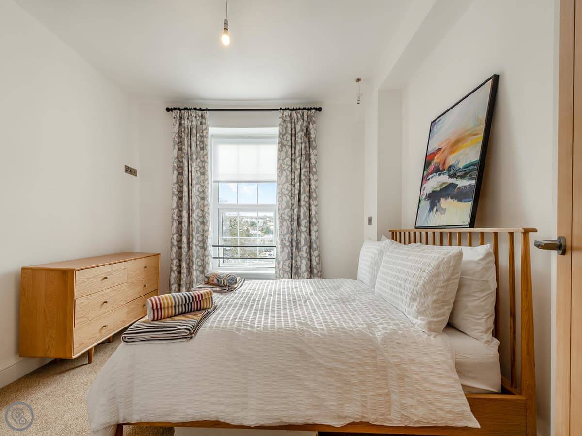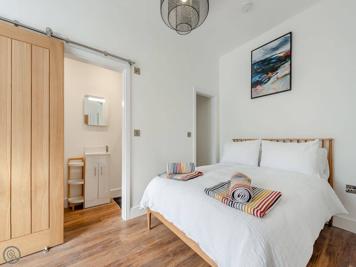 It sleeps four. Two bedrooms, each with its own bathroom. It's got a 5 Star rating. That means it's properly finished with good fittings. The stairs are a spiral staircase. They're steep.