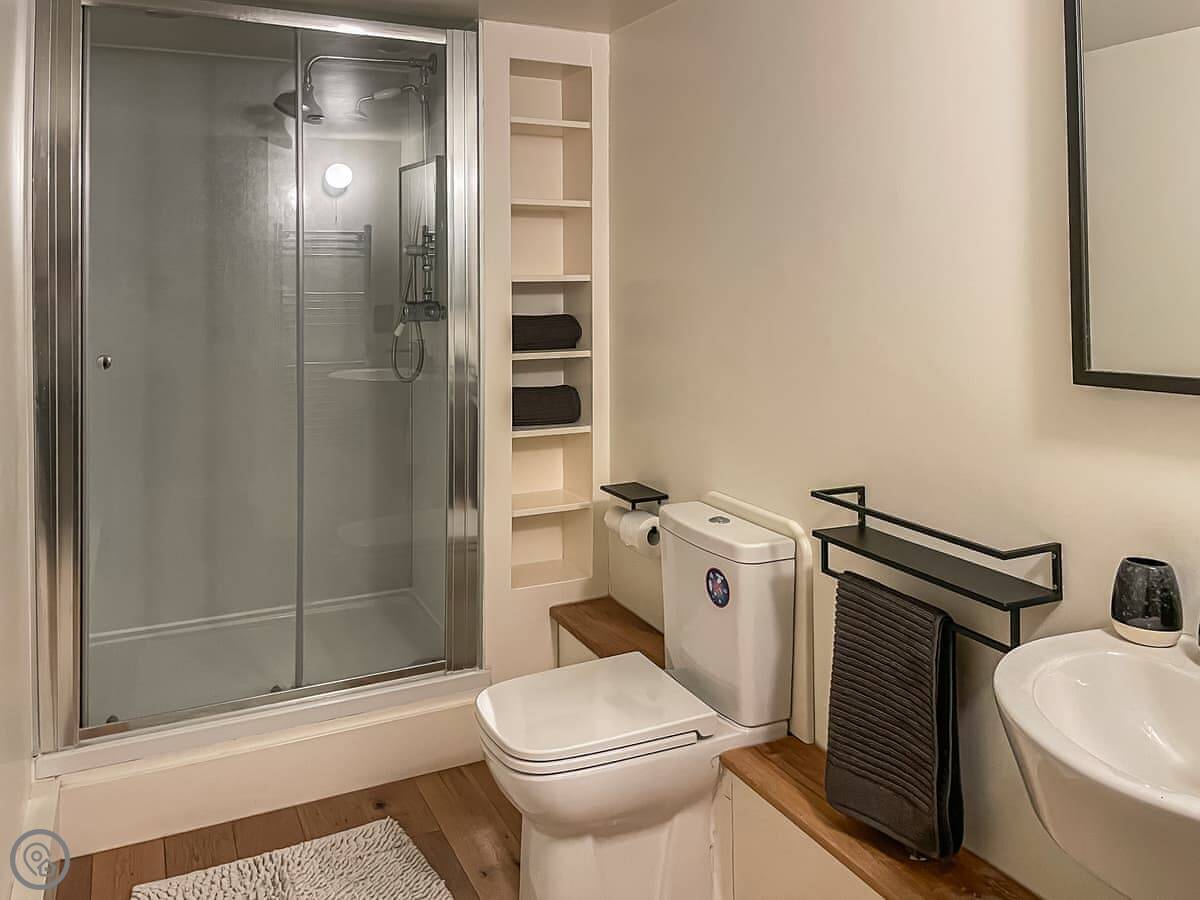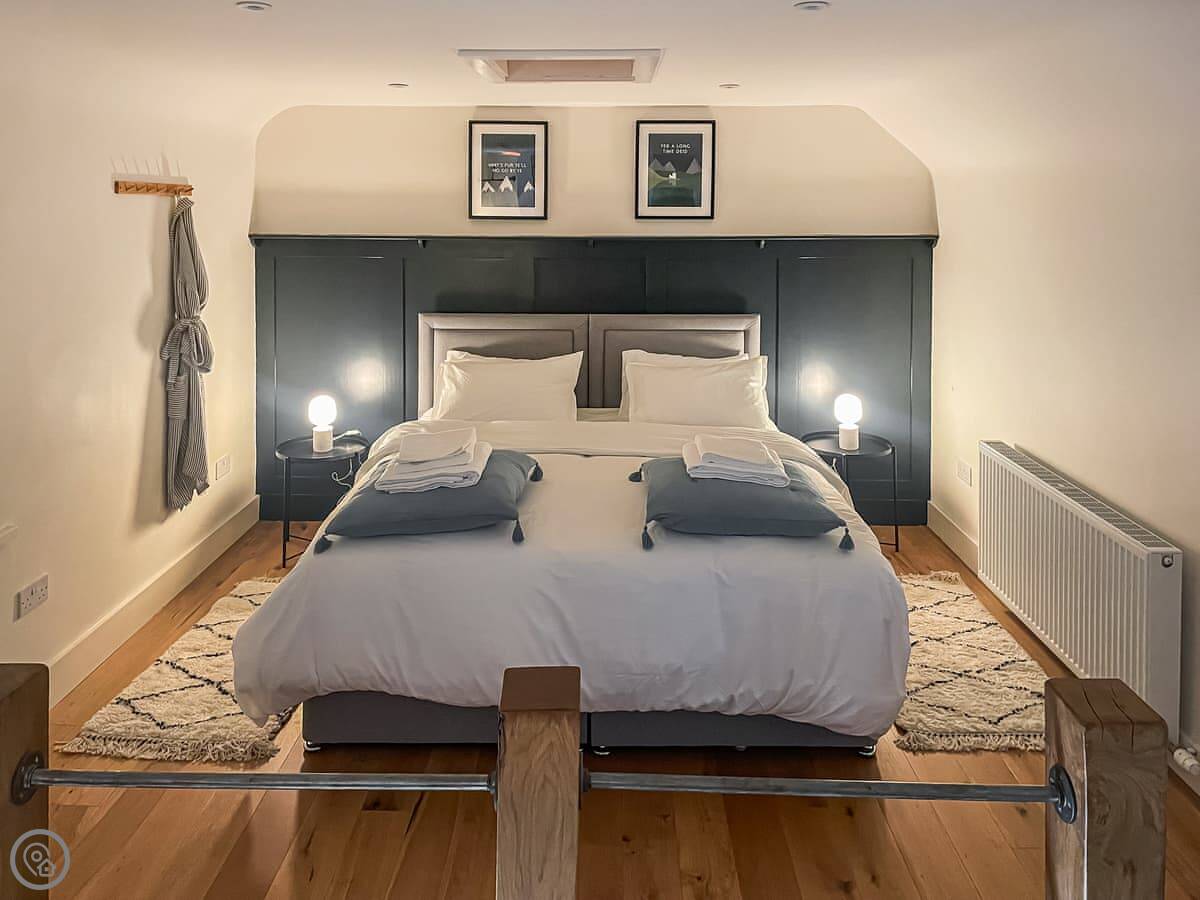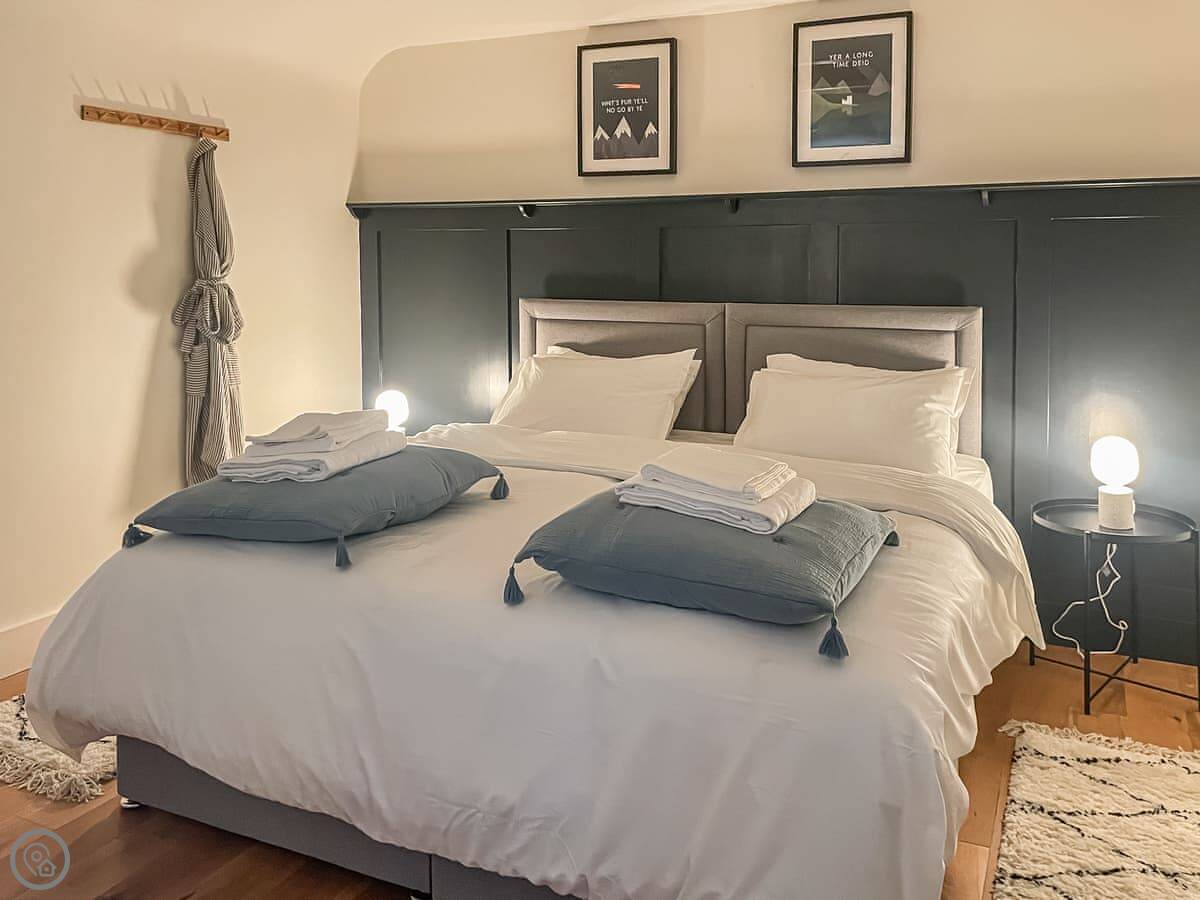 It sleeps three. There's one bedroom upstairs with a super king bed and a double sofa bed. One bathroom with a shower downstairs. It's a 4 Star place, so it's comfortable and well looked after. The stairs are a bit steep. They're okay, but mind your head.