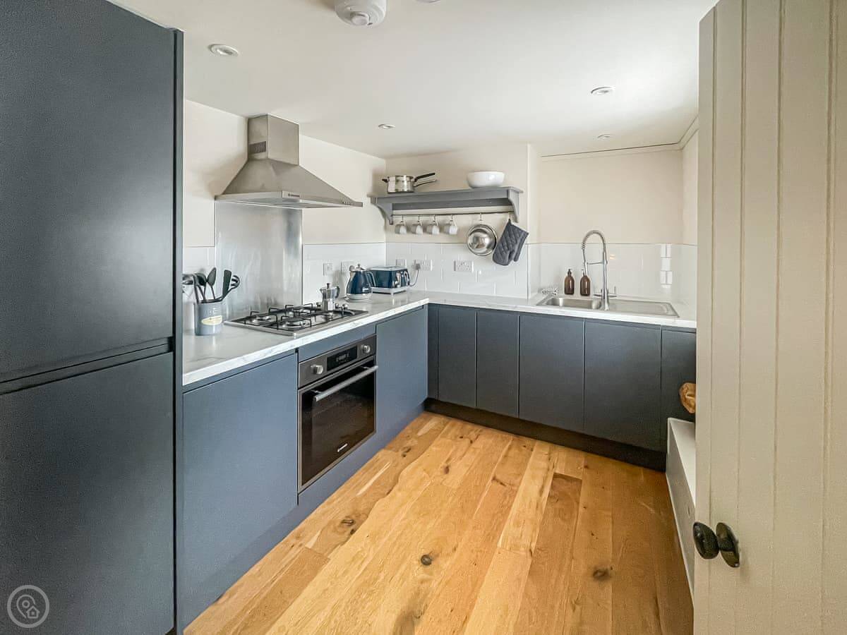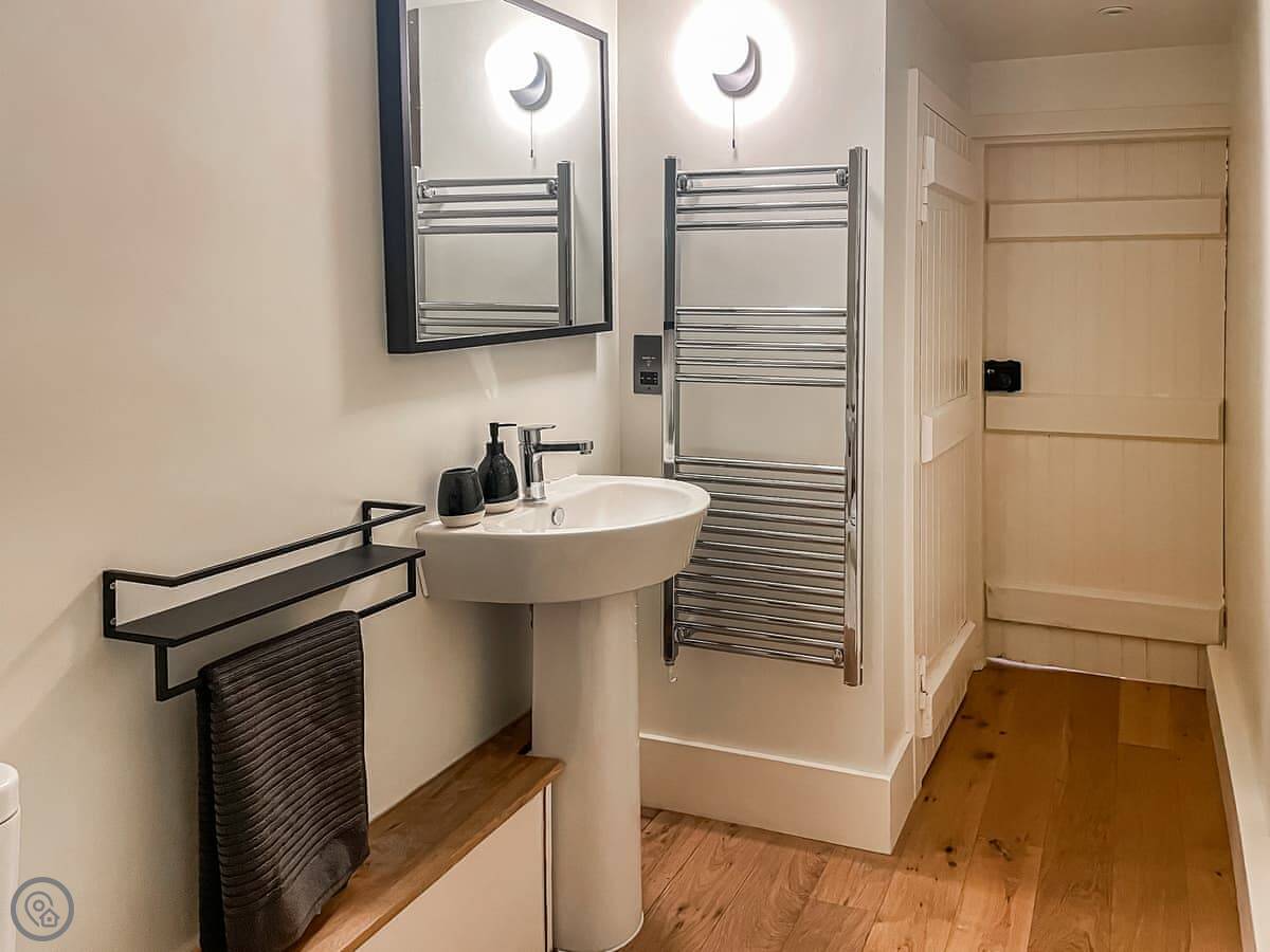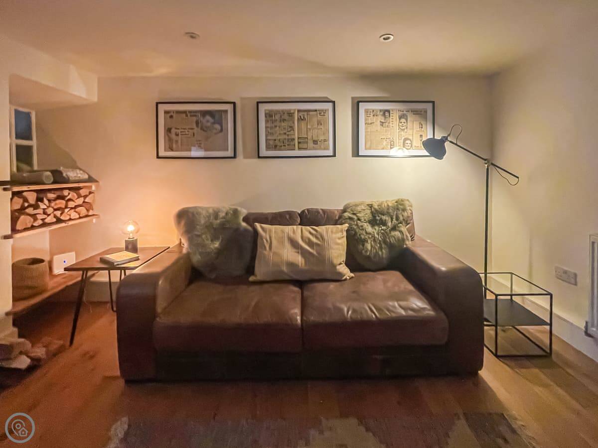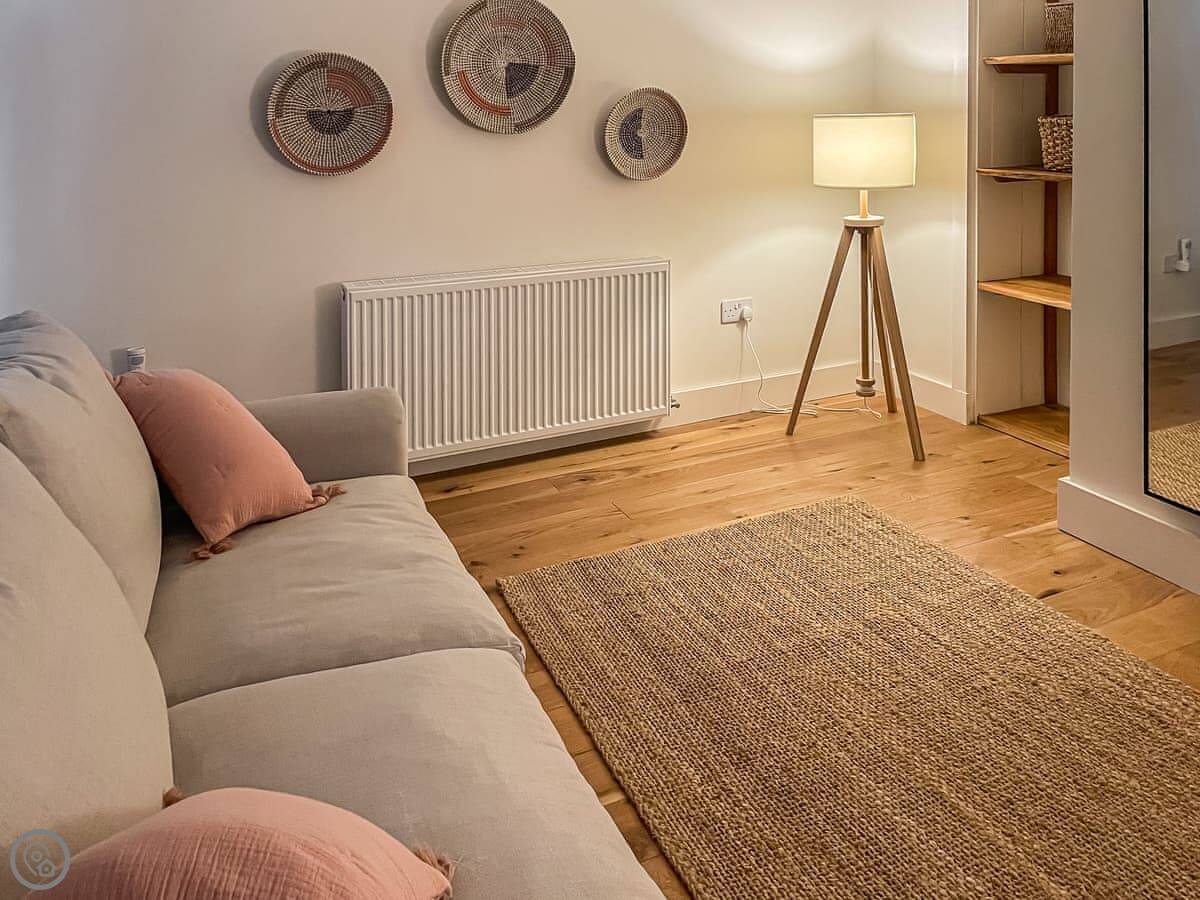 It sleeps three. There's one bedroom upstairs with a super king bed and a double sofa bed. One bathroom with a shower downstairs. It's a 4 Star place, so it's comfortable and well looked after. The stairs are a bit steep. They're okay, but mind your head.