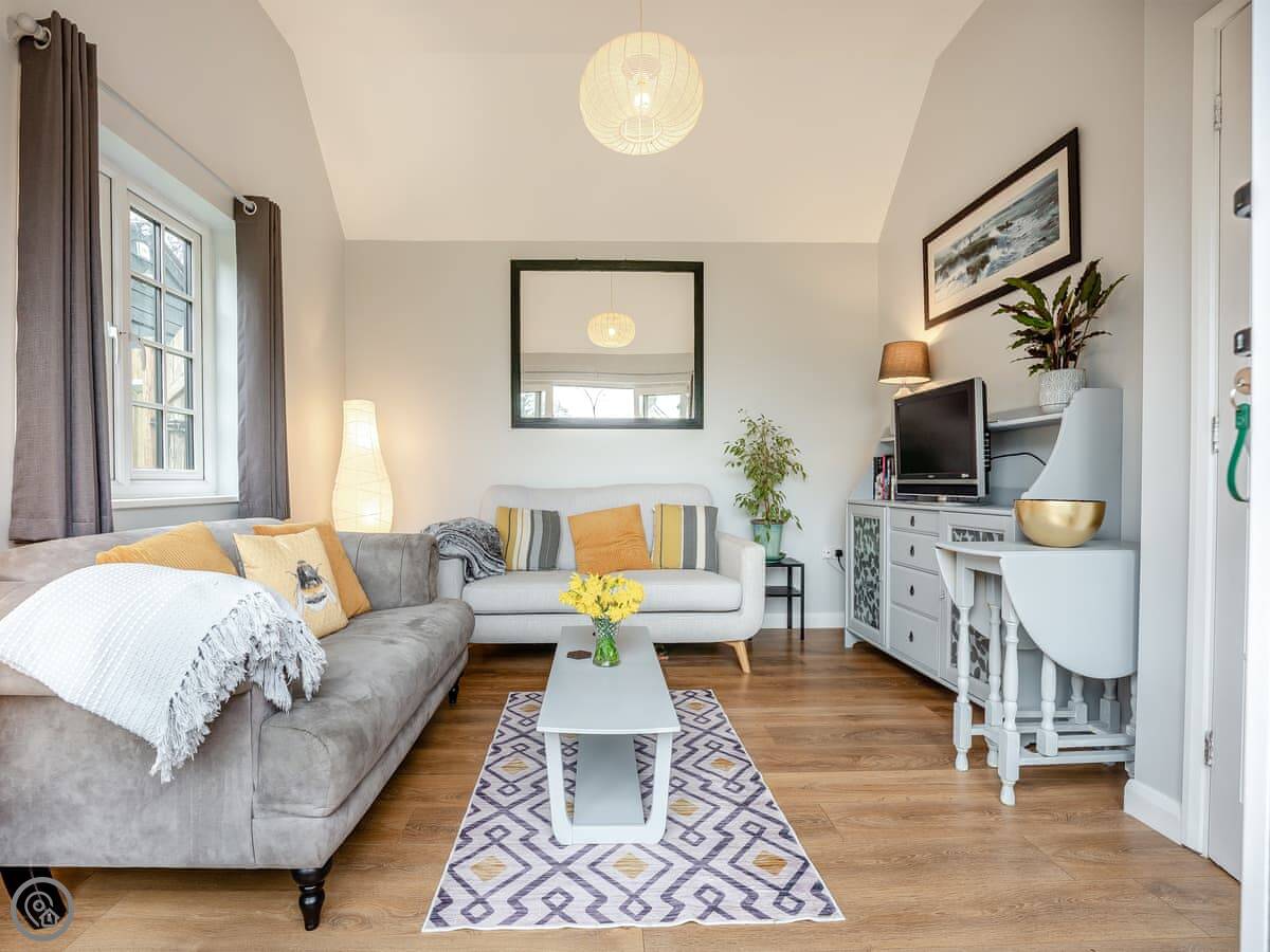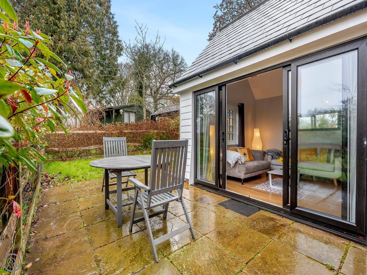 It's a five-star property. That means it's been done up really well, not that it's huge. It's just for two people. One bedroom, one bathroom. The bathroom has a walk-in shower. The living room has French doors that open onto your own patio and a small garden. There's a fire pit out there.