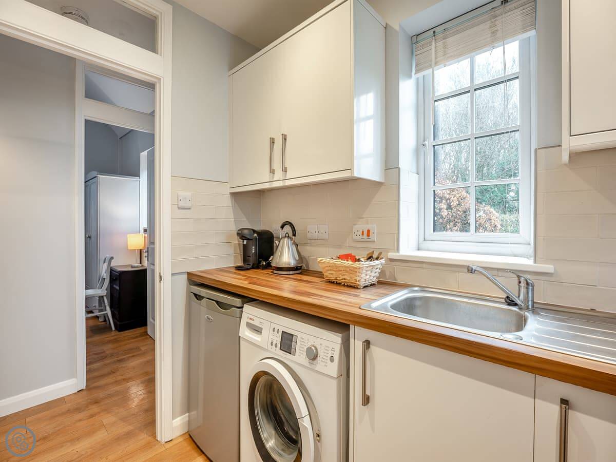The kitchen is small but it's got everything you need. There's a washing machine. Bedding and towels are included.