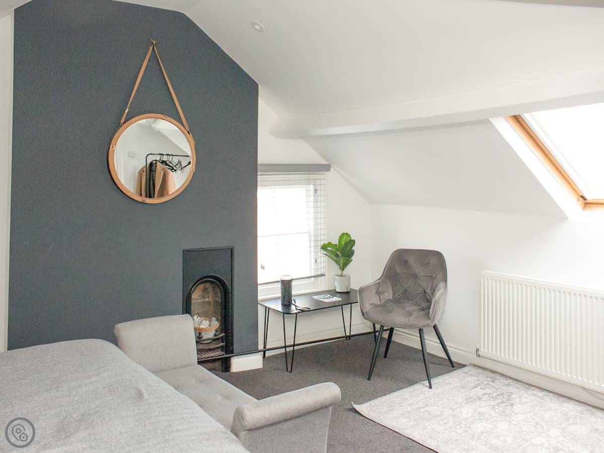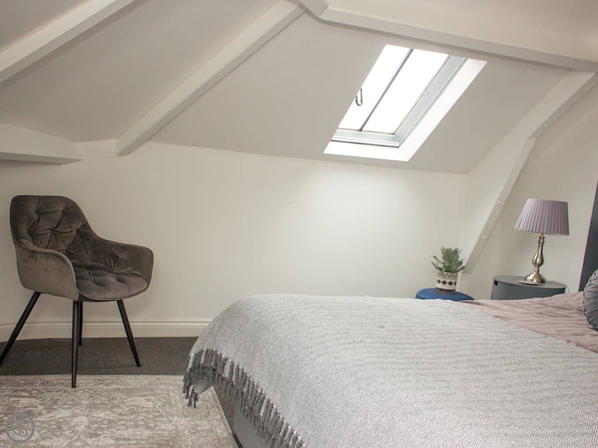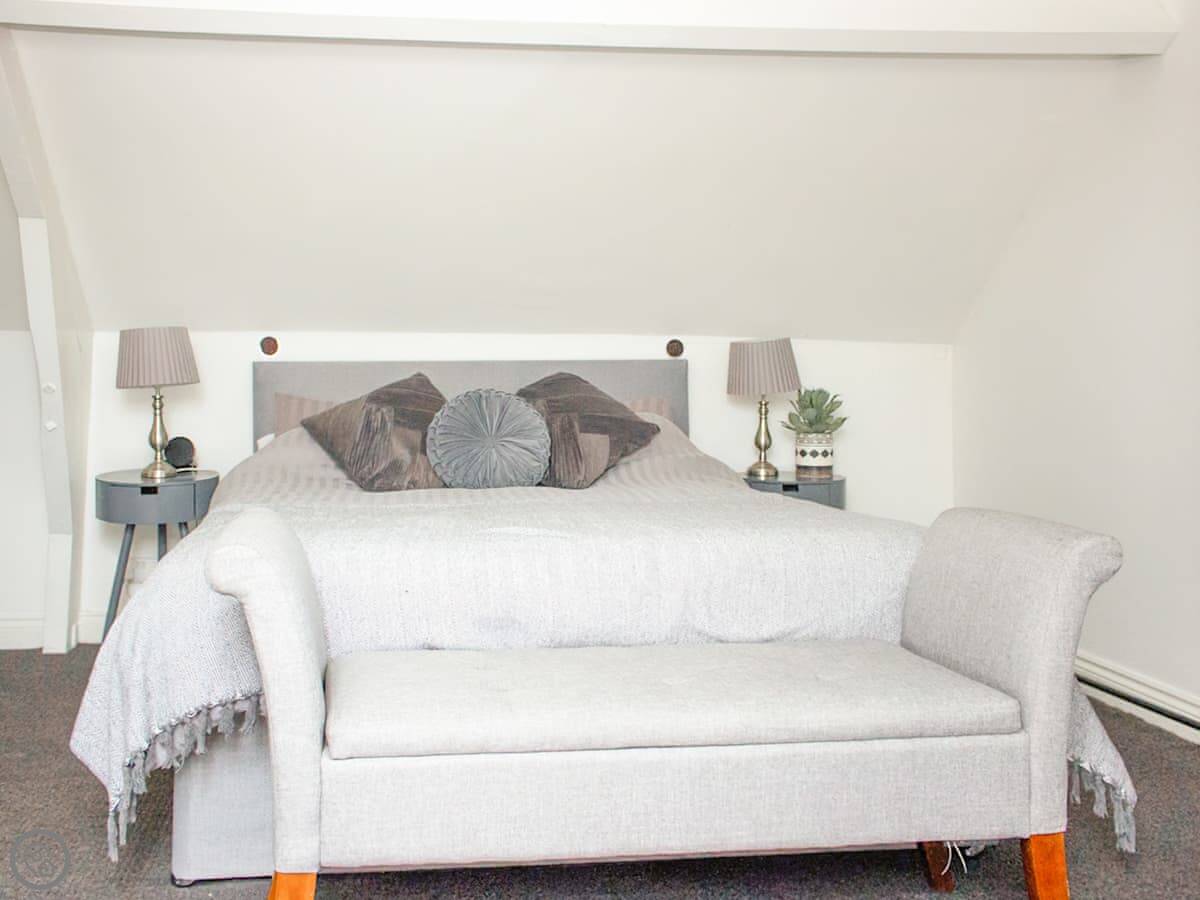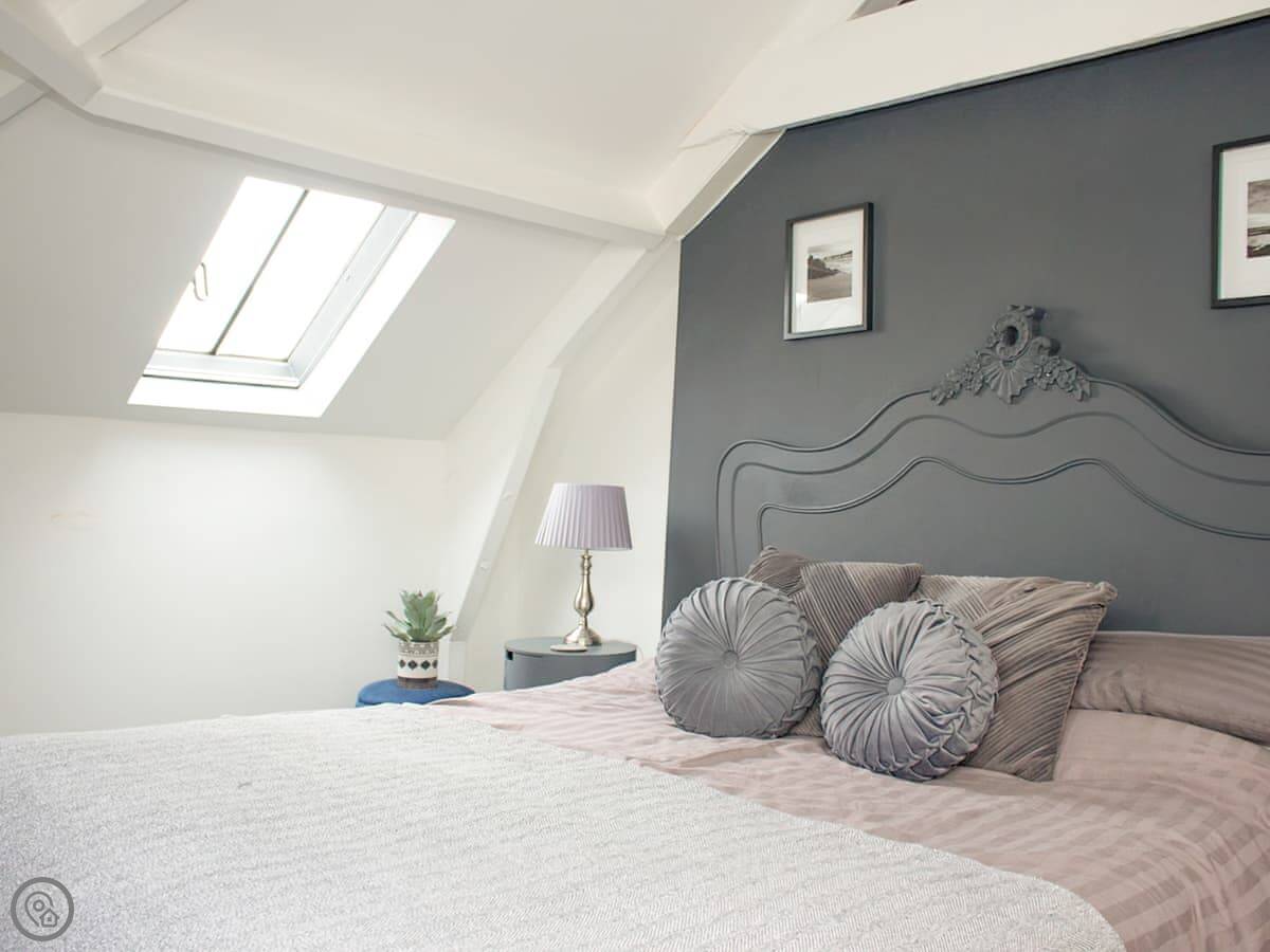 Inside you have the living area, with a sofa and armchairs as well as an electric stove beneath the chandelier. The kitchen is open plan with the dining area, with a large central dining table with upholstered benches making this a wonderful, comfortable social space where you can wind down in an evening, enjoying home cooked meals as well as a bottle or two of something special. You also have the spacious bathroom on this floor with the choice of both a bath or a shower. The bedrooms are both on the top floor beneath beamed vaulted ceilings, they are both characterful and beautifully dressed, with an en suite toilet each. The windows up here give you fabulous views over the town at different angles, so that you can enjoy many of the landmarks.