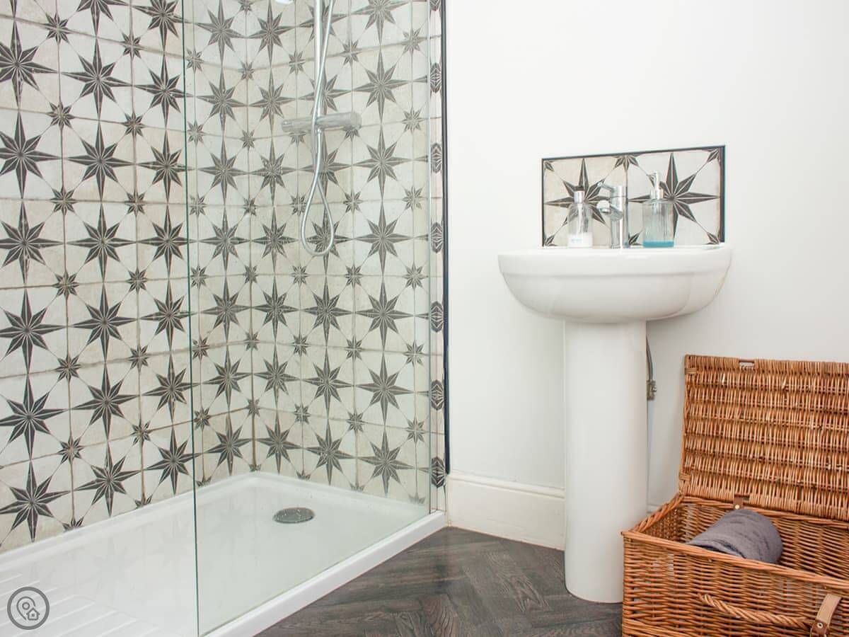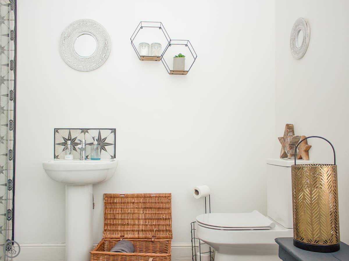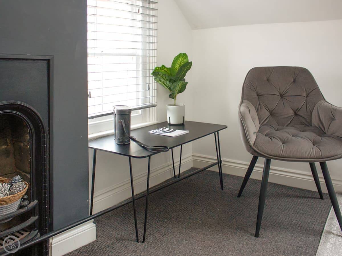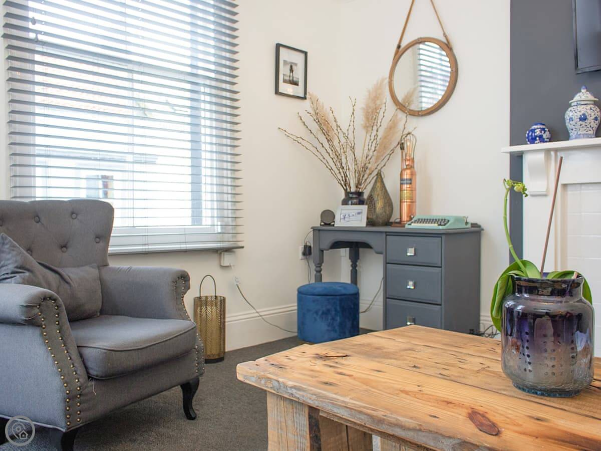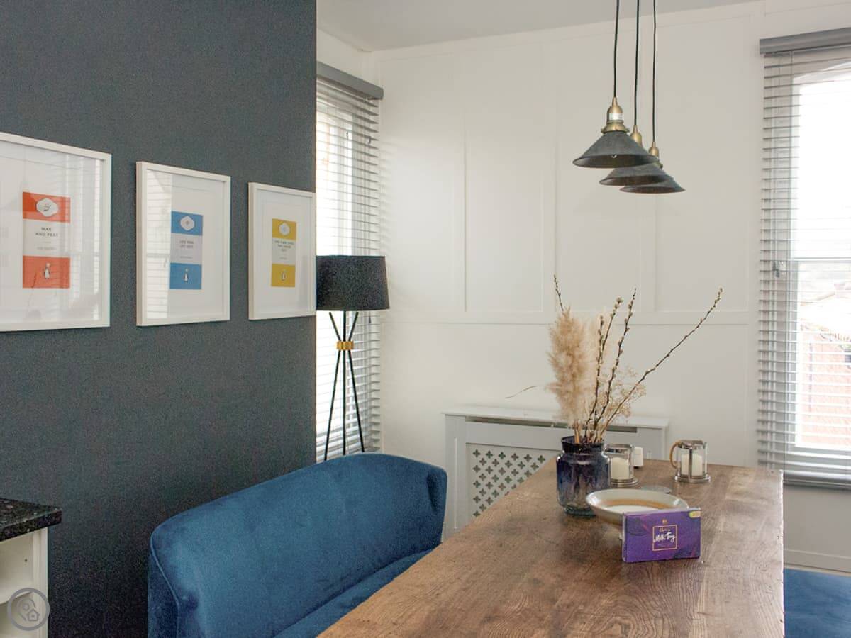 Inside you have the living area, with a sofa and armchairs as well as an electric stove beneath the chandelier. The kitchen is open plan with the dining area, with a large central dining table with upholstered benches making this a wonderful, comfortable social space where you can wind down in an evening, enjoying home cooked meals as well as a bottle or two of something special. You also have the spacious bathroom on this floor with the choice of both a bath or a shower. The bedrooms are both on the top floor beneath beamed vaulted ceilings, they are both characterful and beautifully dressed, with an en suite toilet each. The windows up here give you fabulous views over the town at different angles, so that you can enjoy many of the landmarks.