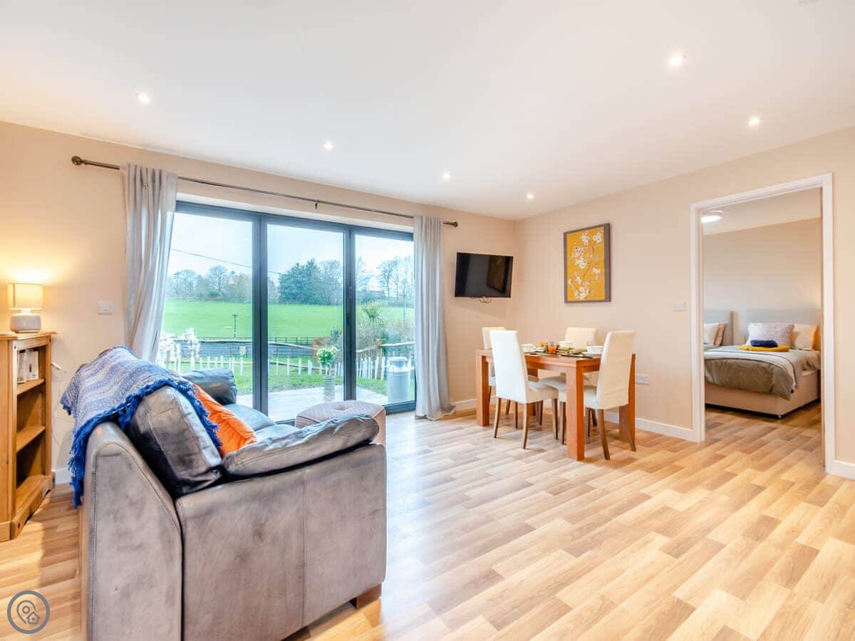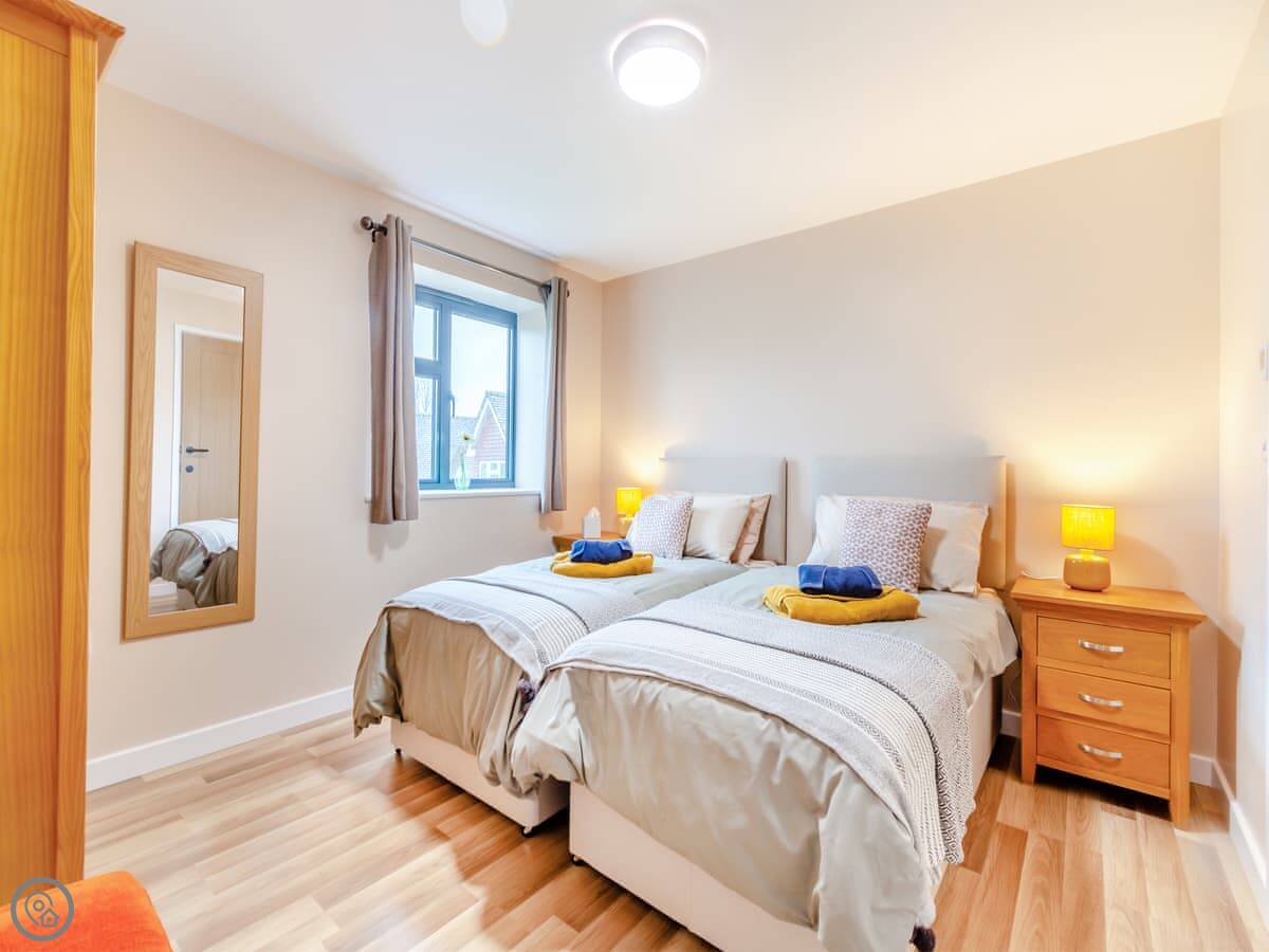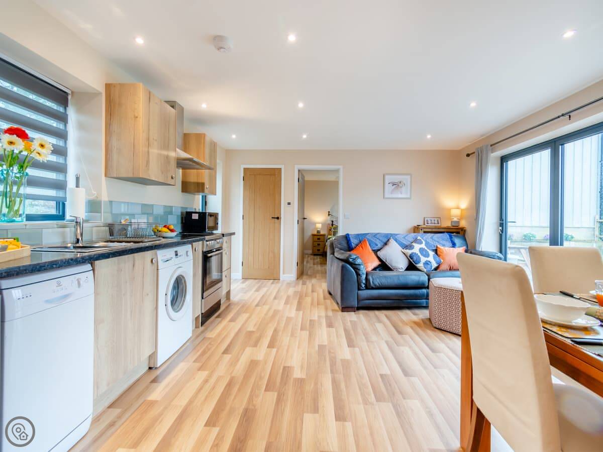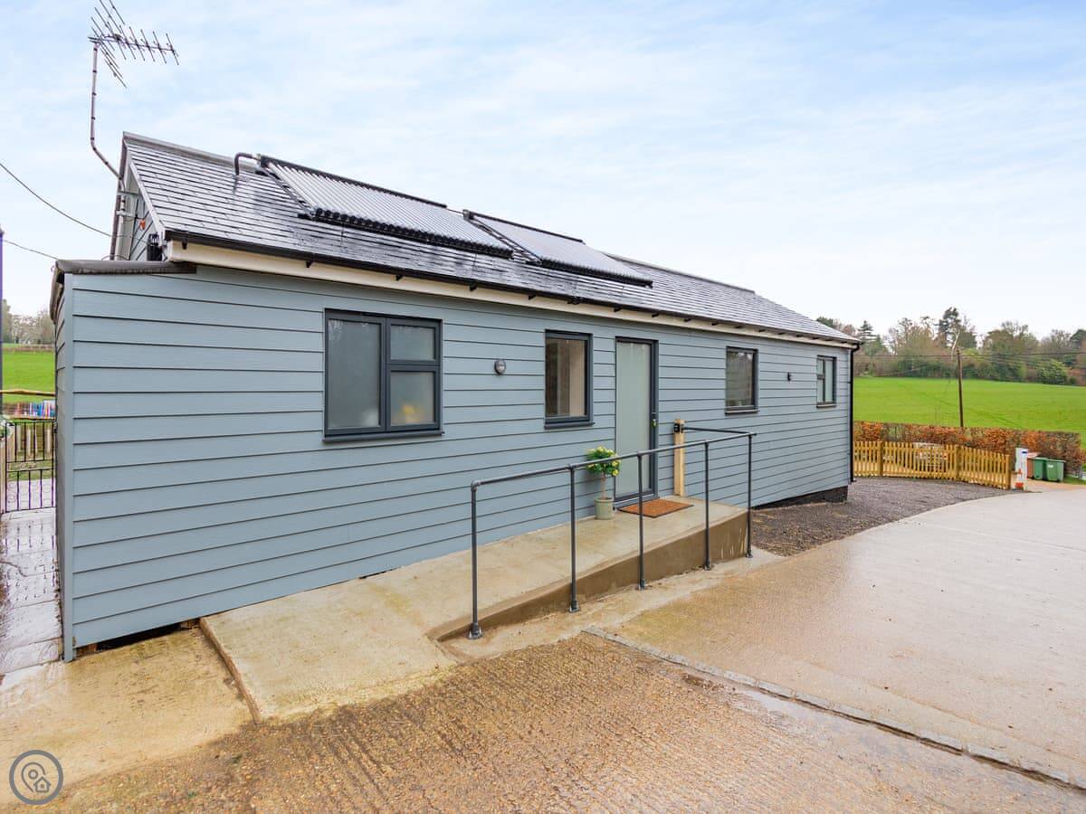 It sleeps four. Two bedrooms, both doubles. Both have their own shower room. Everything is on one level, so no stairs. There's a ramp to the front door.