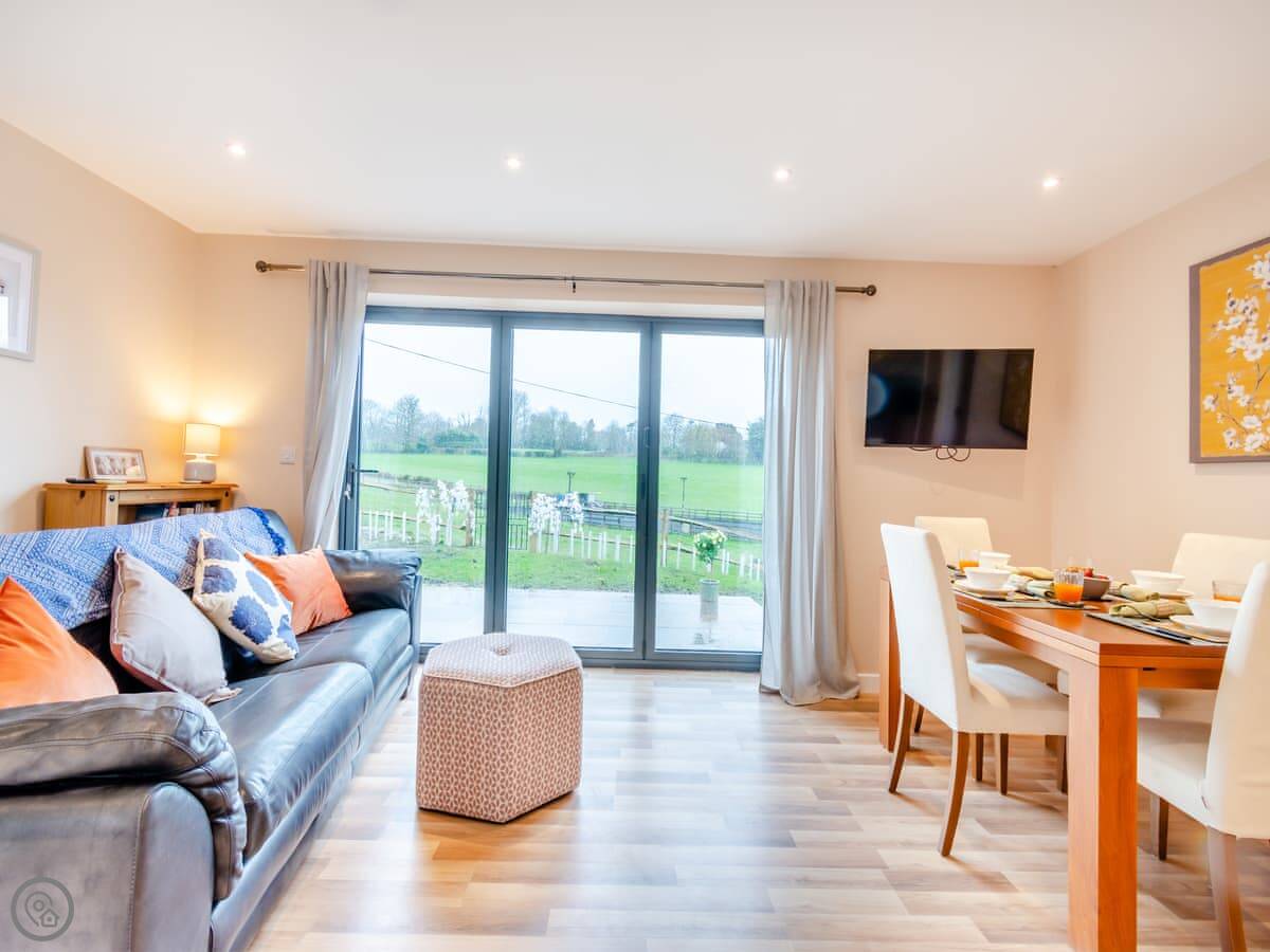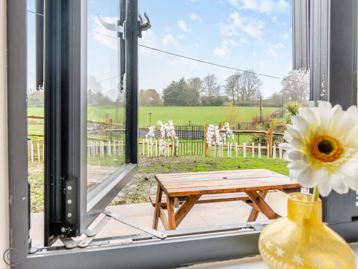 Inside, it's one big room for the kitchen, dining and sitting area. The big doors open straight onto the patio. You get the morning sun out there. There's a table, chairs, and a BBQ. It looks over a field, usually with our sheep in it.