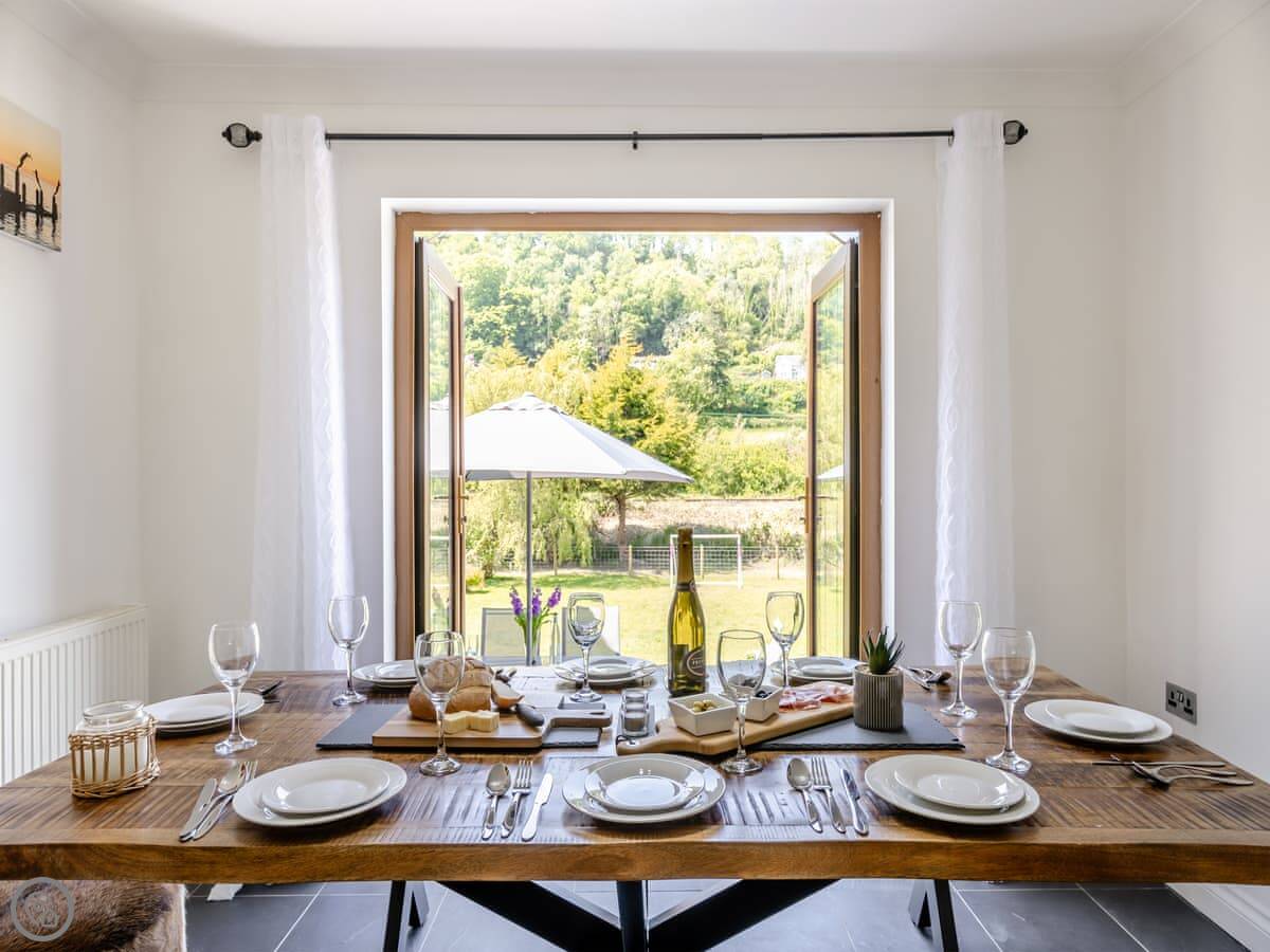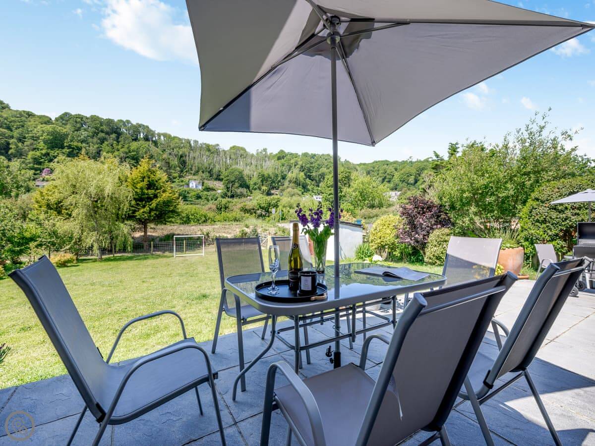 Outside, there's a patio with garden furniture and a barbecue. The view is over the valley. It's quiet. You're down a lane.