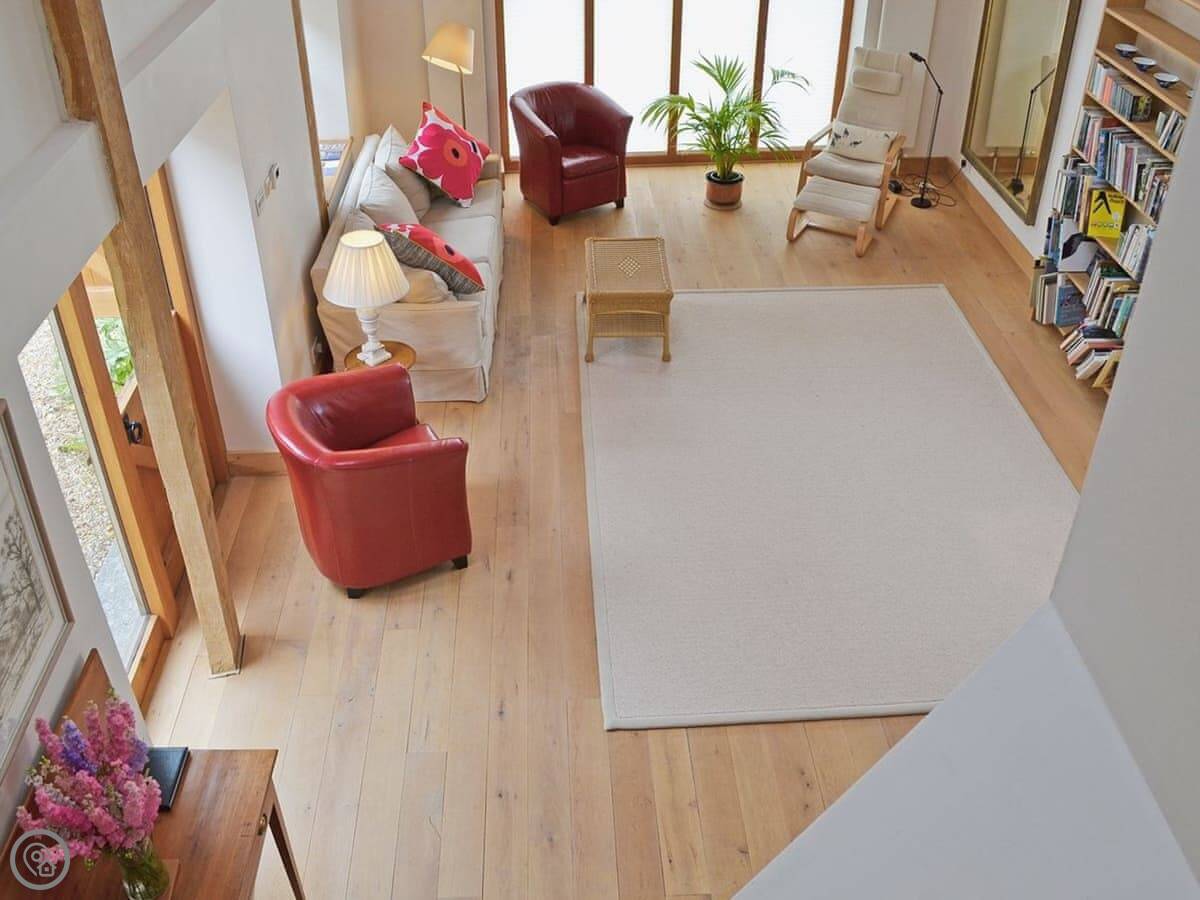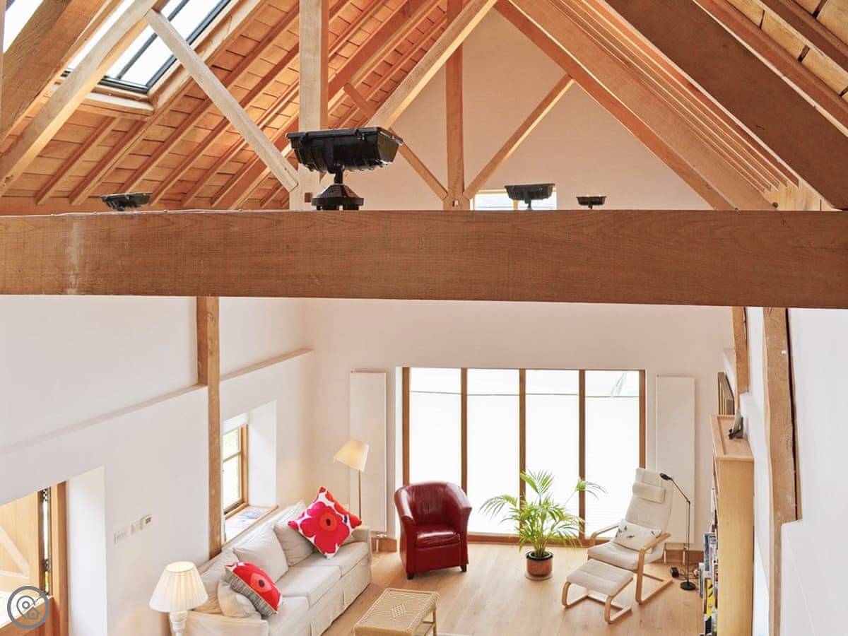 If you are looking for an unusual place to stay, this unique and quirky barn conversion could be for you. This former granary has been converted into a beautiful, stylish cottage with many original features. The spacious beamed living room has windows on three sides, allowing the light to flood in. With its vaulted beamed ceiling, oak floor and log-burning stove in a large stone fireplace, it is a warm and welcoming room. Equipped with a large, comfortable sofa and chairs, it’s a delightful place for friends and family to relax at the end of the day. There is a separate toilet that is accessed from the living room. The fully fitted kitchen has oak work tops, a Belfast sink and a plate rack. The twin bedroom is in the attic and has exposed brickwork and sloping ceilings. The quirky layout of the barn means you access the double bedroom and en-suite shower room via an external entrance, enhancing the charm of this unique cottage. The delightful, tranquil bedroom also has a vaulted ceiling and oak floor, along with a New England colonial bed and Japanese hot tub. The room also has French doors overlooking a small patio garden equipped with a rattan table and chairs.