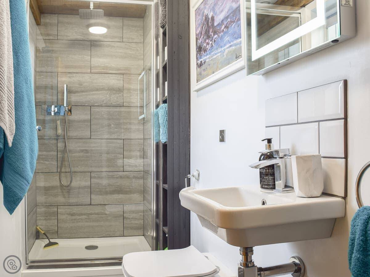 The main room is open-plan. There's a kitchen area, a sofa, and the bed. There's one shower room downstairs by the entrance. You get bedding and towels. There's no washing machine on site, so it's best for shorter breaks.