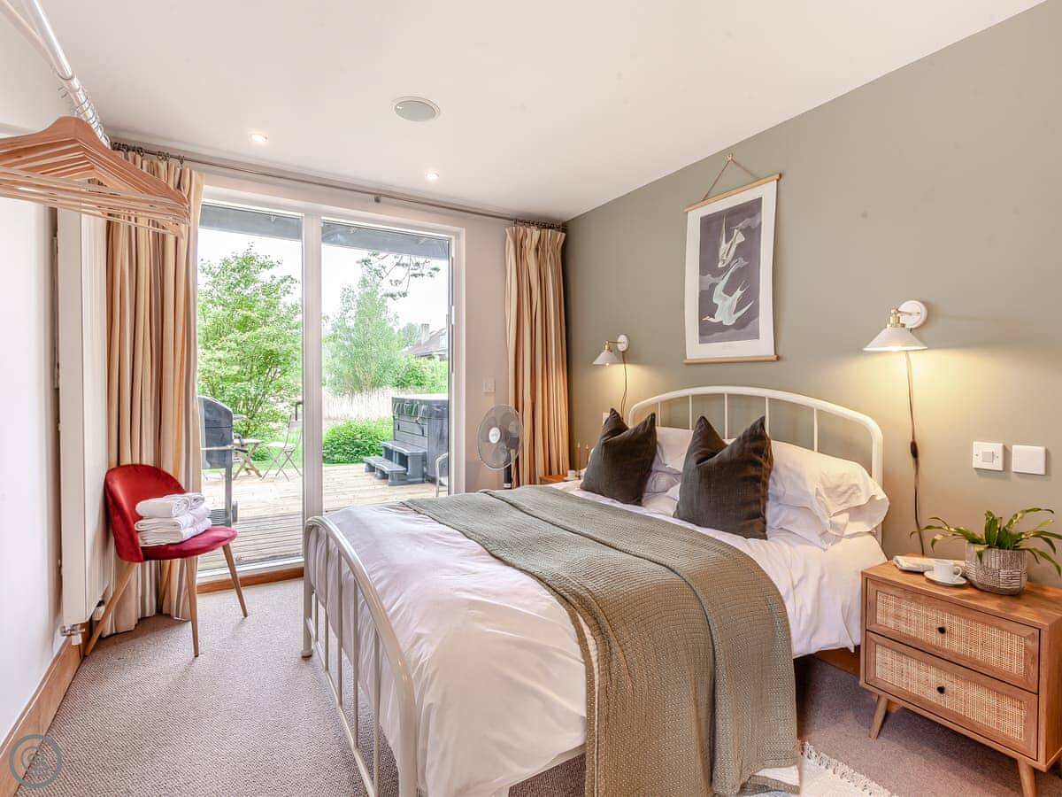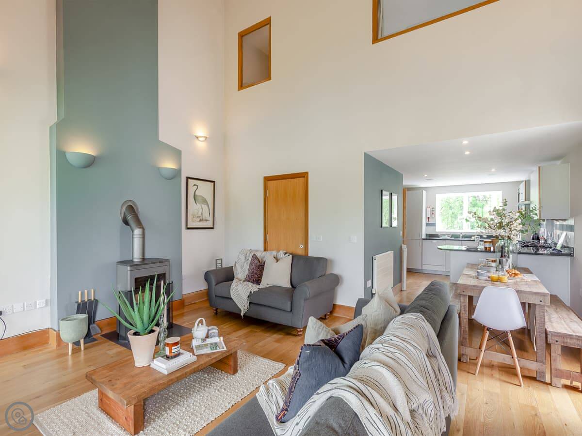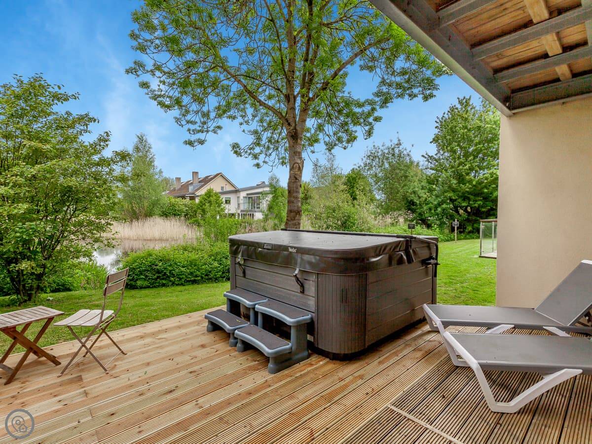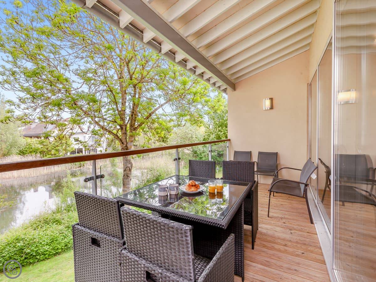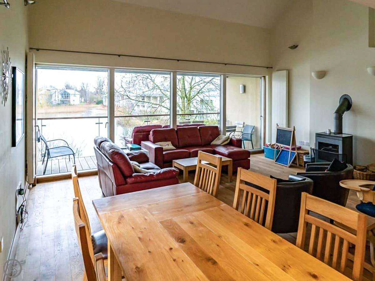 There are two terraces. One on the ground floor by the water, and the balcony upstairs. The wood burner works well for cooler evenings.