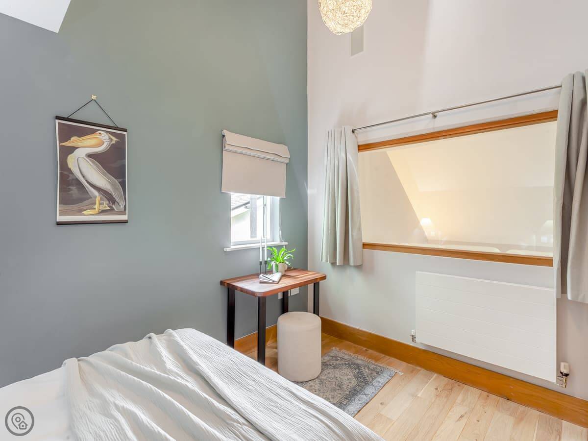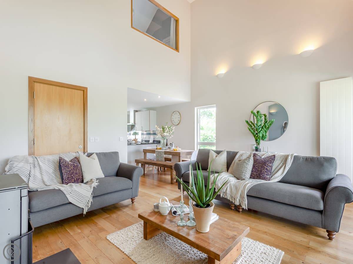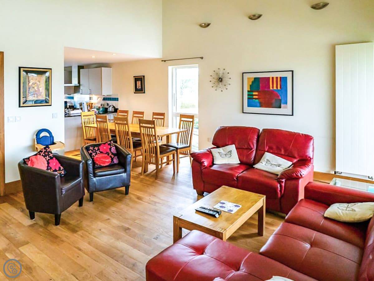 It sleeps eight people. Four bedrooms, three bathrooms. It's got a 5 Star rating, which means it's well finished and everything's in good order. It's spread over three floors. The main living area is on the middle floor. It's open plan with big windows and a balcony facing the lake. The stairs are fine, they're just normal house stairs.