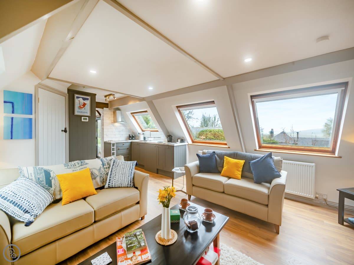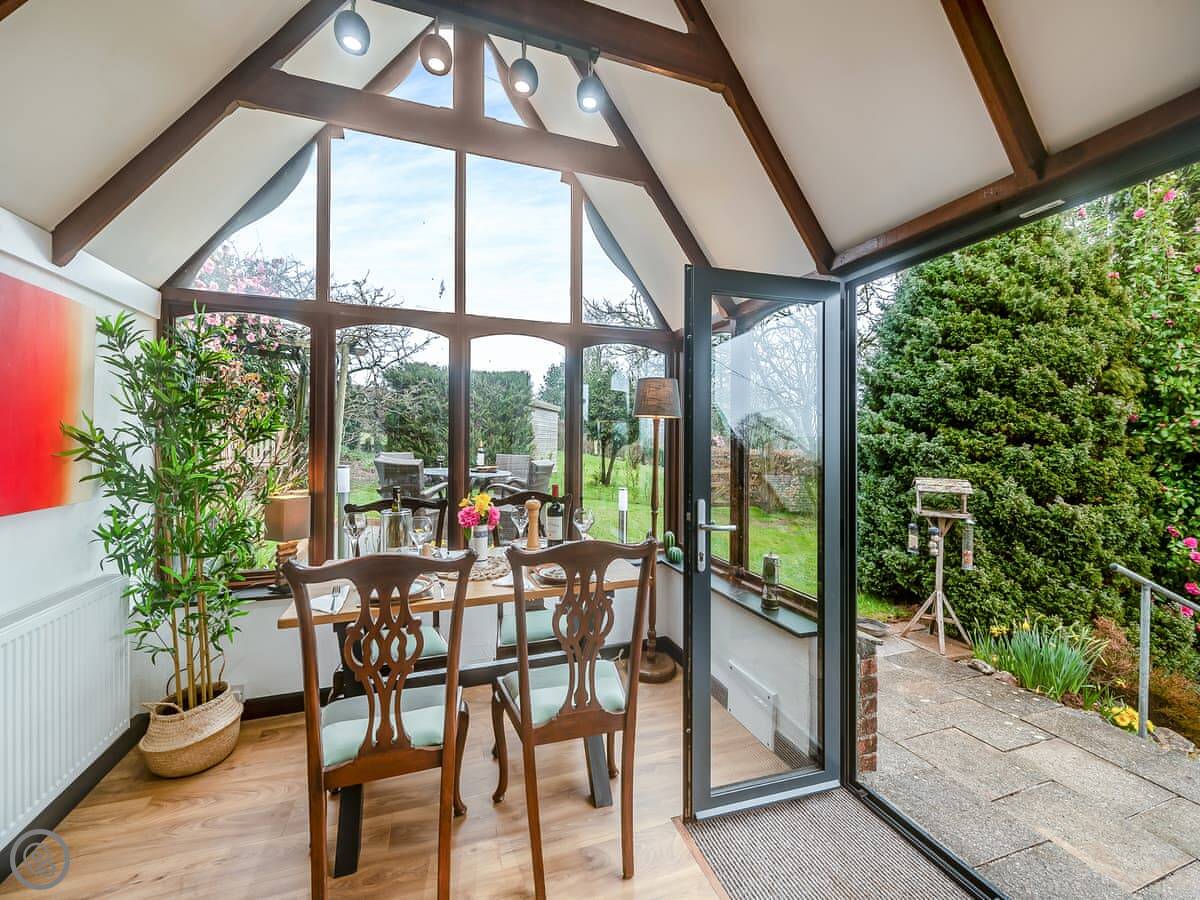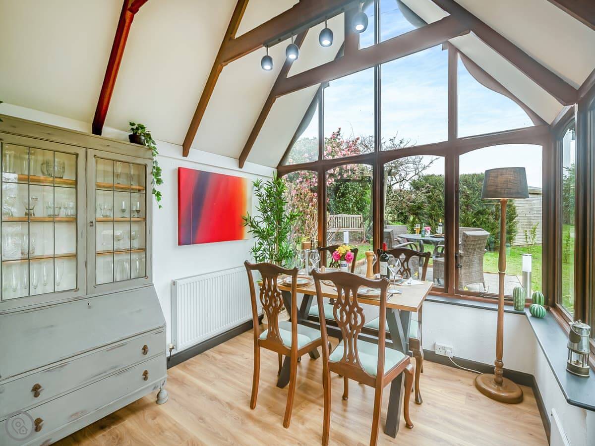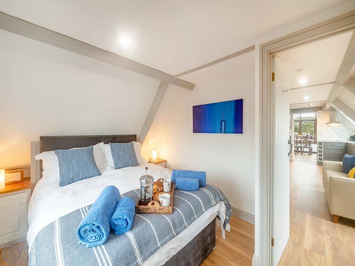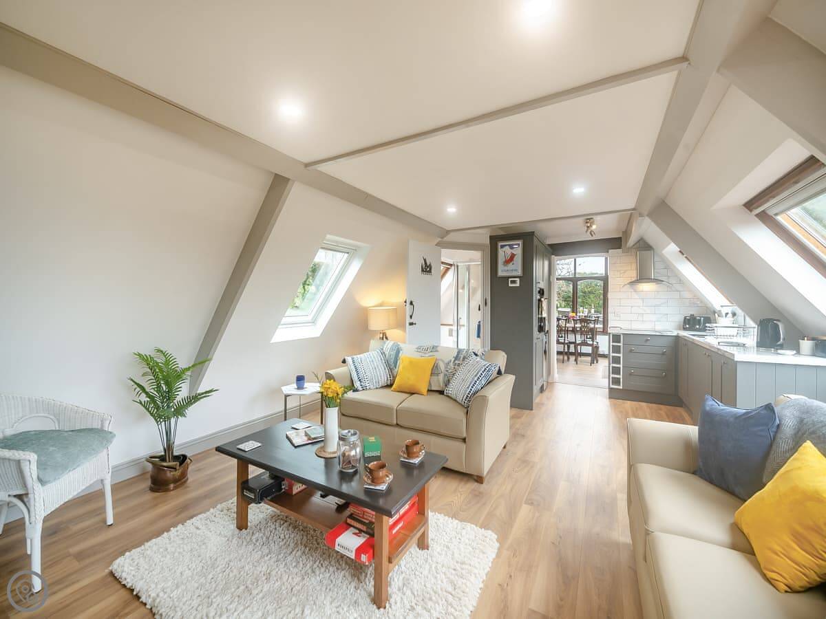 It's a first-floor apartment, accessed by steps from the drive, so not suitable if steps are a problem for you. It's light and private, up in the trees. The conservatory at the entrance is where you eat. The lounge is bright. The bedroom has a king-size bed.