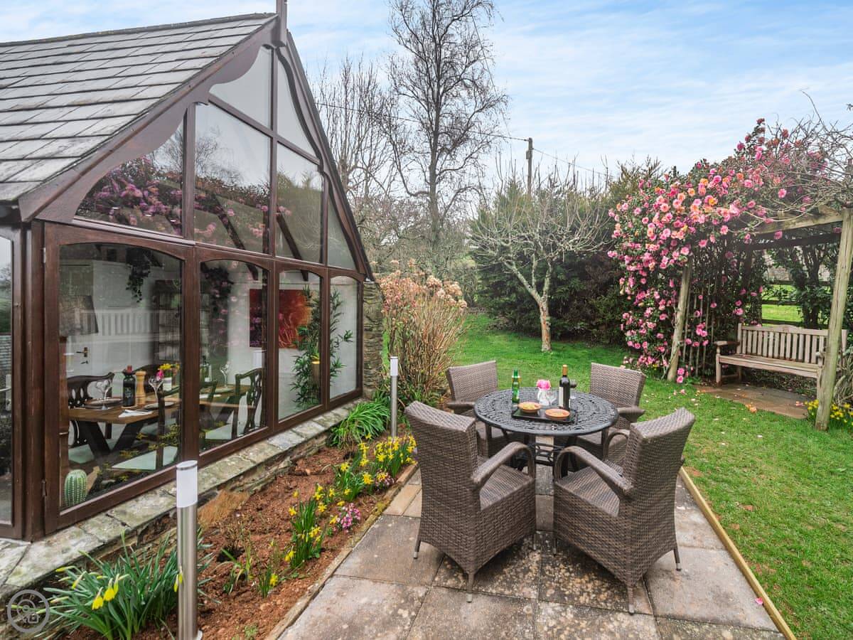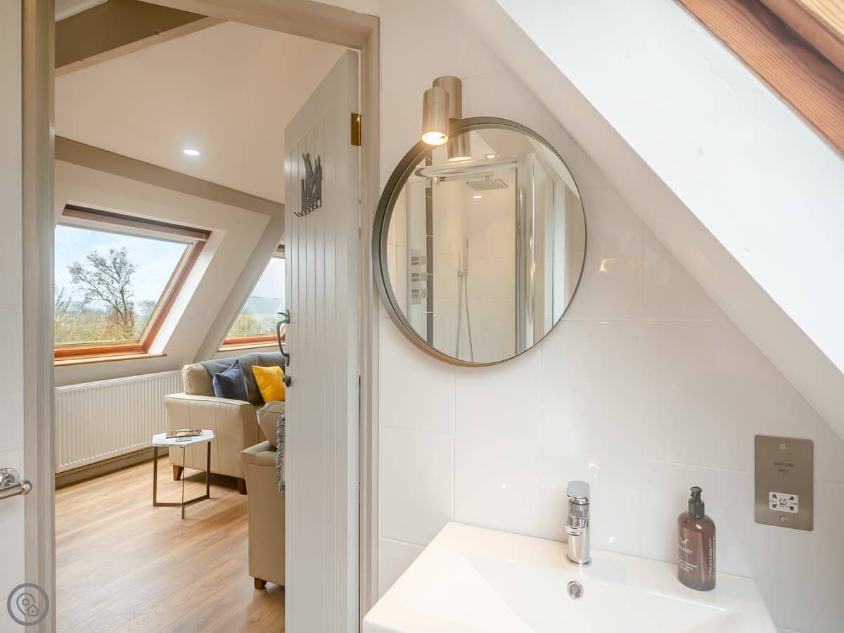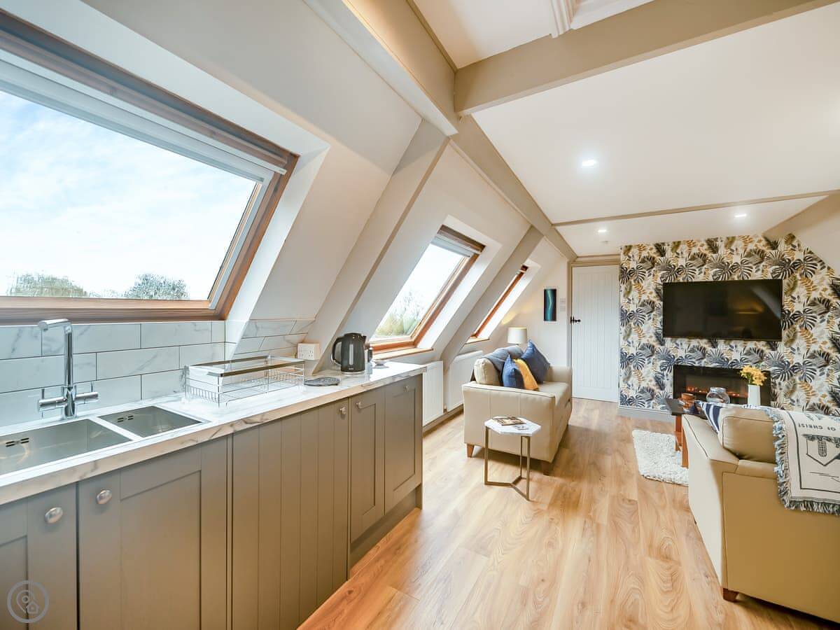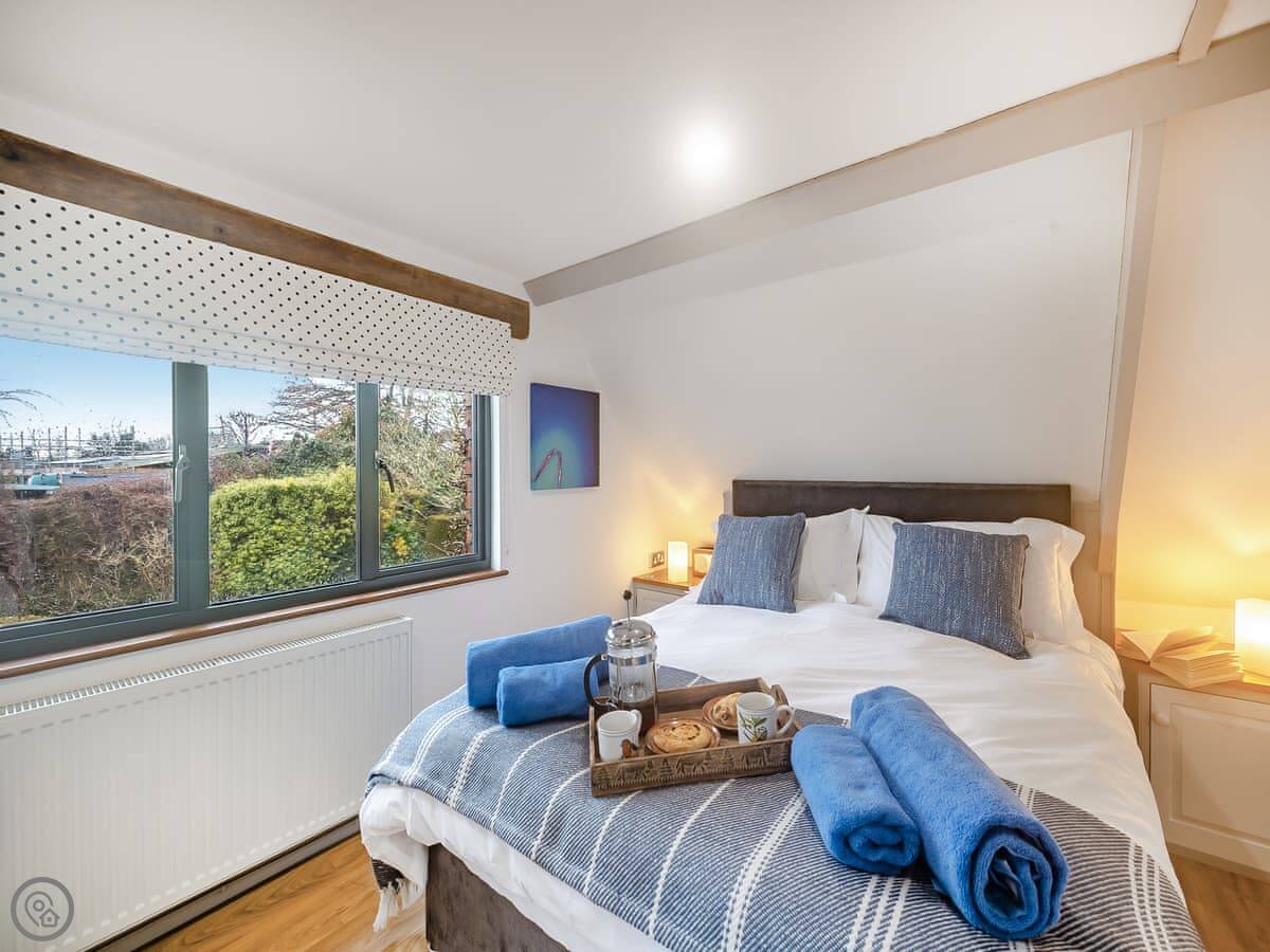 It's a first-floor apartment, accessed by steps from the drive, so not suitable if steps are a problem for you. It's light and private, up in the trees. The conservatory at the entrance is where you eat. The lounge is bright. The bedroom has a king-size bed.
