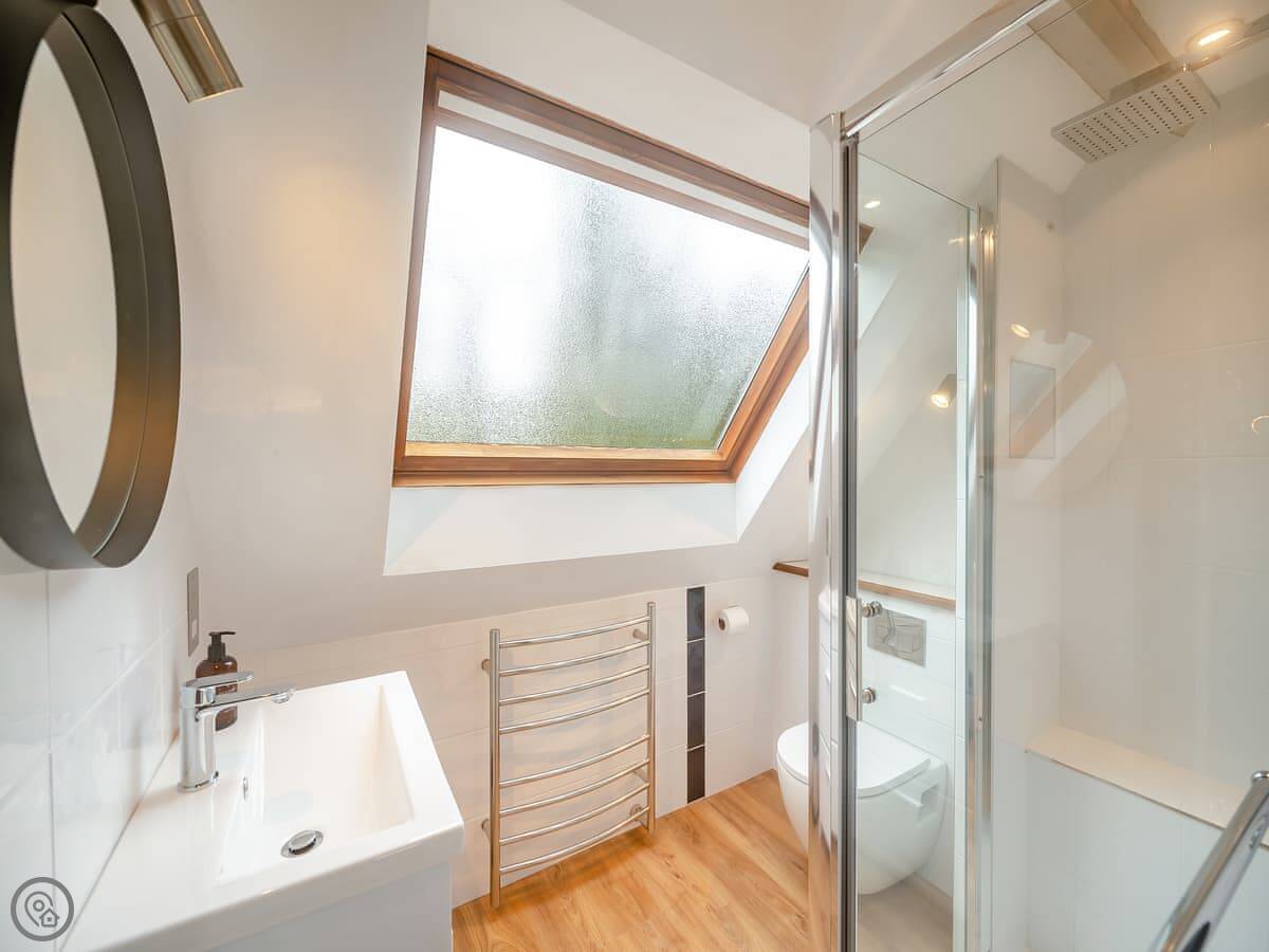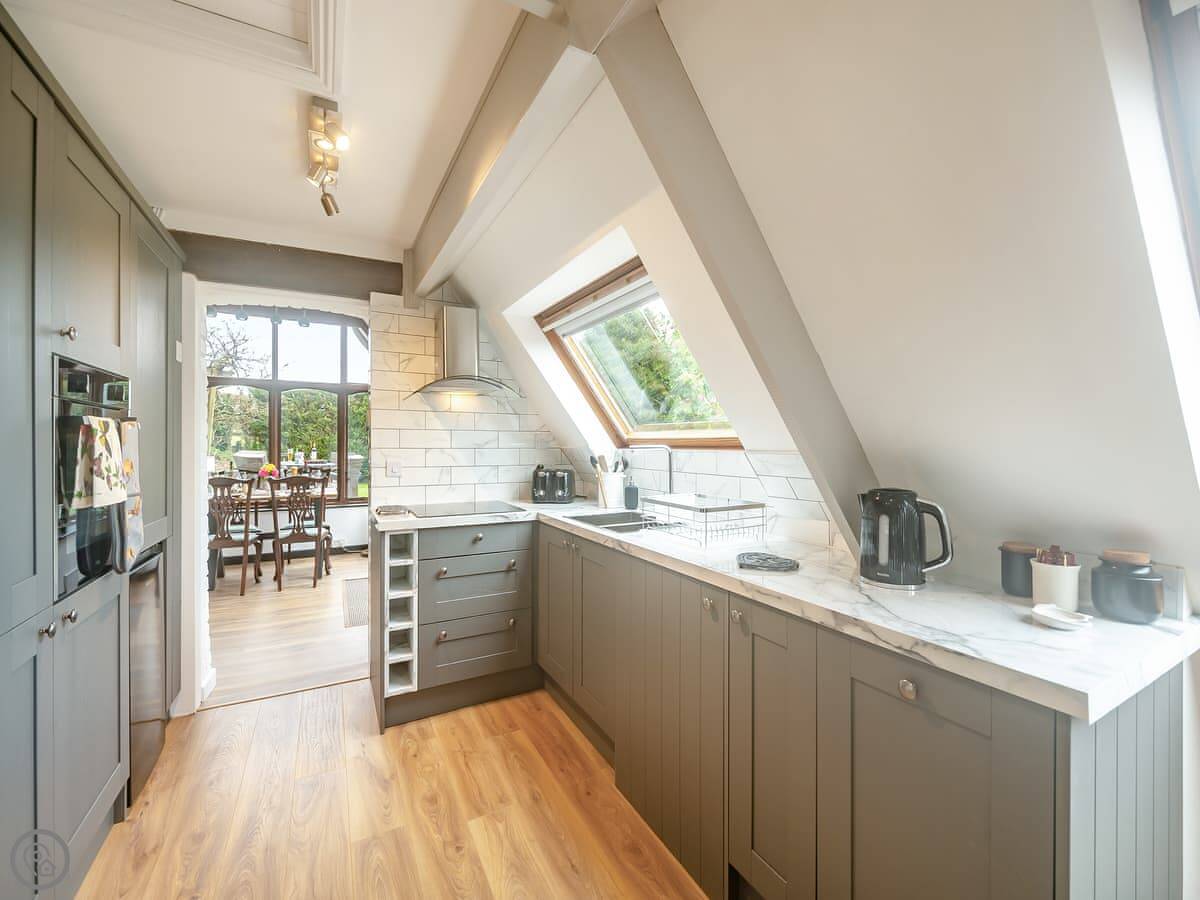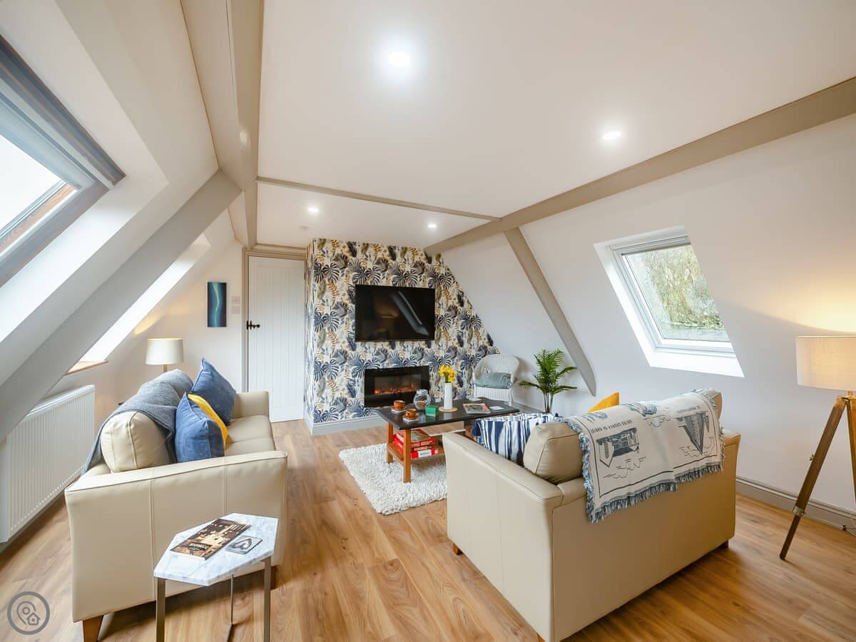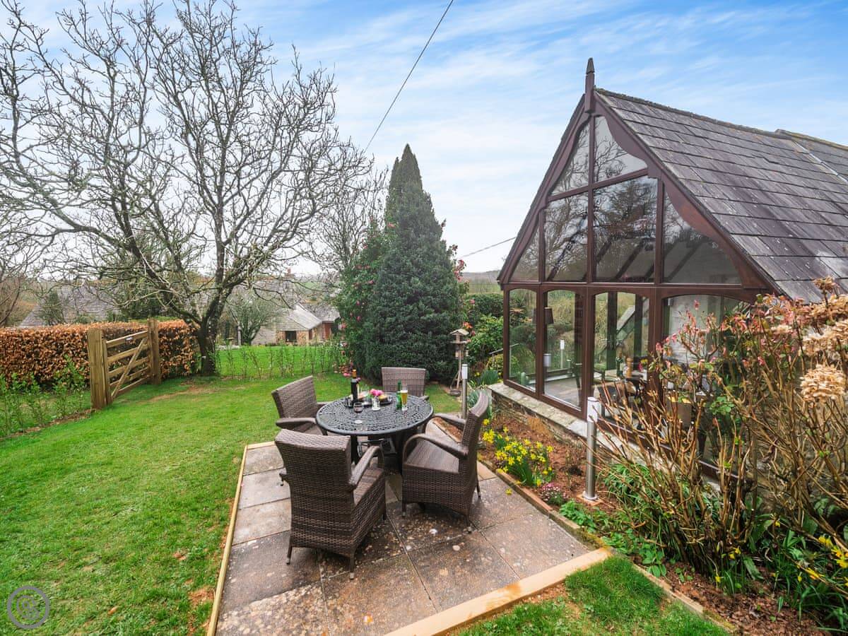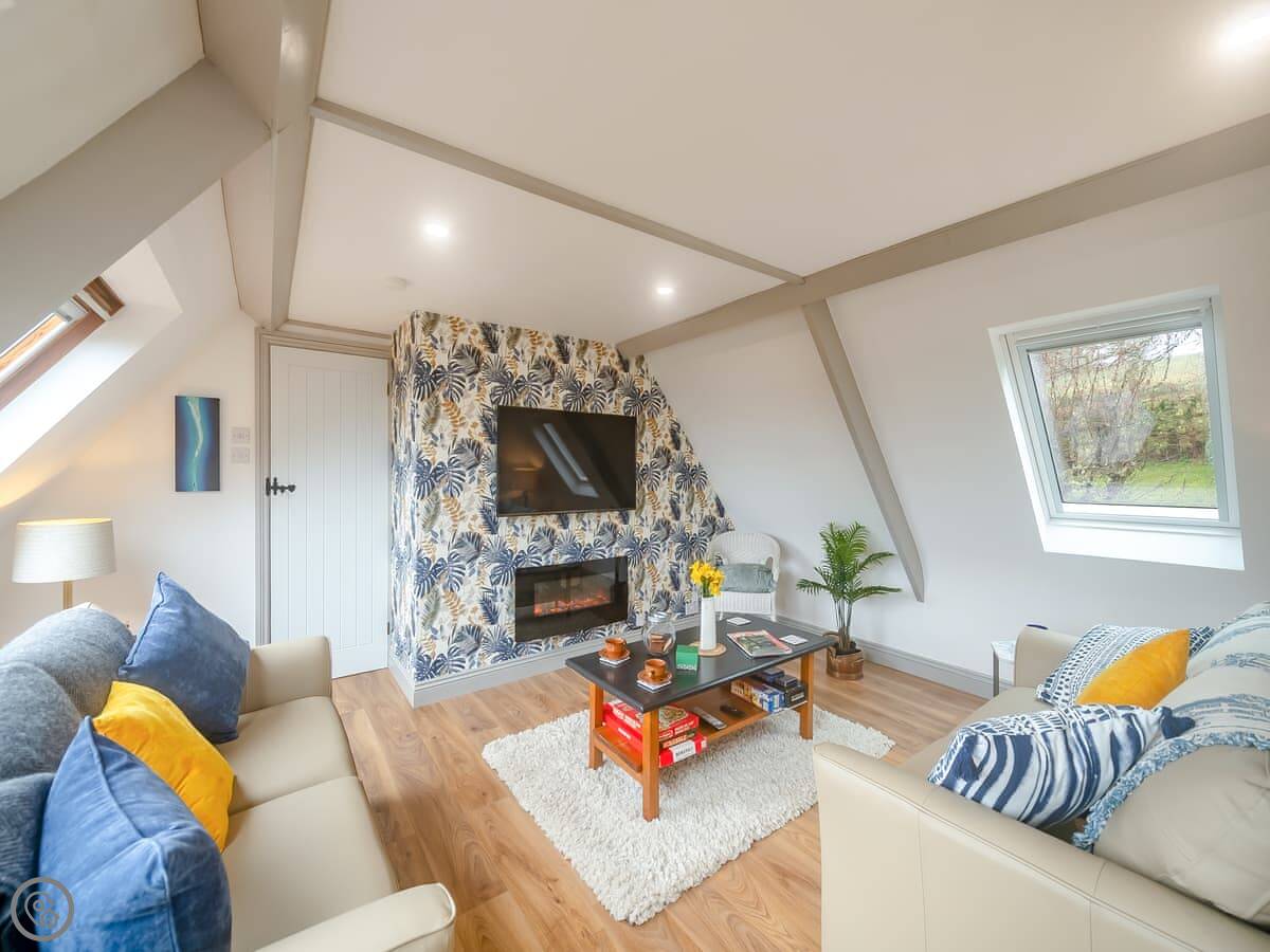 It's a first-floor apartment, accessed by steps from the drive, so not suitable if steps are a problem for you. It's light and private, up in the trees. The conservatory at the entrance is where you eat. The lounge is bright. The bedroom has a king-size bed.