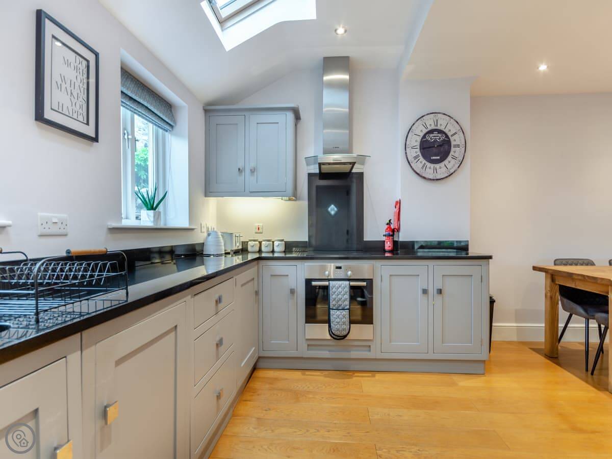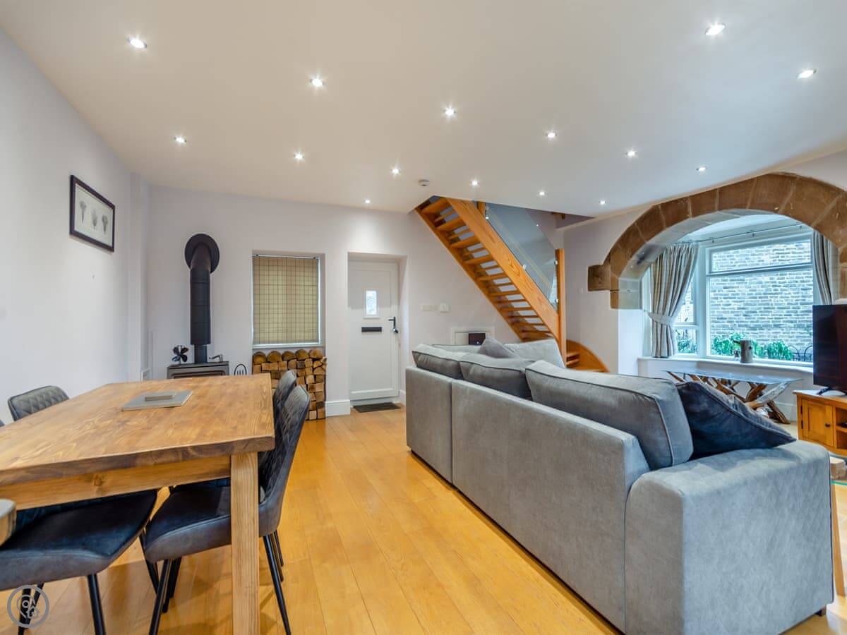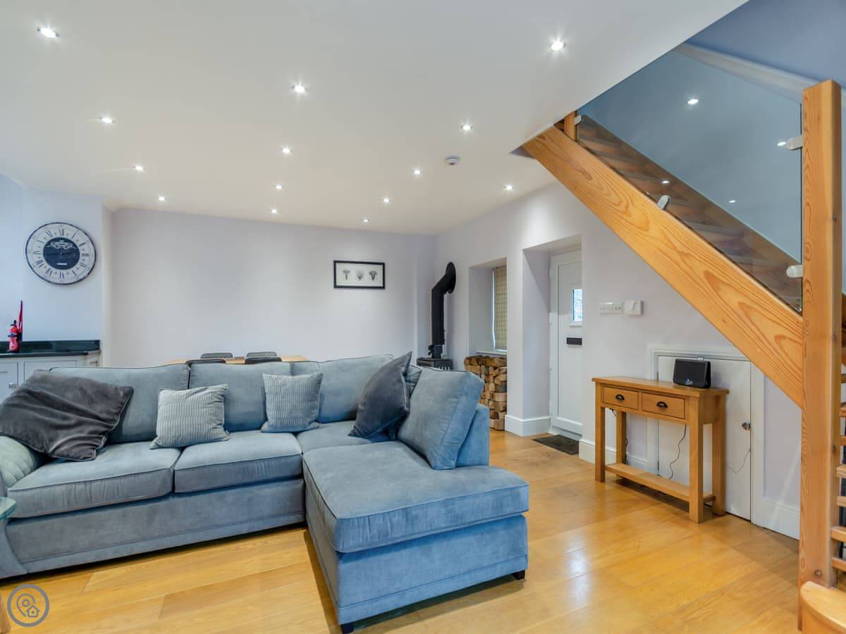 Downstairs is all open plan. Kitchen, dining table, and living area in one room. There's a wood burner. The stairs are normal. The ceilings are low upstairs in places because of the beams. Just mind your head.