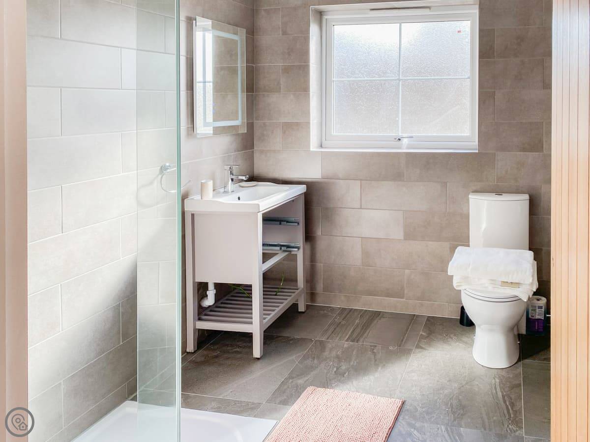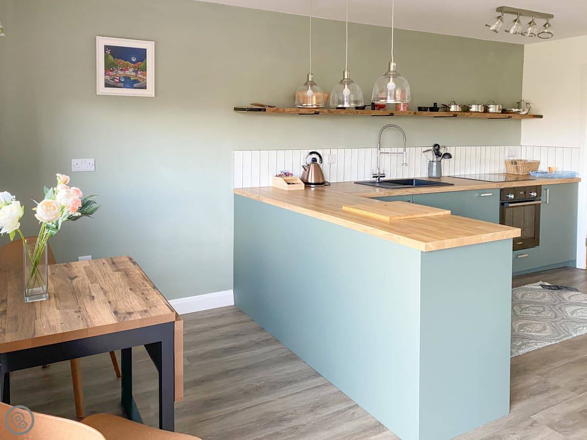 Inside, it's open plan. The kitchen has a dishwasher and there's a table for two. The sofa faces the TV and the doors to the garden. The shower is electric, which means it's always got good pressure. We include all bedding and towels. There's Wi-Fi and a cot if you need it.