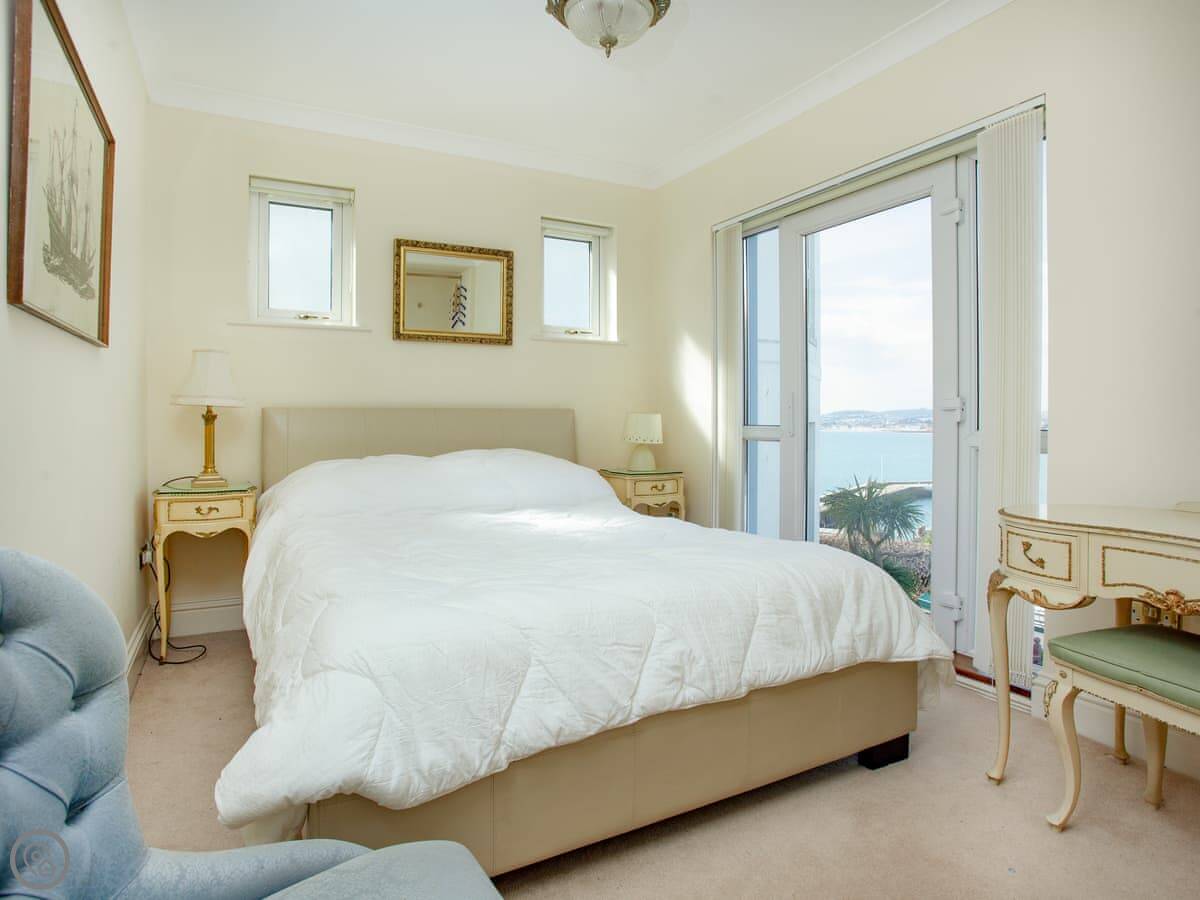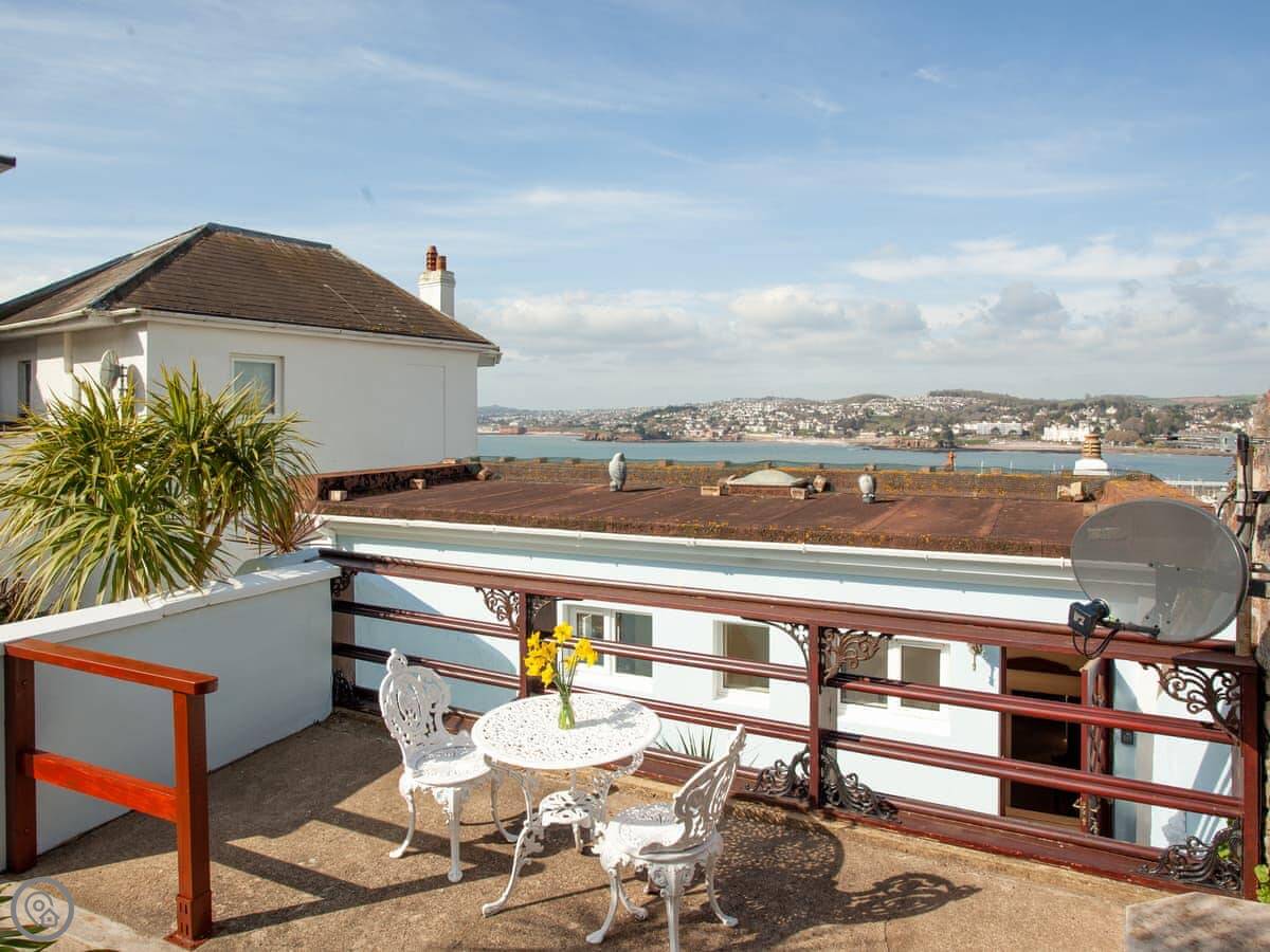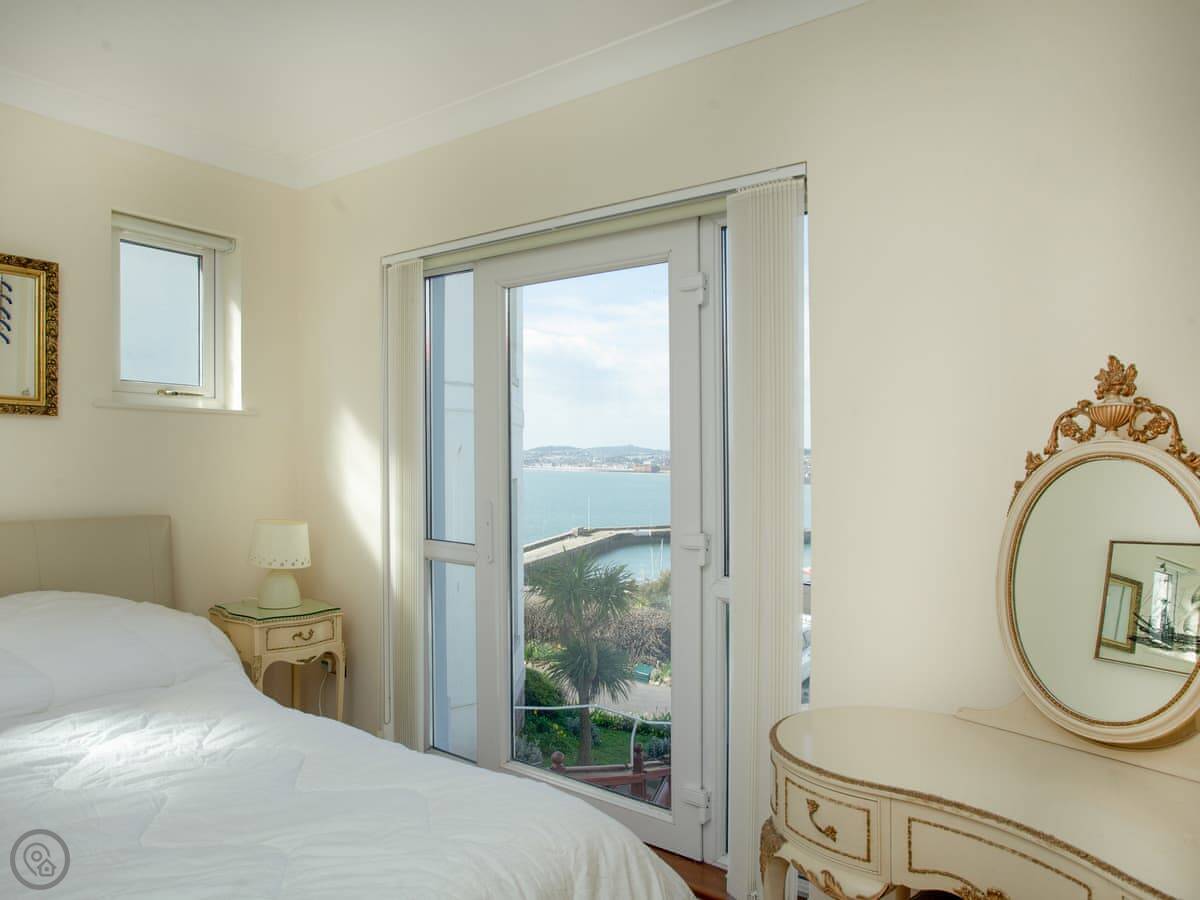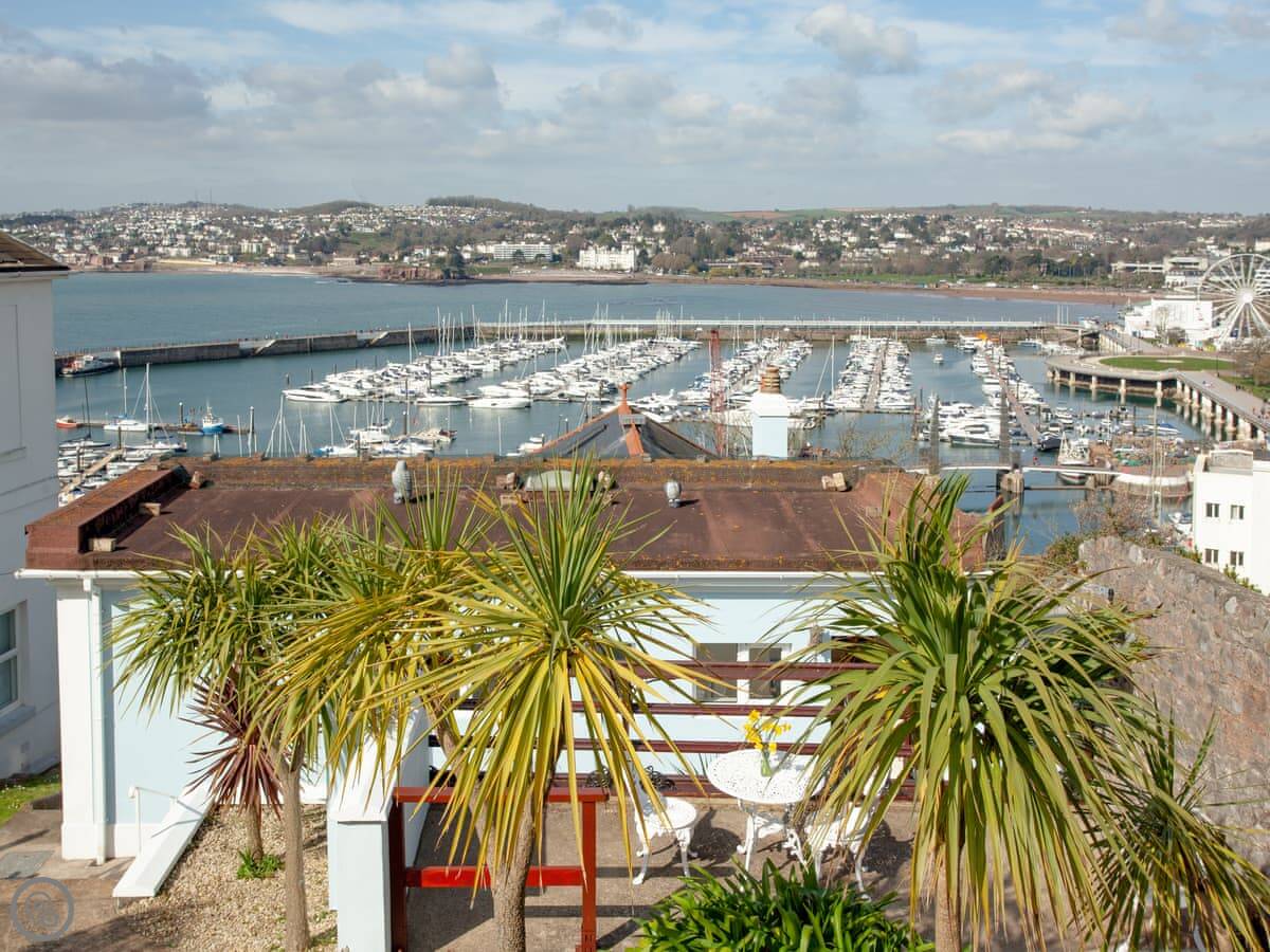 Riviera View is a one-bedroom flat on the first and second floor of a small building. It sleeps two. The main thing is the view. You get a full, wide view of Tor Bay from the main living space and the bedroom. It's on a quiet road, but you can walk to the harbour in five minutes and into town centre in about ten.